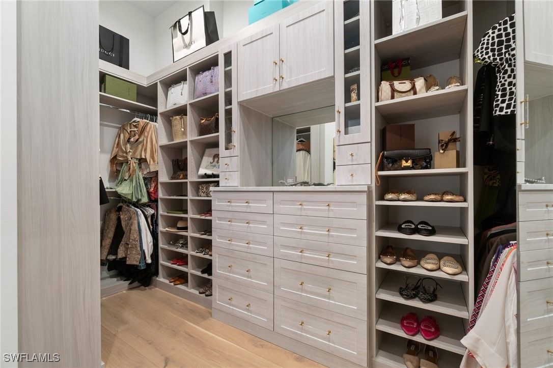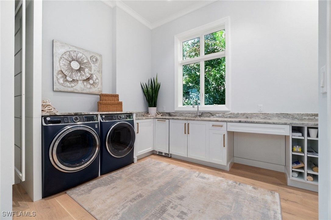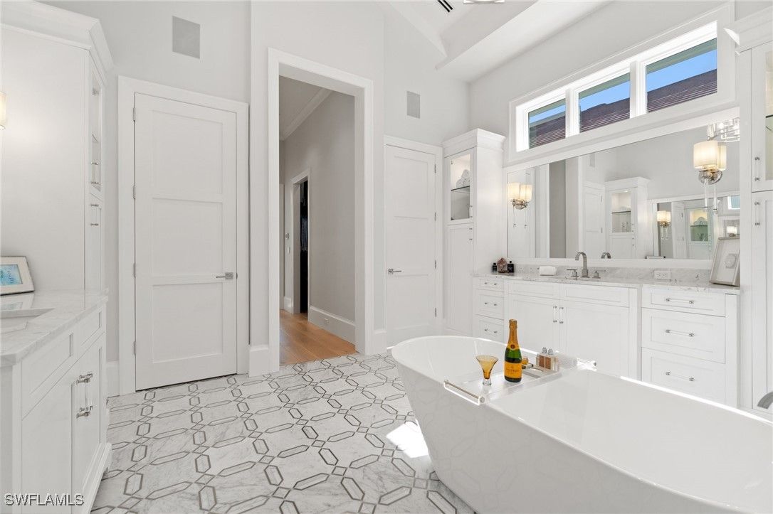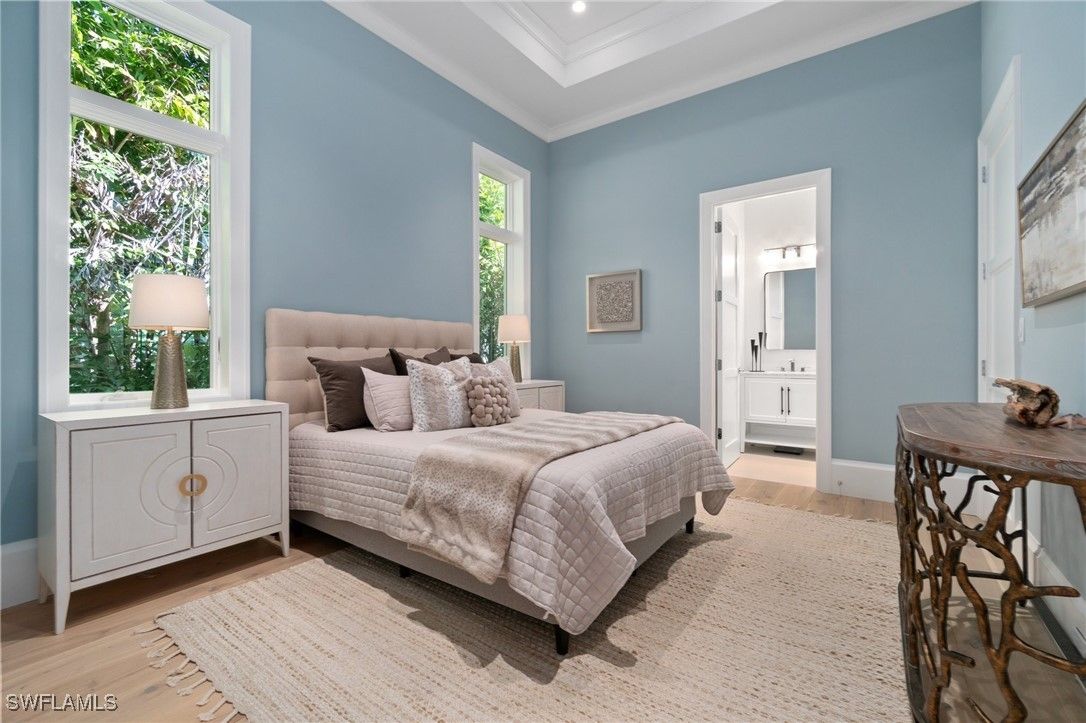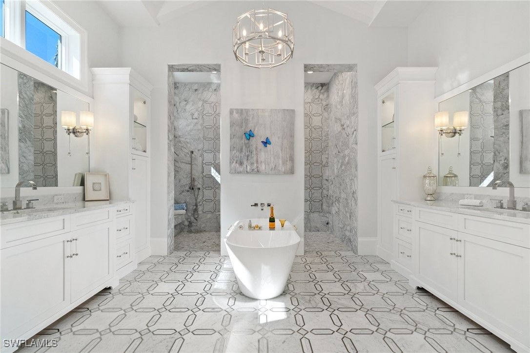 Modern Coastal Luxury Meets Biophilic Design in The Moorings — Minutes from Downtown Naples and the Beach Experience refined coastal living in this custom Borelli-built estate home that masterfully blends modern elegance, natural elements, and indoor-outdoor living. This 4,314-square-foot single-story residence was designed with a meticulous focus on biophilic design, seamlessly connecting the beauty of nature with sophisticated architectural detail. From the moment you enter through the grand double entry doors, your eyes are drawn through the open-concept living area to an outdoor entertainment oasis featuring a stunning 6-foot driftwood sculpture suspended over a sunken circular lounge with a fire pit and swim-up bar, flowing effortlessly into a resort-style pool and spa. Inside, you’ll find washed oak hardwood floors, soaring detailed ceilings, and luxury finishes throughout. The open-concept floor plan connects a chef-inspired kitchen—featuring Taj Mahal quartzite countertops, Sub-Zero and Wolf appliances, custom wood cabinetry, and a walnut wet bar—to elegant living and dining spaces perfect for both intimate gatherings and grand entertaining. This 4-bedroom + office + media OR 5 bedroom + den/flex room residence includes five full designer bathrooms. The media room with its custom built-in bar creates a stylish retreat for movies or game nights. The primary suite is a true sanctuary, offering dual custom walk-in closets, a soaking tub, oversized walk-in shower with dual shower heads, and two private water closets. Designed for the Naples lifestyle, the outdoor living area extends over 650 sq. ft. of covered space and includes a summer kitchen with grill and Green Egg station, electric roll-down screens, outdoor shower, and a fully fenced backyard surrounded by mature tropical landscaping. The southeast rear exposure ensures ideal sunshine over the pool during winter months. Additional upgrades include: • Crestron smart home automation • Generator (on order) • Integrated security and sound system • Two tankless water heaters • Electric roll down hurricane shutters • Split three-car garage with epoxy floors Located just minutes from 5th Avenue South, 3rd Street South, and Naples’ white sand beaches, this home offers private beach access through the optional Moorings Beach Park Association. Enjoy an unparalleled Naples lifestyle—morning walks on the beach, afternoons by the pool, and evenings dining in the heart of downtown. Whether you’re seeking a second home in Naples or planning a full-time relocation from the Midwest or Northeast, this residence delivers the perfect balance of sophistication, comfort, and coastal serenity.