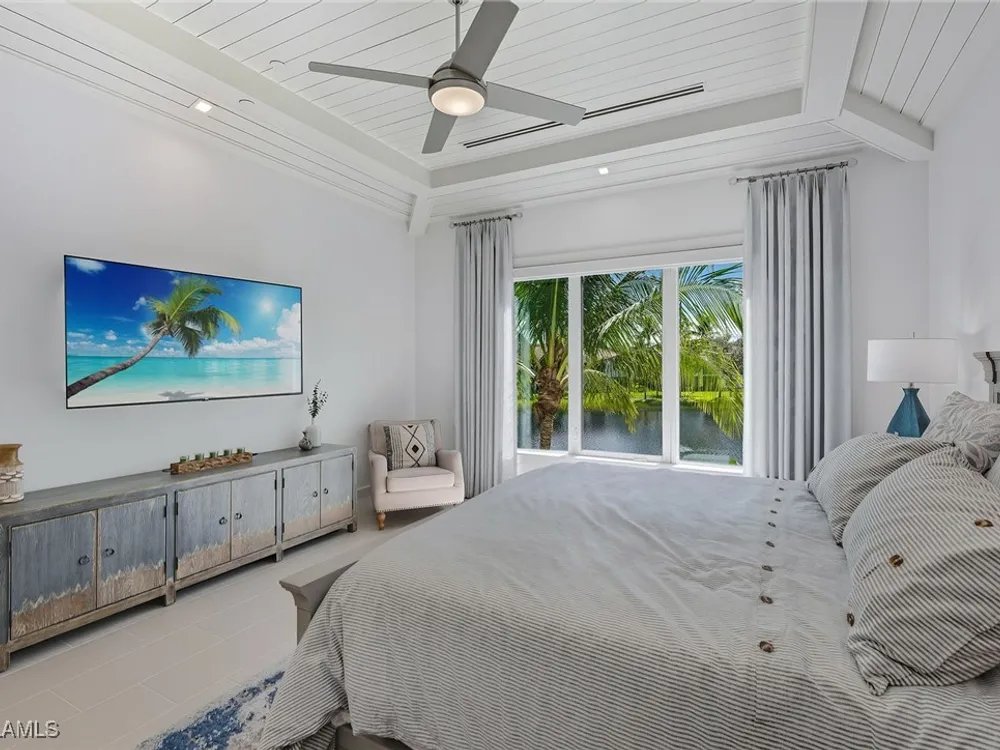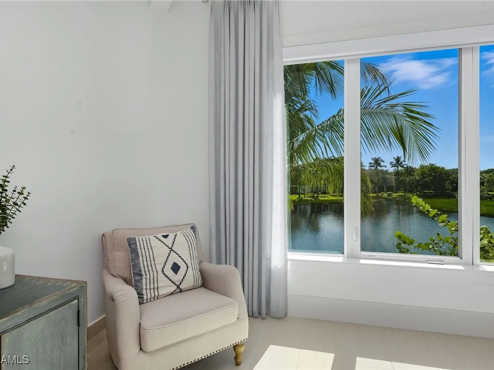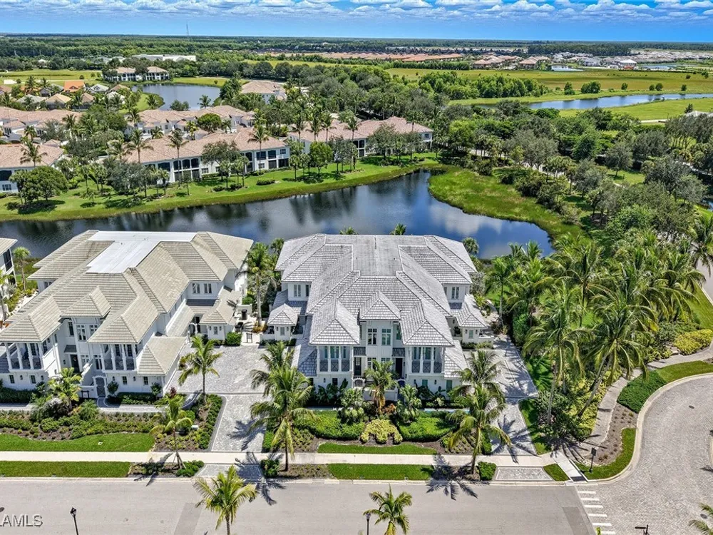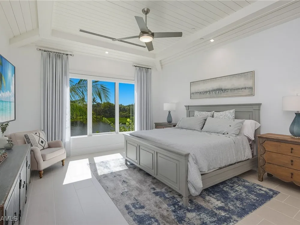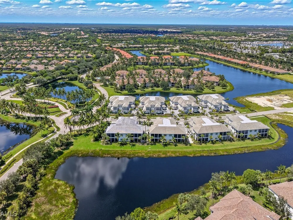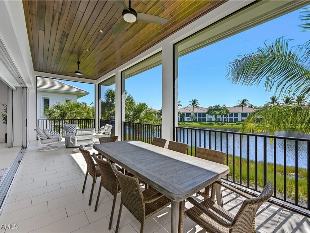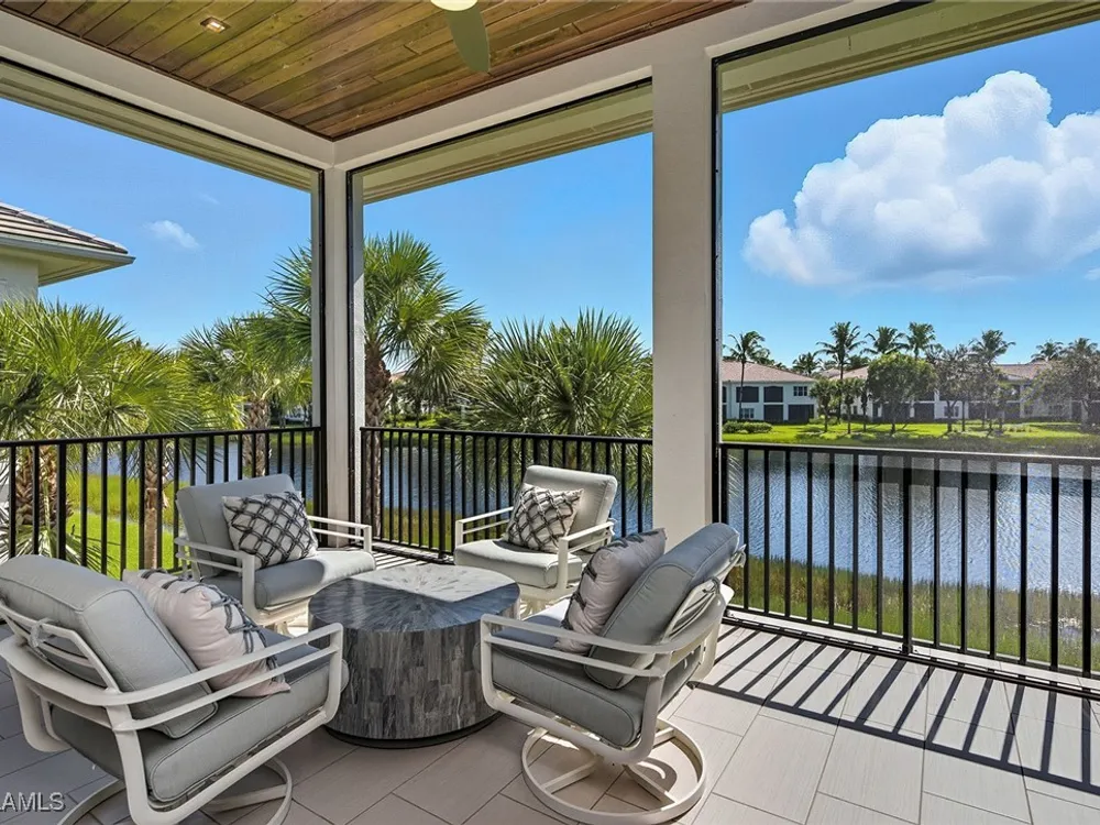 Discover tranquil lake and lush palm views from this beautifully furnished, light and bright Magnolia floorplan residence, quality built in 2020 by Gulf Bay Homes in the exclusive village of Dorado at Fiddler’s Creek. With eastern exposure for gorgeous sunrises and a design that lives like a single-family home, this second-floor retreat offers three bedrooms plus a den, three-and-a-half baths, and a spacious two-car garage. The popular layout blends sophistication and comfort, enhanced by soaring volume ceilings, dramatic architectural details, and seamless indoor-outdoor living. A wood staircase with stainless accent rods leads to the impressive main living area, where 35” x 11” porcelain tile floors, recessed LED lighting, and custom ceilings set the tone. The great room exceeds expectations with a vaulted ceiling featuring shiplap and coffered accents, ceiling speakers, and water views through sliding doors with remote-controlled electric shades. The adjacent dining area includes a built-in dry bar with cabinetry and counter space, perfect for entertaining. The chef’s kitchen boasts white cabinetry with glass-front uppers, in-cabinet and under-cabinet lighting, quartz counters, and a glass-tile backsplash. A full suite of Bosch stainless appliances includes a French-door refrigerator with freezer drawer, wall microwave, natural gas cooktop with hood vent, wall oven with convection, and dishwasher. An island with pendant lighting and bar seating, plus a pantry, completes the space, which flows effortlessly into the living and dining areas. The owner’s suite is a serene retreat with coffered ceilings, stunning water views, and a spa-like en-suite bath offering dual quartz vanities with makeup counter, a frameless walk-in shower with bench, and an expansive walk-in closet with custom wood shelving. Two guest bedrooms each feature ensuite baths, one with French doors leading to a private tiled balcony. The den, accented with tray ceilings and crown molding, provides the ideal setting for a home office or study. Additional highlights include a powder bath, a well-appointed laundry room with quartz counters, and a two-car garage with epoxy flooring and a 240V outlet for EV charger. The screened lanai offers covered outdoor living with tile flooring, a tray ceiling with wood plank, ceiling fans, and recessed LED lighting, all overlooking tranquil lake views. With impact glass windows and doors throughout, this home combines elegance with peace of mind. Residents enjoy world-class amenities including a resort-style pool, spa services, fitness center with classes, tennis and pickleball program with TEN new pickleball courts, bocce, an extensive activity calendar, and casual and fine dining. Miles of sidewalks wind through the lushly landscaped community for walking, bicycling, and running, while optional immediate memberships for golf, beach, and marina elevate the SWFL lifestyle-including a recently renovated golf course and brand-new golf clubhouse.