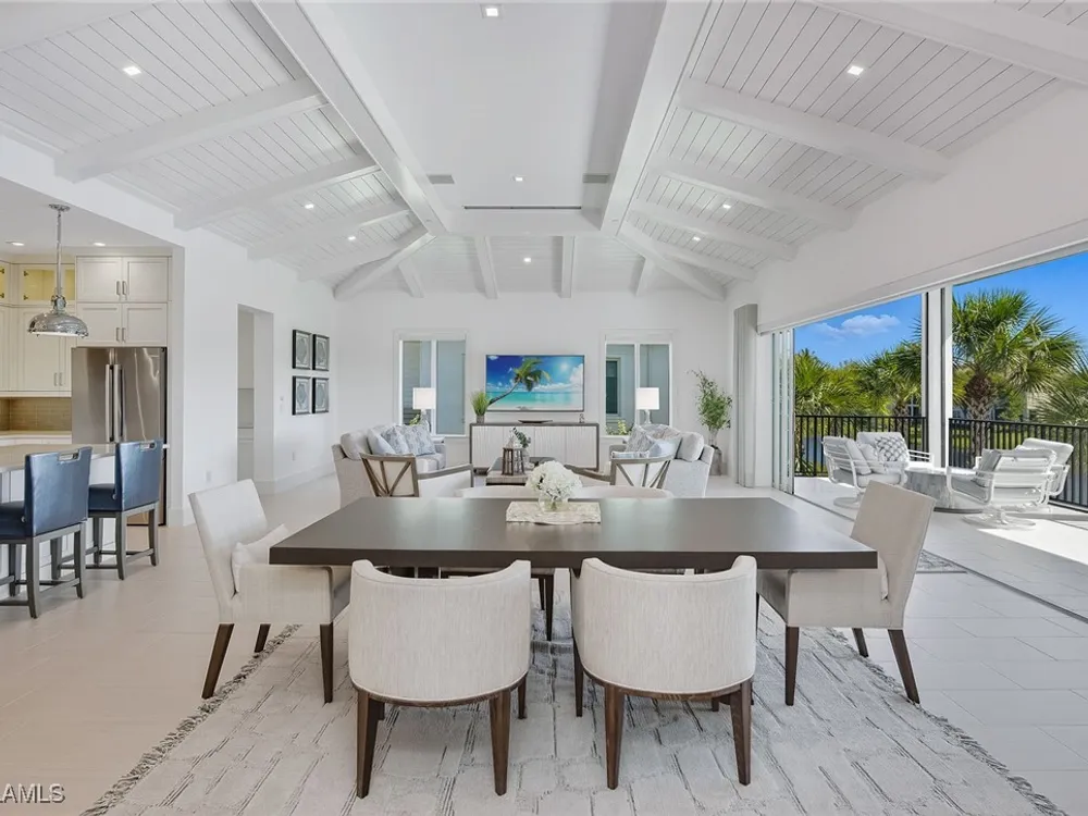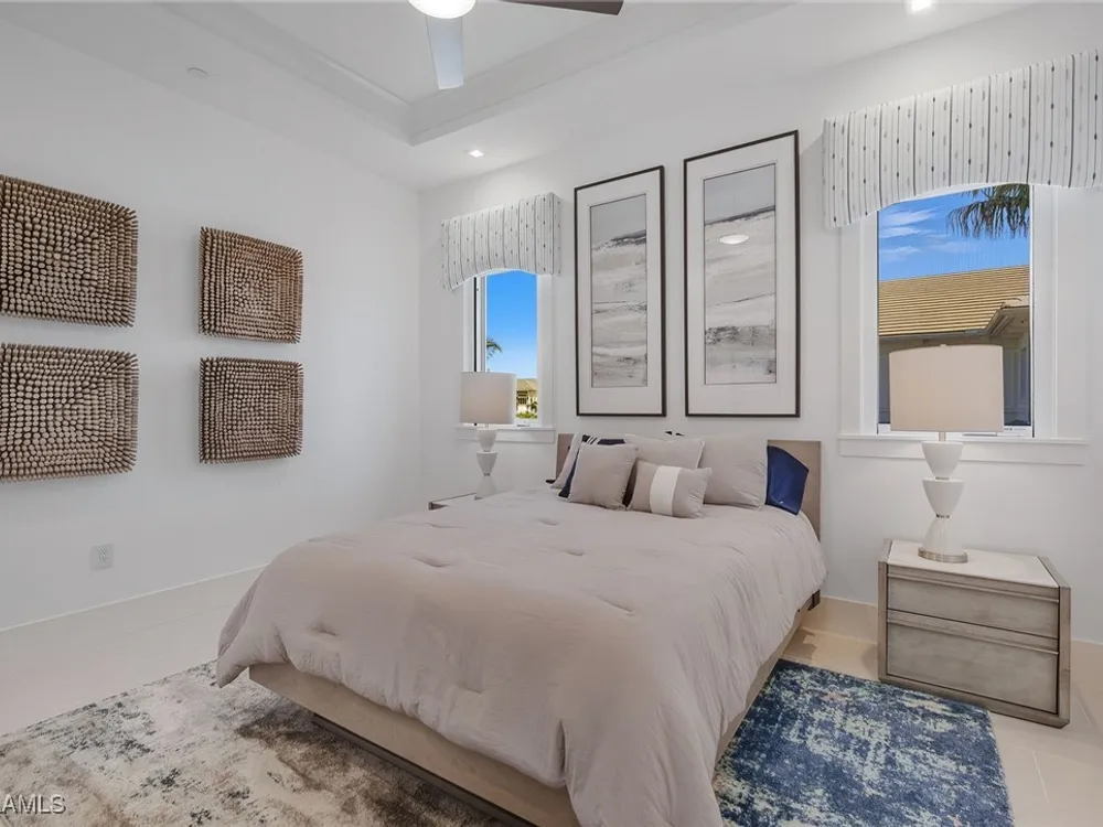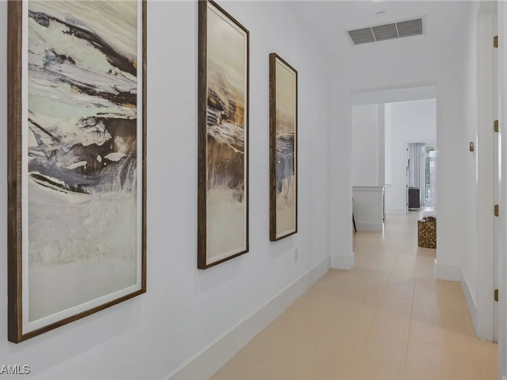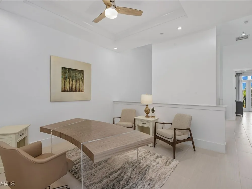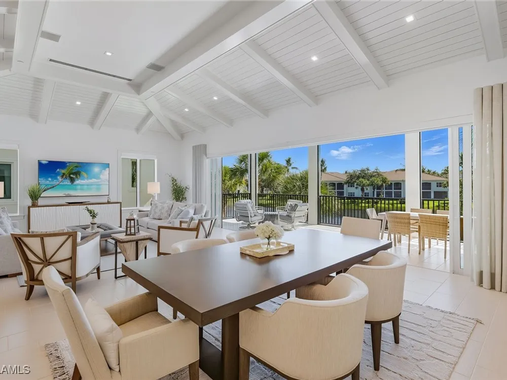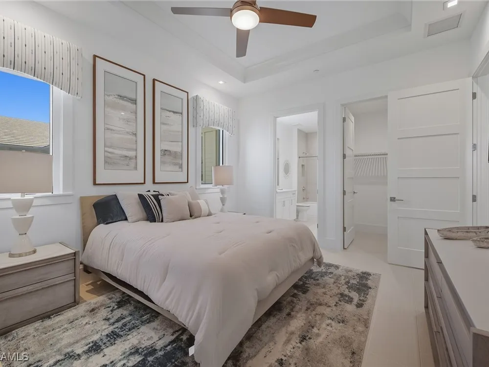 Discover tranquil lake and lush palm views from this beautifully furnished, light and bright Magnolia floorplan residence, quality built in 2020 by Gulf Bay Homes in the exclusive village of Dorado at Fiddler’s Creek. With eastern exposure for gorgeous sunrises and a design that lives like a single-family home, this second-floor retreat offers three bedrooms plus a den, three-and-a-half baths, and a spacious two-car garage. The popular layout blends sophistication and comfort, enhanced by soaring volume ceilings, dramatic architectural details, and seamless indoor-outdoor living. A wood staircase with stainless accent rods leads to the impressive main living area, where 35” x 11” porcelain tile floors, recessed LED lighting, and custom ceilings set the tone. The great room exceeds expectations with a vaulted ceiling featuring shiplap and coffered accents, ceiling speakers, and water views through sliding doors with remote-controlled electric shades. The adjacent dining area includes a built-in dry bar with cabinetry and counter space, perfect for entertaining. The chef’s kitchen boasts white cabinetry with glass-front uppers, in-cabinet and under-cabinet lighting, quartz counters, and a glass-tile backsplash. A full suite of Bosch stainless appliances includes a French-door refrigerator with freezer drawer, wall microwave, natural gas cooktop with hood vent, wall oven with convection, and dishwasher. An island with pendant lighting and bar seating, plus a pantry, completes the space, which flows effortlessly into the living and dining areas. The owner’s suite is a serene retreat with coffered ceilings, stunning water views, and a spa-like en-suite bath offering dual quartz vanities with makeup counter, a frameless walk-in shower with bench, and an expansive walk-in closet with custom wood shelving. Two guest bedrooms each feature ensuite baths, one with French doors leading to a private tiled balcony. The den, accented with tray ceilings and crown molding, provides the ideal setting for a home office or study. Additional highlights include a powder bath, a well-appointed laundry room with quartz counters, and a two-car garage with epoxy flooring and a 240V outlet for EV charger. The screened lanai offers covered outdoor living with tile flooring, a tray ceiling with wood plank, ceiling fans, and recessed LED lighting, all overlooking tranquil lake views. With impact glass windows and doors throughout, this home combines elegance with peace of mind. Residents enjoy world-class amenities including a resort-style pool, spa services, fitness center with classes, tennis and pickleball program with TEN new pickleball courts, bocce, an extensive activity calendar, and casual and fine dining. Miles of sidewalks wind through the lushly landscaped community for walking, bicycling, and running, while optional immediate memberships for golf, beach, and marina elevate the SWFL lifestyle-including a recently renovated golf course and brand-new golf clubhouse.