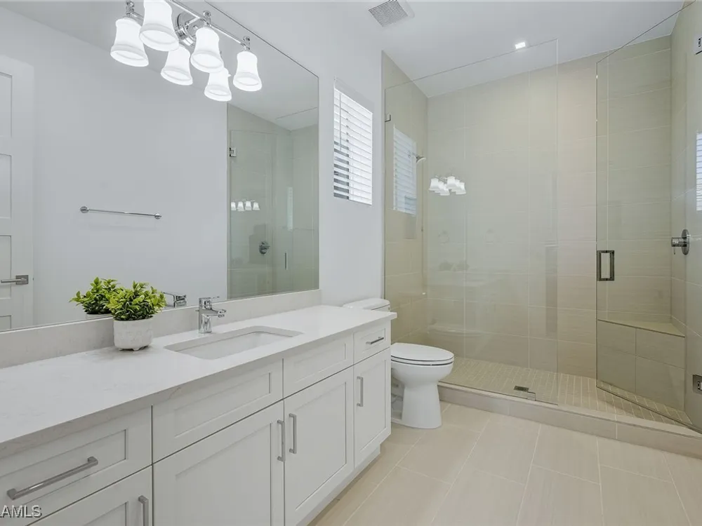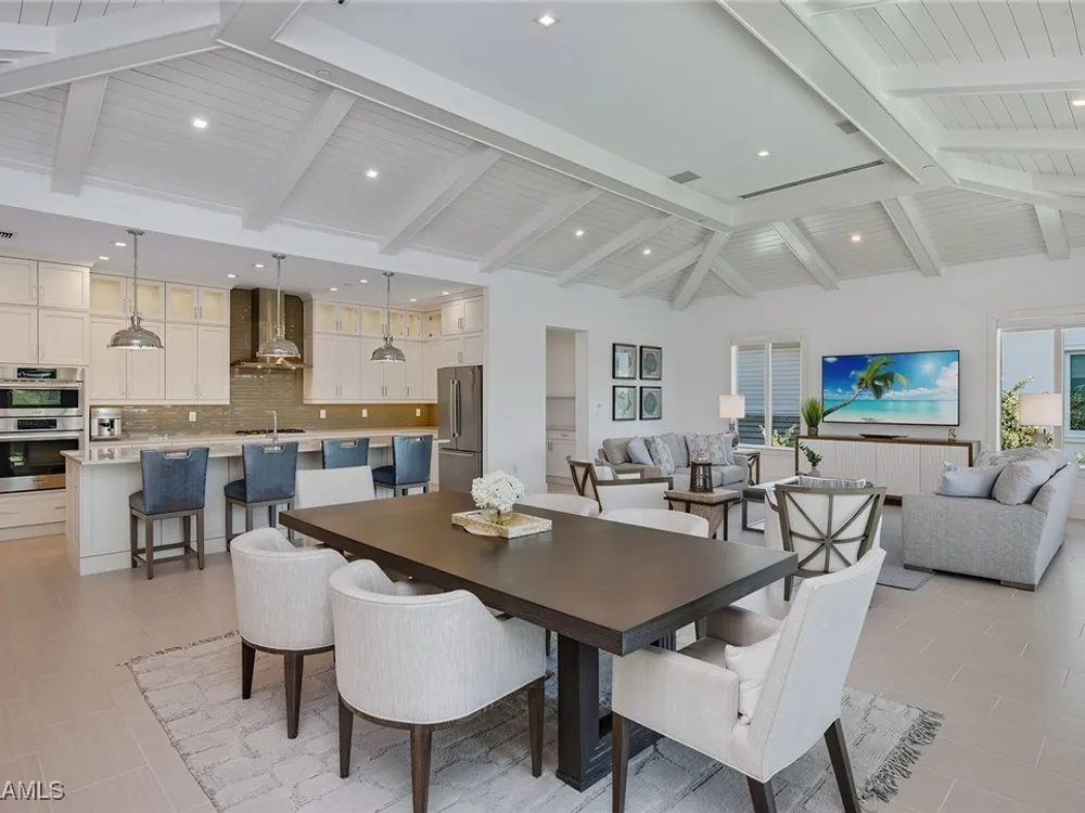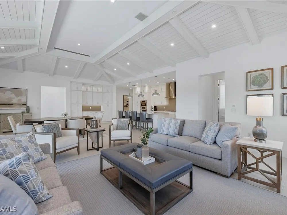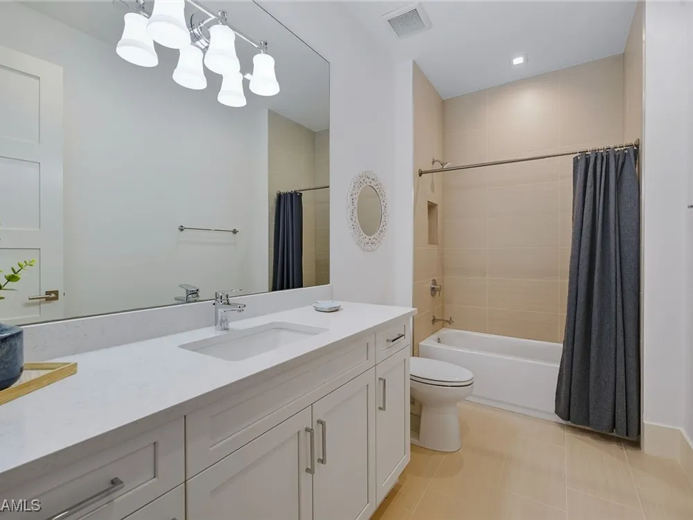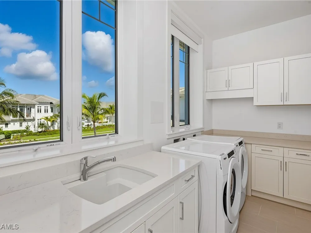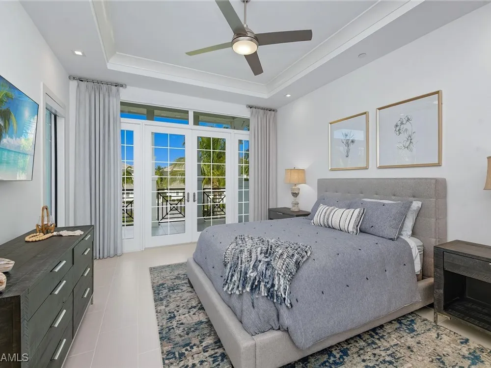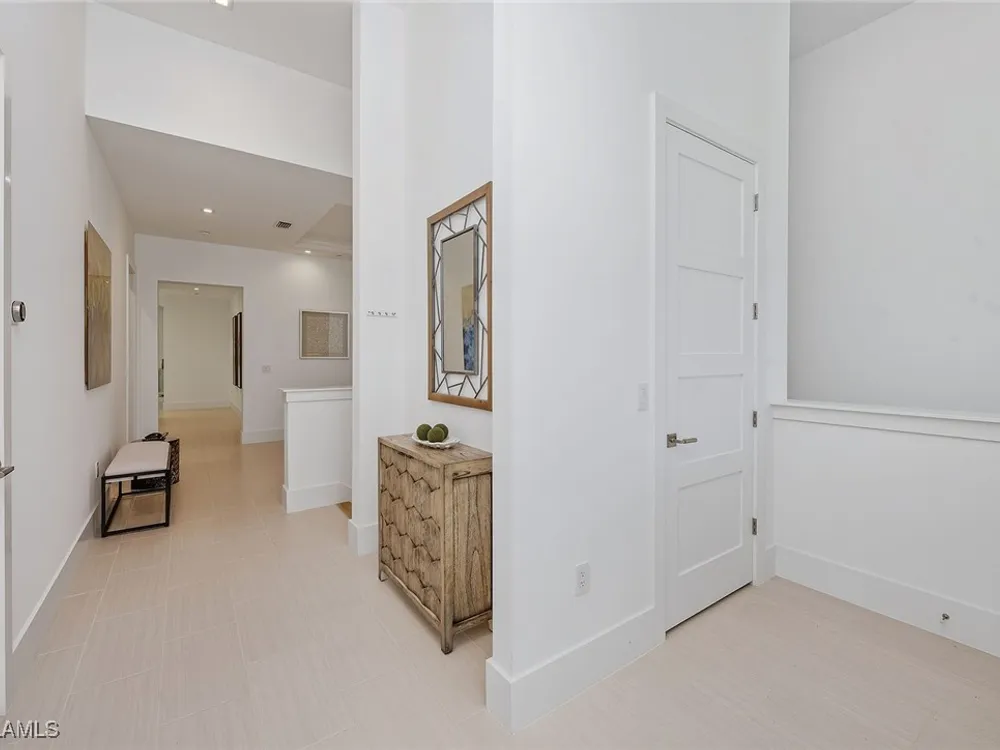 Discover tranquil lake and lush palm views from this beautifully furnished, light and bright Magnolia floorplan residence, quality built in 2020 by Gulf Bay Homes in the exclusive village of Dorado at Fiddler’s Creek. With eastern exposure for gorgeous sunrises and a design that lives like a single-family home, this second-floor retreat offers three bedrooms plus a den, three-and-a-half baths, and a spacious two-car garage. The popular layout blends sophistication and comfort, enhanced by soaring volume ceilings, dramatic architectural details, and seamless indoor-outdoor living. A wood staircase with stainless accent rods leads to the impressive main living area, where 35” x 11” porcelain tile floors, recessed LED lighting, and custom ceilings set the tone. The great room exceeds expectations with a vaulted ceiling featuring shiplap and coffered accents, ceiling speakers, and water views through sliding doors with remote-controlled electric shades. The adjacent dining area includes a built-in dry bar with cabinetry and counter space, perfect for entertaining. The chef’s kitchen boasts white cabinetry with glass-front uppers, in-cabinet and under-cabinet lighting, quartz counters, and a glass-tile backsplash. A full suite of Bosch stainless appliances includes a French-door refrigerator with freezer drawer, wall microwave, natural gas cooktop with hood vent, wall oven with convection, and dishwasher. An island with pendant lighting and bar seating, plus a pantry, completes the space, which flows effortlessly into the living and dining areas. The owner’s suite is a serene retreat with coffered ceilings, stunning water views, and a spa-like en-suite bath offering dual quartz vanities with makeup counter, a frameless walk-in shower with bench, and an expansive walk-in closet with custom wood shelving. Two guest bedrooms each feature ensuite baths, one with French doors leading to a private tiled balcony. The den, accented with tray ceilings and crown molding, provides the ideal setting for a home office or study. Additional highlights include a powder bath, a well-appointed laundry room with quartz counters, and a two-car garage with epoxy flooring and a 240V outlet for EV charger. The screened lanai offers covered outdoor living with tile flooring, a tray ceiling with wood plank, ceiling fans, and recessed LED lighting, all overlooking tranquil lake views. With impact glass windows and doors throughout, this home combines elegance with peace of mind. Residents enjoy world-class amenities including a resort-style pool, spa services, fitness center with classes, tennis and pickleball program with TEN new pickleball courts, bocce, an extensive activity calendar, and casual and fine dining. Miles of sidewalks wind through the lushly landscaped community for walking, bicycling, and running, while optional immediate memberships for golf, beach, and marina elevate the SWFL lifestyle-including a recently renovated golf course and brand-new golf clubhouse.