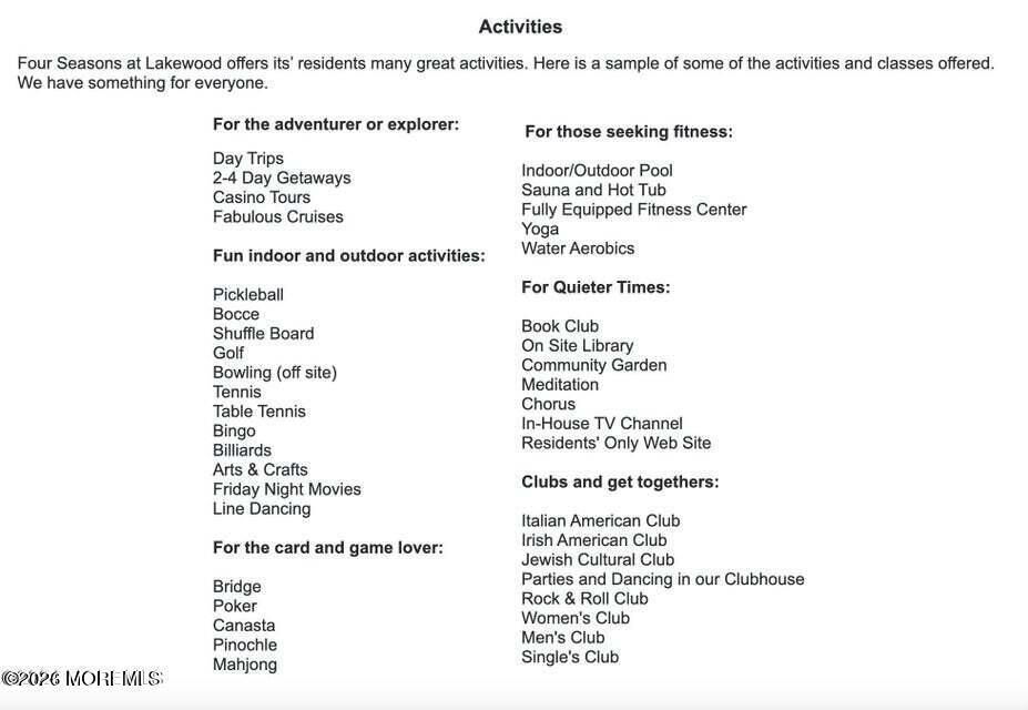 - See Four Seasons at Lakewood clubs, activities, and classes