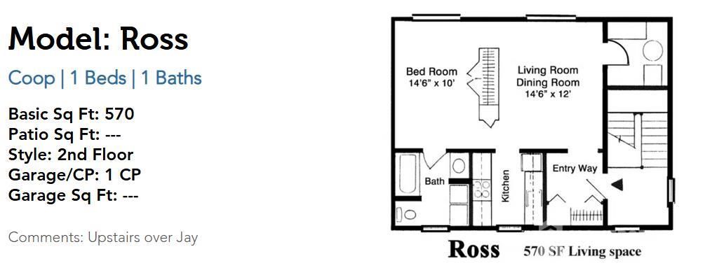 This lovely home is located in the community of Rossmoor. Please see age and purchase restrictions. Welcome to the Ross Model, a thoughtfully designed 1-bedroom, 1-bath residence offering 570 square feet of comfortable living space. Located on the second floor, this home provides privacy and an efficient layout ideal for easy living. The spacious living and dining area serves as the heart of the home, offering ample room for relaxing or entertaining. Adjacent is a well-planned kitchen, conveniently positioned near the entryway for everyday functionality. The bedroom is generously sized and includes closet storage, while the full bathroom is centrally located for easy access. An entryway creates a defined welcome into the home, enhancing the overall flow of the layout. Additional features include one covered parking space (carport) and a location upstairs over the Jay model, adding separation from ground-level activity. This efficient and inviting floor plan is perfect for those seeking a low-maintenance home with smart use of space in a second-floor setting.