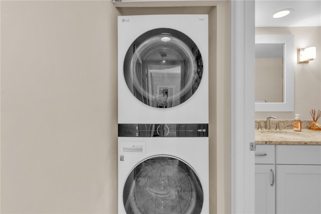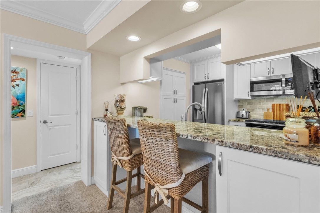 Bright, beautiful, renovated & ready to impress! This FIRST FLOOR, furnished-turnkey END UNIT shines w/ upgrades at every turn—crown molding, window wood trim, textured ceilings & plantation shutters! All closets boast California-style shelving! Stunning kitchen boasts granite counters, tumbled marble backsplash, SS appliances, pantry, TV, under lighting & added cabinets! BRAND NEW AC! Relax in added Jacuzzi tub or walk-in tiled shower/Rest in an adjustable king size Tempur-Pedic or Sleep Number bed! STEPS from heated pool! This gem blends comfort, quality & convenience in a perfect package!