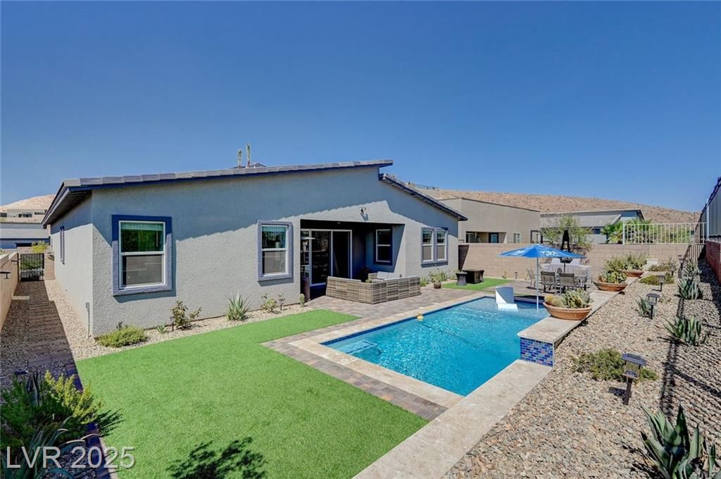 Start making memories in this stunning 2022-built home in Lake Las Vegas! Featuring a 3-car garage and paver driveway, this home welcomes you with an open floorplan, tile flooring, recessed lighting, and neutral palette throughout. Spacious great room includes a dry bar and large glass windows that open to the backyard oasis. Sstylish kitchen boasts stainless steel appliances, granite counters, a walk-in pantry, tile backsplash, ample cabinetry, and a large island with a breakfast bar. Main bedroom provides space for a sitting area, while the luxurious ensuite offers dual vanities, a soaking tub, and a generous walk-in closet with room for a home office. Two additional bedrooms share a Jack & Jill bath. Washer and dryer are included! Explore outside entertain in the beautifully designed backyard featuring a covered patio, a sitting area, and a sparkling pool with water features. Community includes a pool, golf course, and more. This home has it ALL; comfort, style, and room to enjoy!