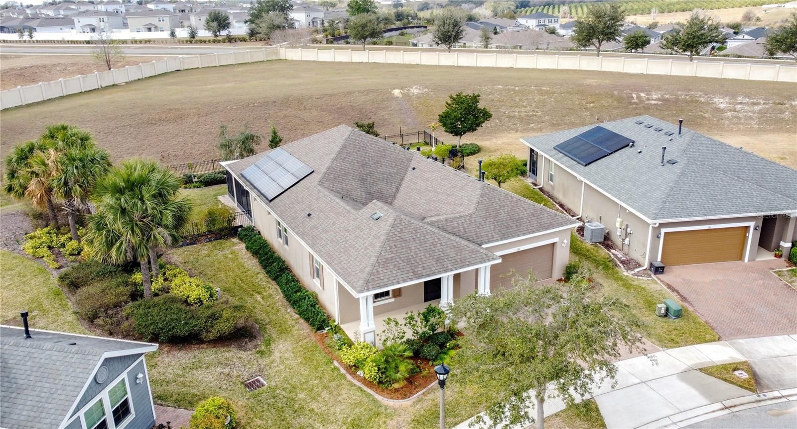 One or more photo(s) has been virtually staged. Offered at an exceptional value, with the CDD debt portion paid off, this beautifully maintained 3-bedroom, (optional den/office) 2-bath home is perfectly positioned on a ½-acre homesite with a large fenced portion—an uncommon find that offers both space and privacy. The property is bordered by an HOA-landscaped common area creating a peaceful backdrop for the extended covered & screened lanai (approx. 24’7” x 18’), ideal for outdoor living and entertaining. Inside, the home blends thoughtful design with everyday functionality. Designer tile flooring flows throughout the open-concept layout, while abundant natural light pours in through expansive sliding glass doors that seamlessly connect the interior to the lanai. The welcoming front porch & 2-car garage with epoxy flooring add to the home’s curb appeal & everyday convenience. The kitchen is thoughtfully designed with both style & function in mind, featuring granite countertops, stainless steel appliances, an electric cooktop, built-in wall oven and microwave, pull-out pot and pan drawers, a built-in trash cabinet, & a conveniently located pantry. Custom cabinetry shines throughout the home, offering an impressive 38 large drawers across the kitchen & flex/laundry area—exceptional storage that elevates daily living. The adjacent flex/laundry room includes tall pantries, ample space for a freezer or second refrigerator, & a large utility sink, making it as practical as it is impressive. The primary suite offers a comfortable retreat with generous proportions & a built-in closet system. The en-suite bath features dual granite vanities, a glass-enclosed shower with bench, & a private water closet. Two additional bedrooms provide flexibility for guests, hobbies, or home office use. Outdoors, there is a newly updated irrigation system with added drip lines in landscape beds, along with a designated garden area. A raised planting bed & multiple fruit trees enhance the space for gardening enthusiasts. Select landscape beds are finished with permanent brick edging, adding both durability & a clean, finished look to the outdoor areas. Additional upgrades include double-pane windows, energy-efficient features, natural gas availability to both the kitchen and lanai, a paid-off solar lease, replaced A/C coils and condenser. The paver driveway & walkway complete this truly move-in-ready home, where options were carefully selected with a professional design team to create a space that feels both refined and welcoming. Located in the guard-gated Trilogy Cascades of Groveland, a 55+ active lifestyle community, residents enjoy the 57,000-square-foot Magnolia House—an impressive hub for fitness, dining, and connection. Amenities include a full-service restaurant & bar, two fitness centers, indoor & outdoor pools & spas, walking trails, a dog park, tennis, pickleball, bocce ball, & more than 50 clubs & activities. Concerts, shows, a demonstration kitchen, massage room, dance studio, poker lounge, golf simulator, & billiards support a vibrant, active lifestyle. With HOA approval, residents between the ages of 45–54 may be permitted. The monthly HOA includes lawn & shrub maintenance, basic cable, internet with landline, home security monitoring, street & lighting maintenance, guard-gated entry, & full access to all clubhouse amenities. This is a rare opportunity to own a thoughtfully upgraded home on a private ½-acre homesite in one of the area’s most sought-after active lifestyle communities.