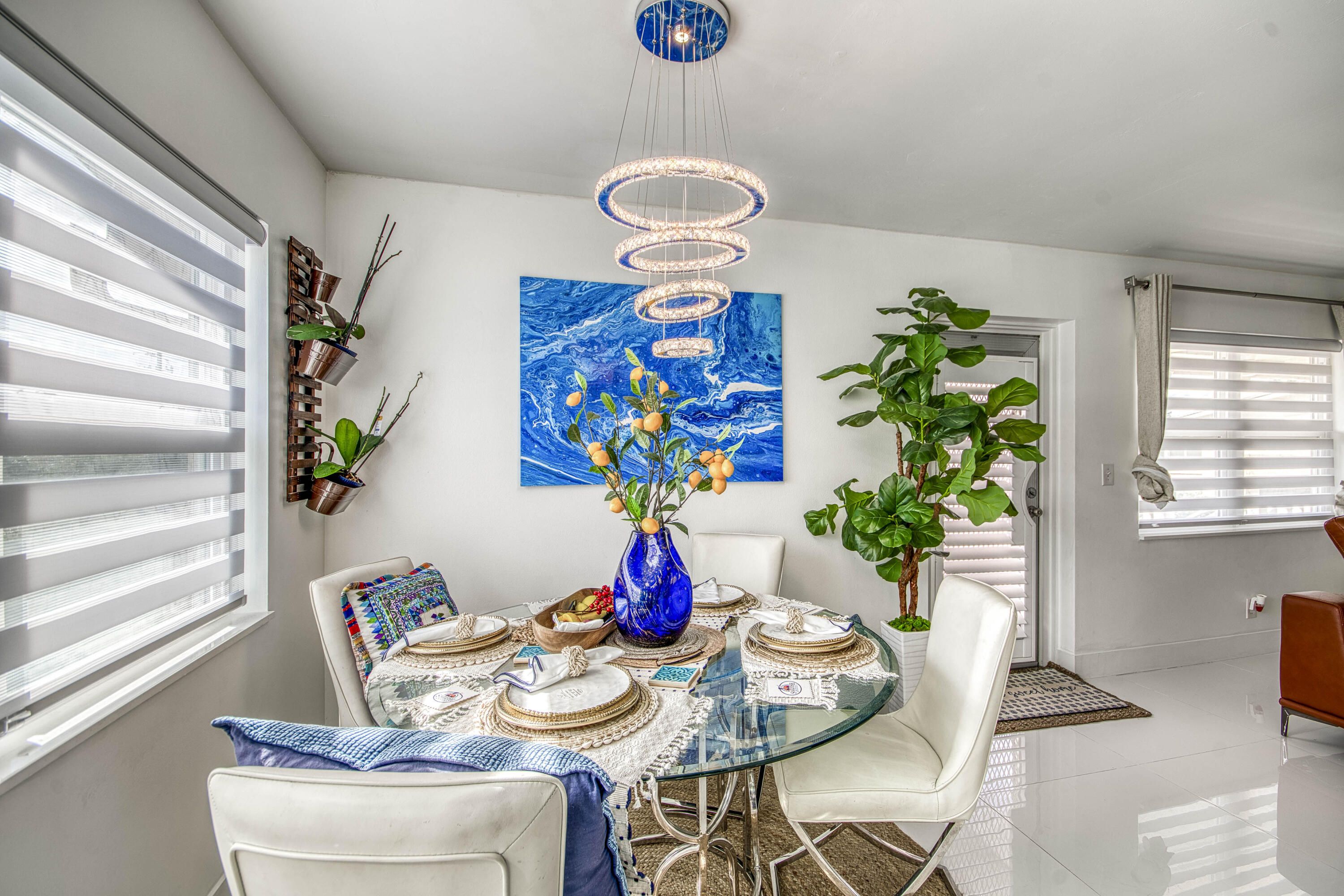 Beautifully remodeled 2BR/1.5BA upstairs corner condo with water views in the gated 55+ community of Century Village in West Palm Beach. Corner location provides water views from the side and rear of the unit. Modern tile floors flow seamlessly through the living spaces, bedrooms, and primary bath. The main living area connects to the dining space with zebra shades and an updated kitchen featuring blue painted wood cabinetry, quartz countertops, stainless steel appliances, and a window. The rear of the condo includes two bedrooms and 1.5 baths. The primary suite offers sliding glass doors to the screened balcony and a walk-in closet with motion-sensor lighting. The updated bathroom includes a glass shower door, vanity, modern lighting, and contemporary finishes. The guest bedroom mirrored closet doors and a window overlooking the balcony and water. The screened balcony spans the full width of the condo, with water views and added privacy due to the corner position. Upgrades and features include: new flooring, fresh paint, popcorn ceilings removed, painted cabinets, quartz counters, new window sills, updated interior doors, baseboards throughout, modern light fixtures, new glass shower door, lighted bath mirrors, new vanity, serviced A/C units, and window treatments, impact windows. Century Village amenities include a 92,000 sq ft clubhouse, 1,221-seat theater, fitness center, wave-walking pool, classes, clubs, and social events, all minutes from Downtown West Palm Beach, PBIA, I-95 & Turnpike.