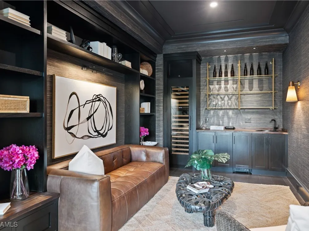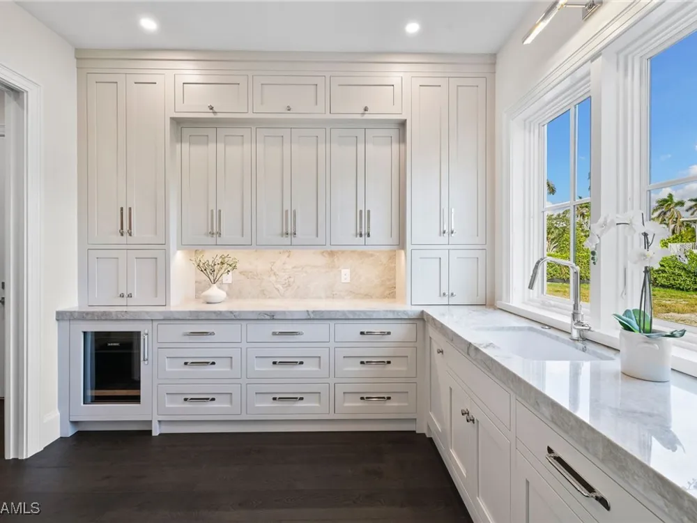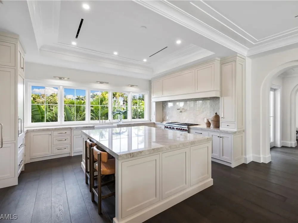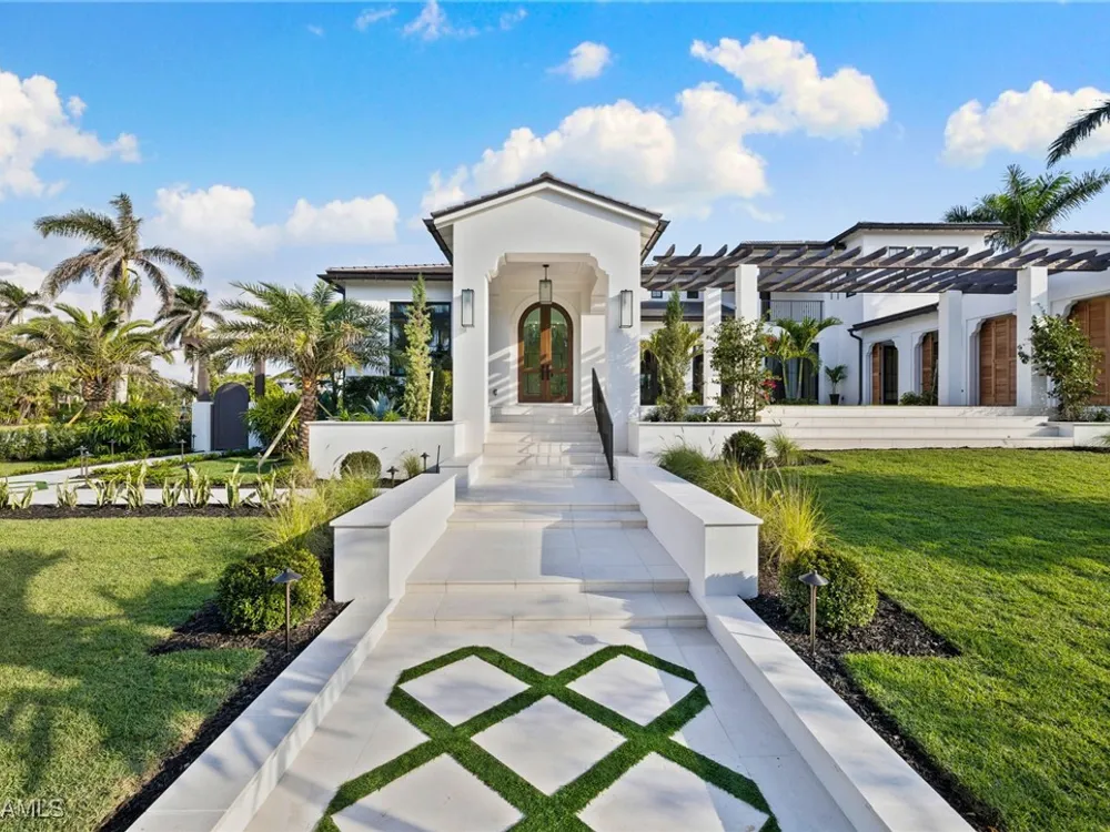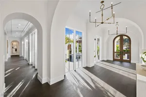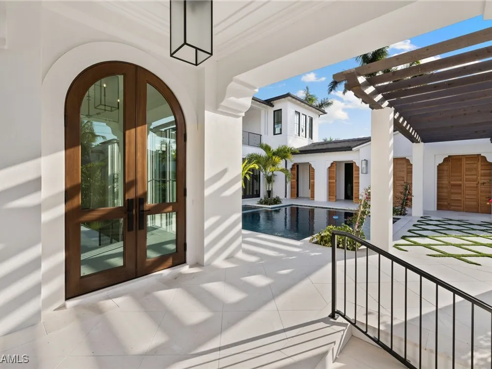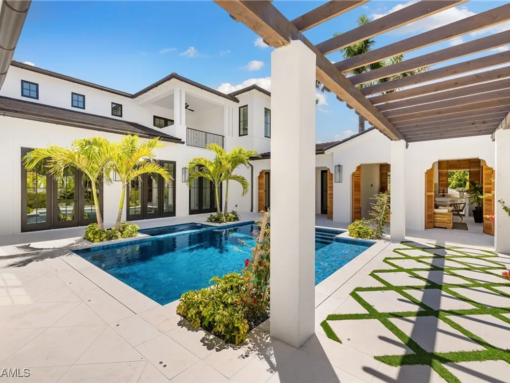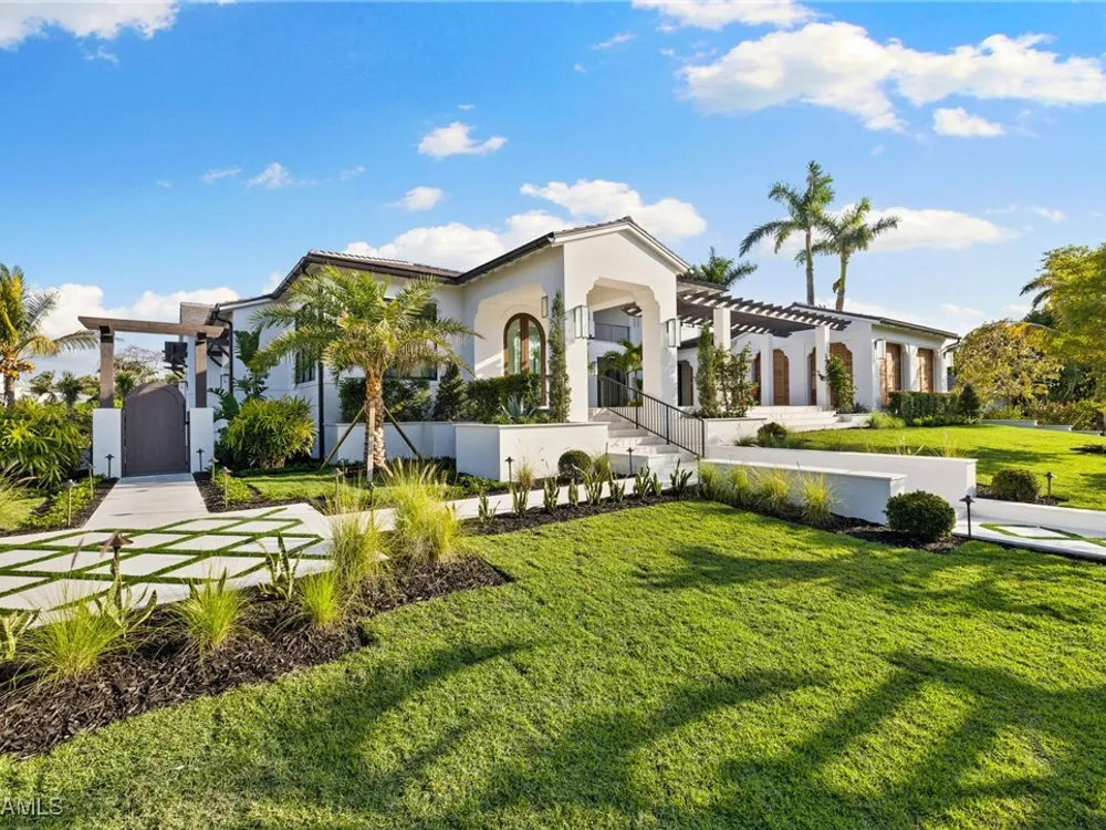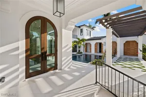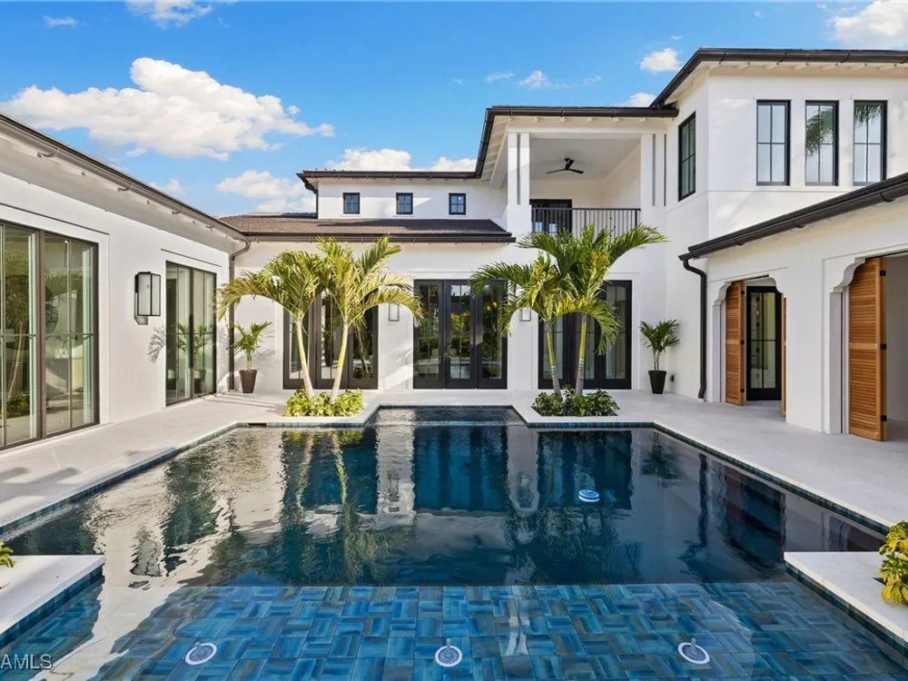 This stunning 2025-built residence is a true masterpiece. Combining the timeless charm of Santa Barbara architecture with the relaxed elegance of the Caribbean, this home offers a seamless blend of sophistication, modern luxury, and serene living.  With 5 bedrooms, a dedicated study, and a library, this expansive home spans almost 6,000 square feet of refined living space, designed for both grand entertaining and intimate family moments. From the moment you enter, you'll be captivated by custom millwork Mahogany front doors , elegant architectural details of the foyer, dark Legno Bastone French Oak flooring, and the abundance of natural light pouring through large windows that bring the outdoors in. The chef’s kitchen is a showstopper, featuring a central quartzite island, custom cabinetry, and high-end appliances, including two Sub-Zero refrigerator/freezers, a 48-inch Wolf gas range, double oven, Wolf microwave, and warming drawer. The adjacent butler’s pantry with Sub-Zero beverage center and Bosch dishwasher elevates both style and function for the most discerning home chefs. The main floor includes a guest bedroom with an en-suite bath, a private den, and a library (with ice make, beverage refrigerator and 102 bottle wine refrigerator, along with a half bath and a full bath accessible from the lanai. The sun-soaked primary suite is a luxurious retreat, offering an expansive walk-through custom closet that leads into the spa-inspired bath, designed with indulgence in mind. The family room seamlessly opens to the lushly landscaped patio, featuring a summer kitchen equipped with a Sub-Zero beverage center, ice maker, GE dishwasher, and a 40-inch BBQ—perfect for year-round outdoor entertaining.  Pool is 24 x 18.5, plus the hot tub is 9.5 x 6. The second level features a bonus loft area and 3 additional en-suite bedrooms. This custom-built home it’s a treat to experience as it is one of Naples finest new construction homes in the area, where every detail has been carefully designed for those with discerning taste. Built to the latest and best codes, including a full house generator. Moorings Private Beach Club has a very low membership fee, what other beach club can you join for $1450.
