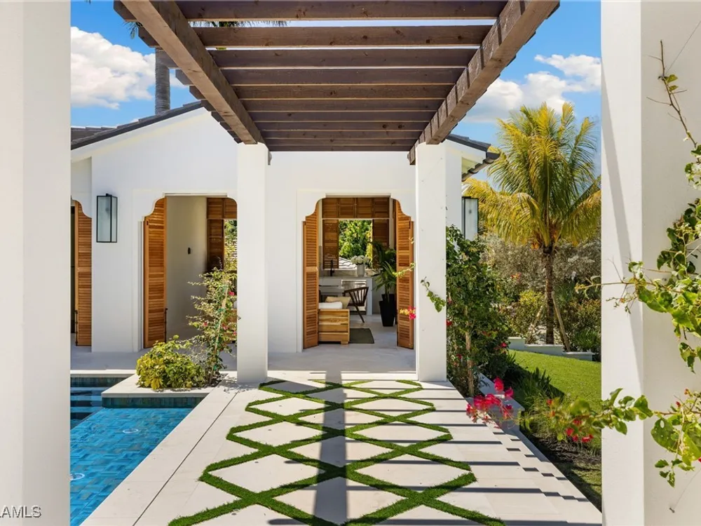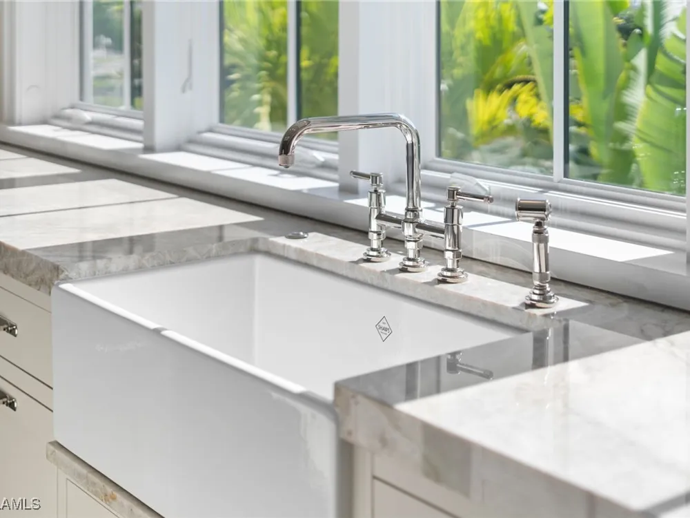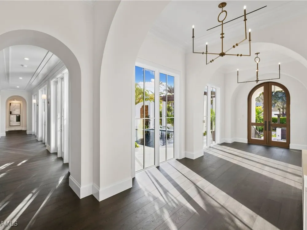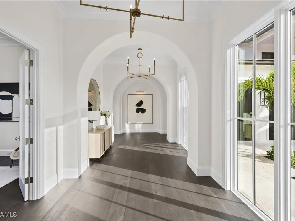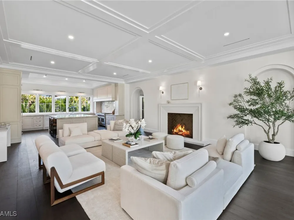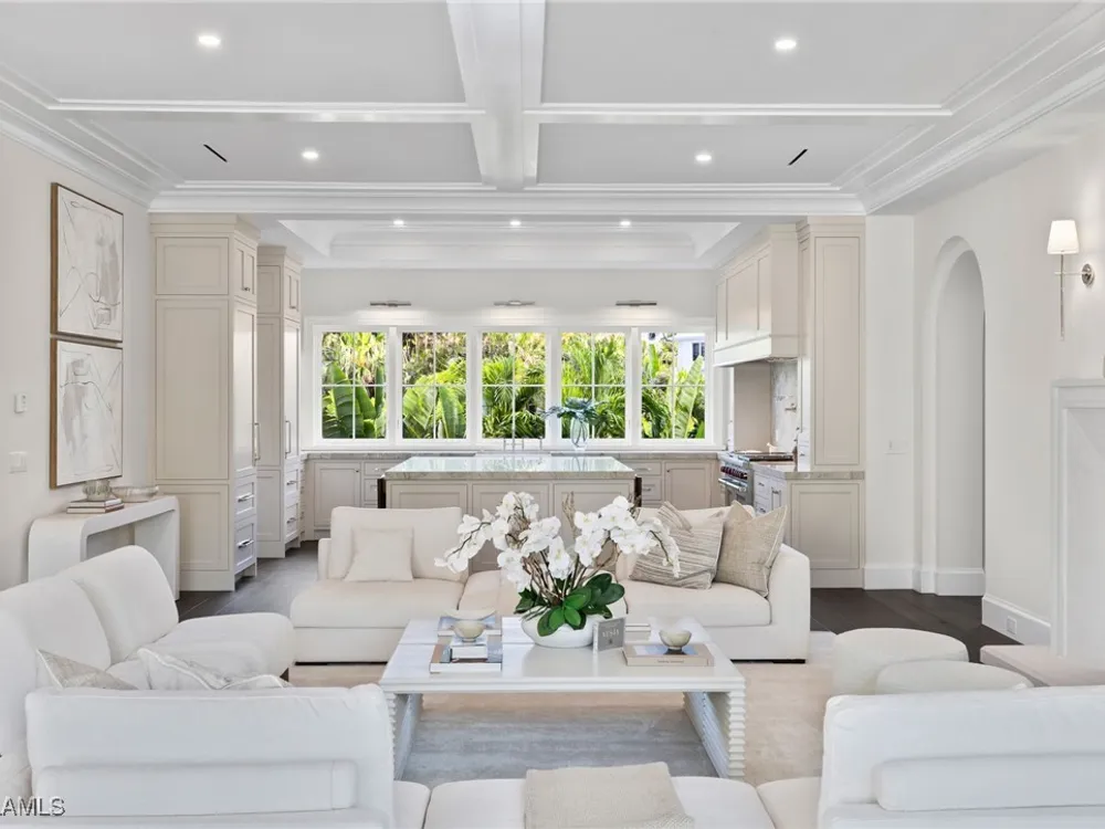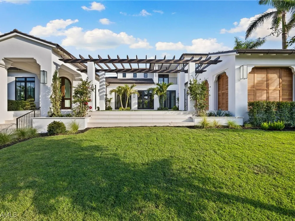 This stunning 2025-built residence is a true masterpiece. Combining the timeless charm of Santa Barbara architecture with the relaxed elegance of the Caribbean, this home offers a seamless blend of sophistication, modern luxury, and serene living.  With 5 bedrooms, a dedicated study, and a library, this expansive home spans almost 6,000 square feet of refined living space, designed for both grand entertaining and intimate family moments. From the moment you enter, you'll be captivated by custom millwork Mahogany front doors , elegant architectural details of the foyer, dark Legno Bastone French Oak flooring, and the abundance of natural light pouring through large windows that bring the outdoors in. The chef’s kitchen is a showstopper, featuring a central quartzite island, custom cabinetry, and high-end appliances, including two Sub-Zero refrigerator/freezers, a 48-inch Wolf gas range, double oven, Wolf microwave, and warming drawer. The adjacent butler’s pantry with Sub-Zero beverage center and Bosch dishwasher elevates both style and function for the most discerning home chefs. The main floor includes a guest bedroom with an en-suite bath, a private den, and a library (with ice make, beverage refrigerator and 102 bottle wine refrigerator, along with a half bath and a full bath accessible from the lanai. The sun-soaked primary suite is a luxurious retreat, offering an expansive walk-through custom closet that leads into the spa-inspired bath, designed with indulgence in mind. The family room seamlessly opens to the lushly landscaped patio, featuring a summer kitchen equipped with a Sub-Zero beverage center, ice maker, GE dishwasher, and a 40-inch BBQ—perfect for year-round outdoor entertaining.  Pool is 24 x 18.5, plus the hot tub is 9.5 x 6. The second level features a bonus loft area and 3 additional en-suite bedrooms. This custom-built home it’s a treat to experience as it is one of Naples finest new construction homes in the area, where every detail has been carefully designed for those with discerning taste. Built to the latest and best codes, including a full house generator. Moorings Private Beach Club has a very low membership fee, what other beach club can you join for $1450.