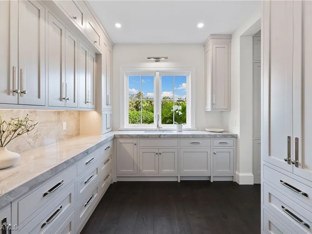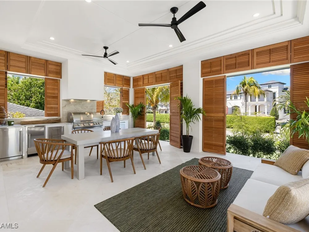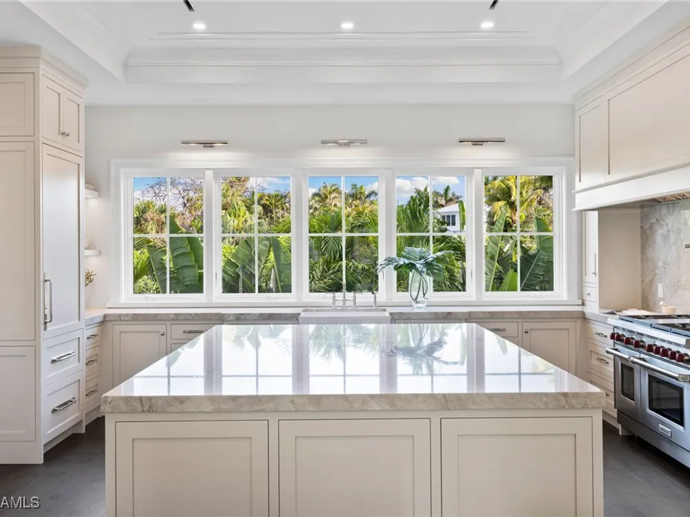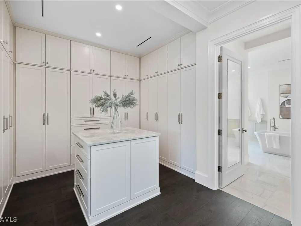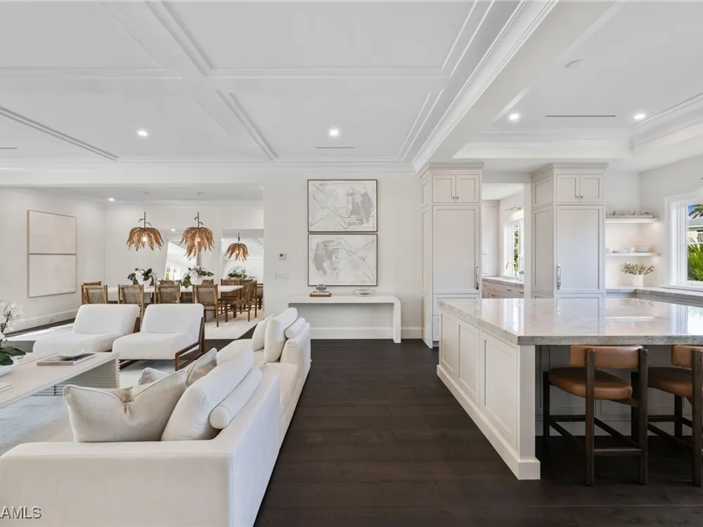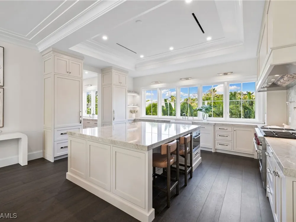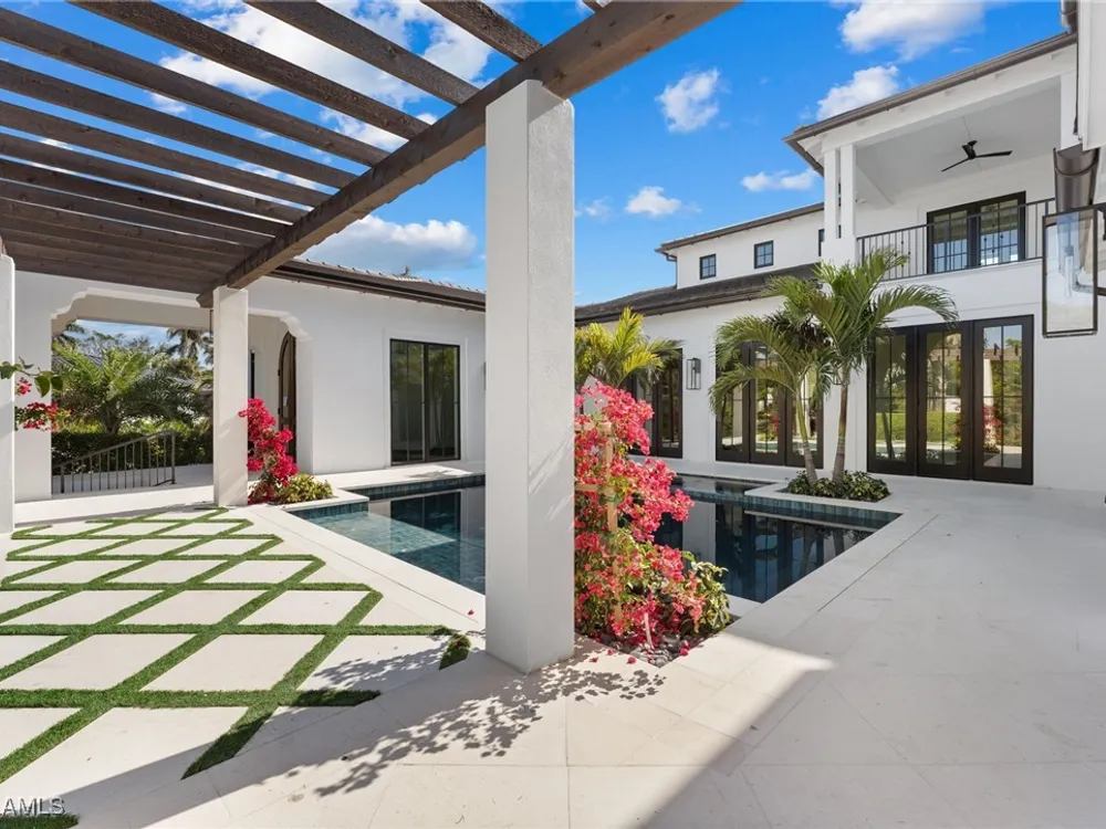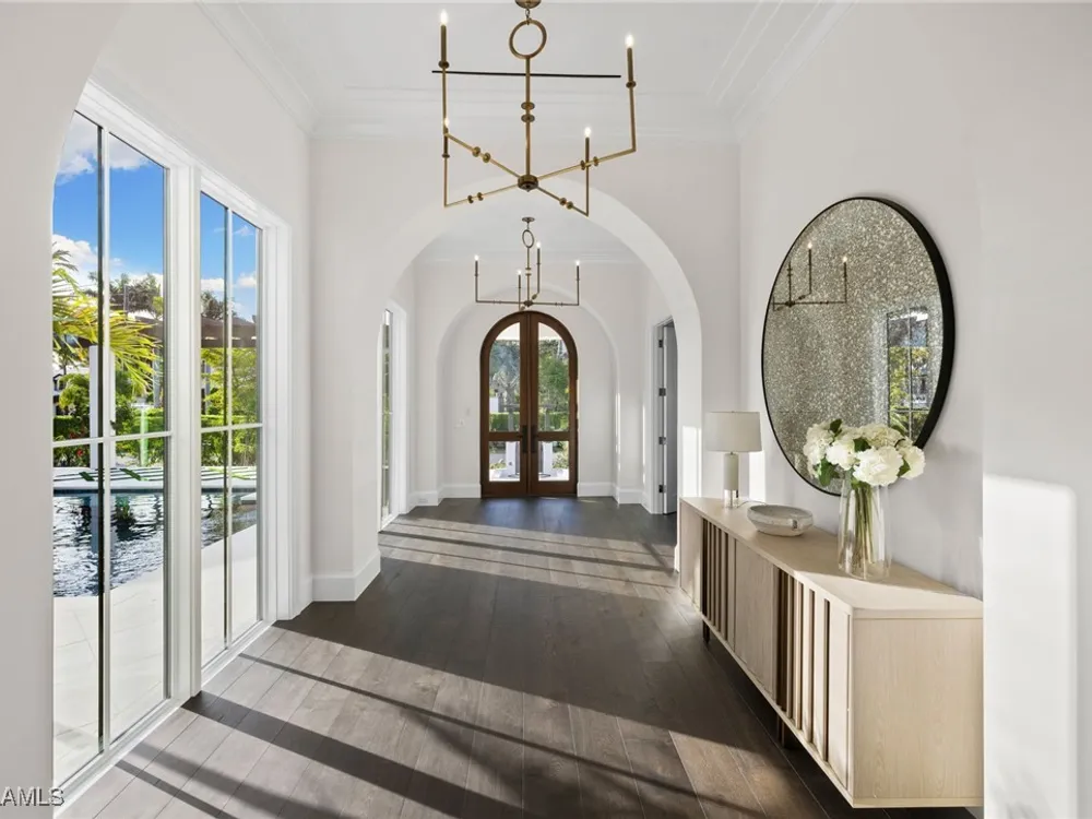 This stunning 2025-built residence is a true masterpiece. Combining the timeless charm of Santa Barbara architecture with the relaxed elegance of the Caribbean, this home offers a seamless blend of sophistication, modern luxury, and serene living.  With 5 bedrooms, a dedicated study, and a library, this expansive home spans almost 6,000 square feet of refined living space, designed for both grand entertaining and intimate family moments. From the moment you enter, you'll be captivated by custom millwork Mahogany front doors , elegant architectural details of the foyer, dark Legno Bastone French Oak flooring, and the abundance of natural light pouring through large windows that bring the outdoors in. The chef’s kitchen is a showstopper, featuring a central quartzite island, custom cabinetry, and high-end appliances, including two Sub-Zero refrigerator/freezers, a 48-inch Wolf gas range, double oven, Wolf microwave, and warming drawer. The adjacent butler’s pantry with Sub-Zero beverage center and Bosch dishwasher elevates both style and function for the most discerning home chefs. The main floor includes a guest bedroom with an en-suite bath, a private den, and a library (with ice make, beverage refrigerator and 102 bottle wine refrigerator, along with a half bath and a full bath accessible from the lanai. The sun-soaked primary suite is a luxurious retreat, offering an expansive walk-through custom closet that leads into the spa-inspired bath, designed with indulgence in mind. The family room seamlessly opens to the lushly landscaped patio, featuring a summer kitchen equipped with a Sub-Zero beverage center, ice maker, GE dishwasher, and a 40-inch BBQ—perfect for year-round outdoor entertaining.  Pool is 24 x 18.5, plus the hot tub is 9.5 x 6. The second level features a bonus loft area and 3 additional en-suite bedrooms. This custom-built home it’s a treat to experience as it is one of Naples finest new construction homes in the area, where every detail has been carefully designed for those with discerning taste. Built to the latest and best codes, including a full house generator. Moorings Private Beach Club has a very low membership fee, what other beach club can you join for $1450.