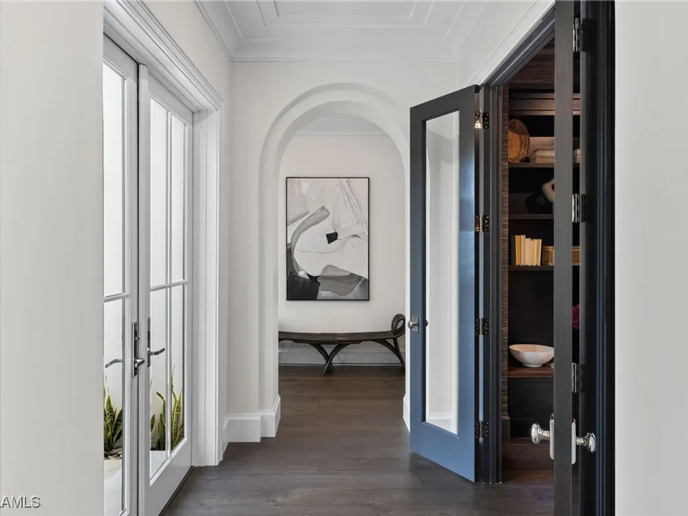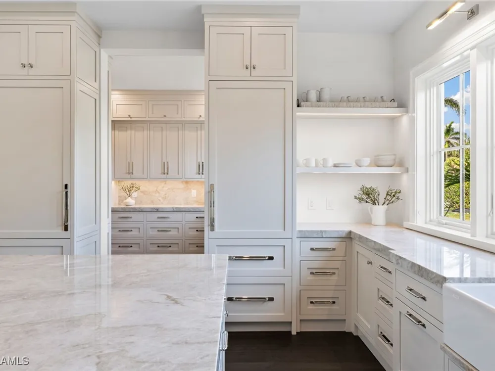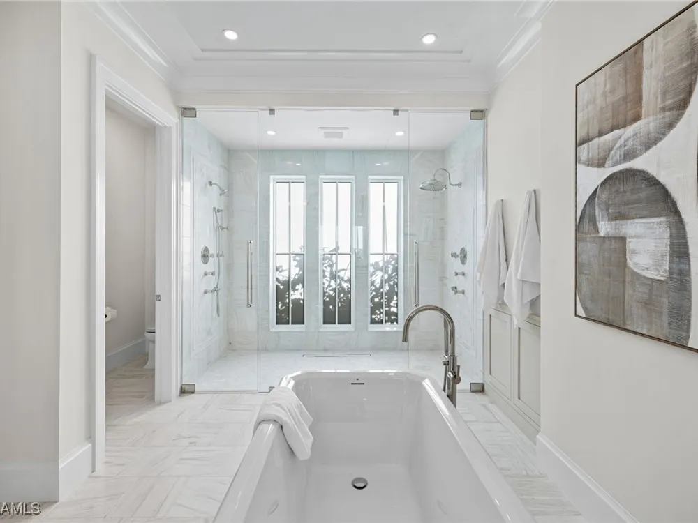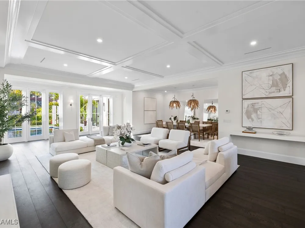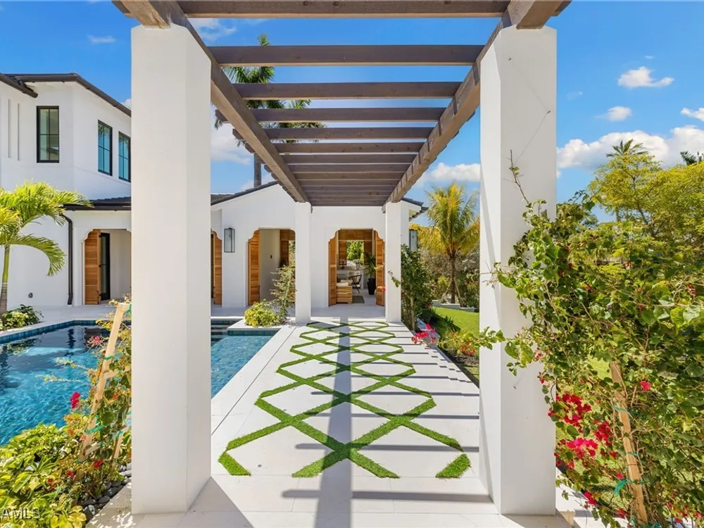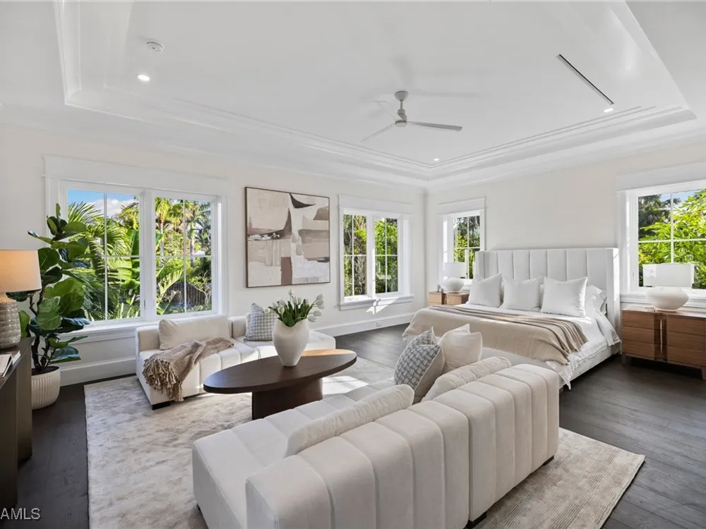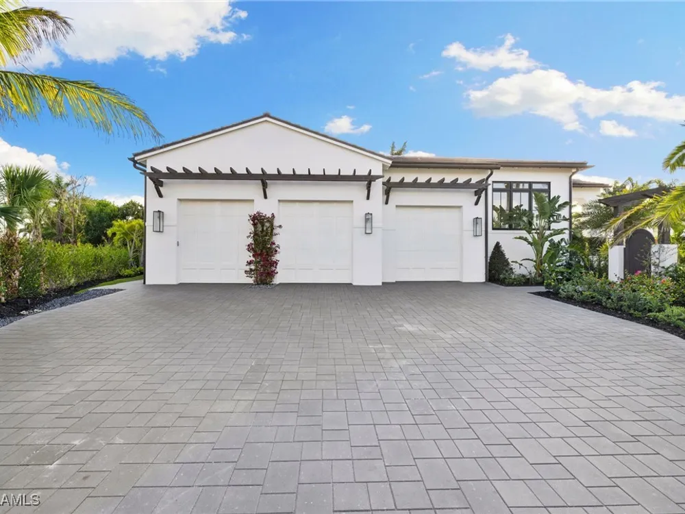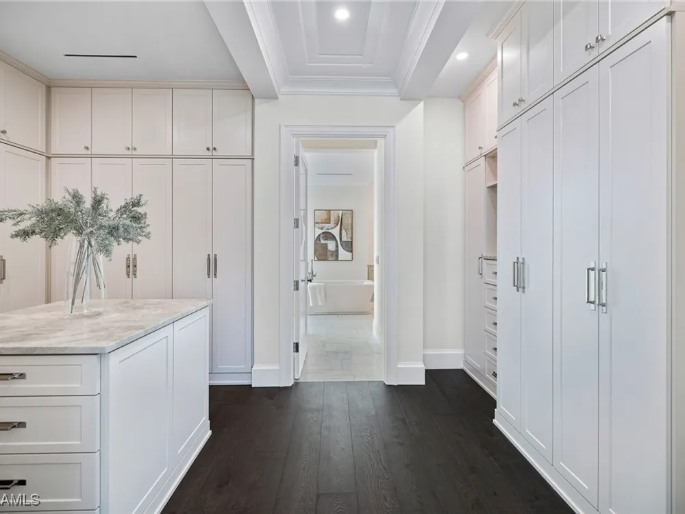 This stunning 2025-built residence is a true masterpiece. Combining the timeless charm of Santa Barbara architecture with the relaxed elegance of the Caribbean, this home offers a seamless blend of sophistication, modern luxury, and serene living.  With 5 bedrooms, a dedicated study, and a library, this expansive home spans almost 6,000 square feet of refined living space, designed for both grand entertaining and intimate family moments. From the moment you enter, you'll be captivated by custom millwork Mahogany front doors , elegant architectural details of the foyer, dark Legno Bastone French Oak flooring, and the abundance of natural light pouring through large windows that bring the outdoors in. The chef’s kitchen is a showstopper, featuring a central quartzite island, custom cabinetry, and high-end appliances, including two Sub-Zero refrigerator/freezers, a 48-inch Wolf gas range, double oven, Wolf microwave, and warming drawer. The adjacent butler’s pantry with Sub-Zero beverage center and Bosch dishwasher elevates both style and function for the most discerning home chefs. The main floor includes a guest bedroom with an en-suite bath, a private den, and a library (with ice make, beverage refrigerator and 102 bottle wine refrigerator, along with a half bath and a full bath accessible from the lanai. The sun-soaked primary suite is a luxurious retreat, offering an expansive walk-through custom closet that leads into the spa-inspired bath, designed with indulgence in mind. The family room seamlessly opens to the lushly landscaped patio, featuring a summer kitchen equipped with a Sub-Zero beverage center, ice maker, GE dishwasher, and a 40-inch BBQ—perfect for year-round outdoor entertaining.  Pool is 24 x 18.5, plus the hot tub is 9.5 x 6. The second level features a bonus loft area and 3 additional en-suite bedrooms. This custom-built home it’s a treat to experience as it is one of Naples finest new construction homes in the area, where every detail has been carefully designed for those with discerning taste. Built to the latest and best codes, including a full house generator. Moorings Private Beach Club has a very low membership fee, what other beach club can you join for $1450.