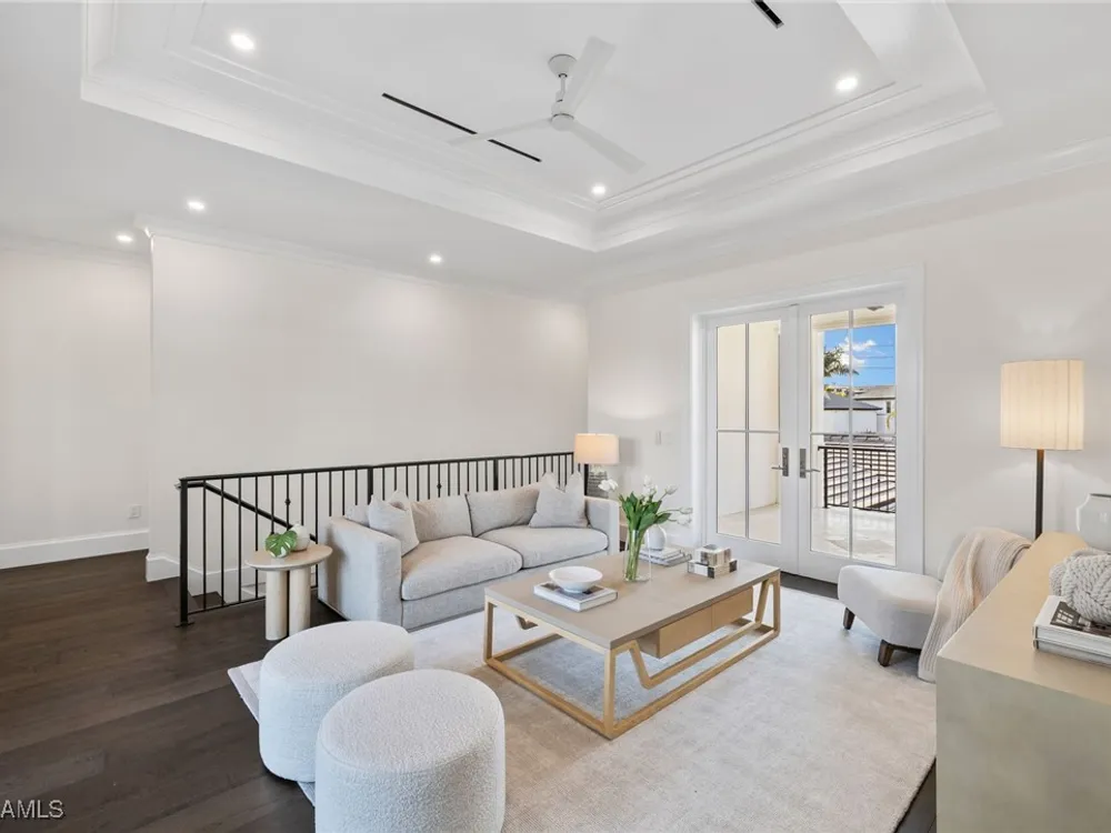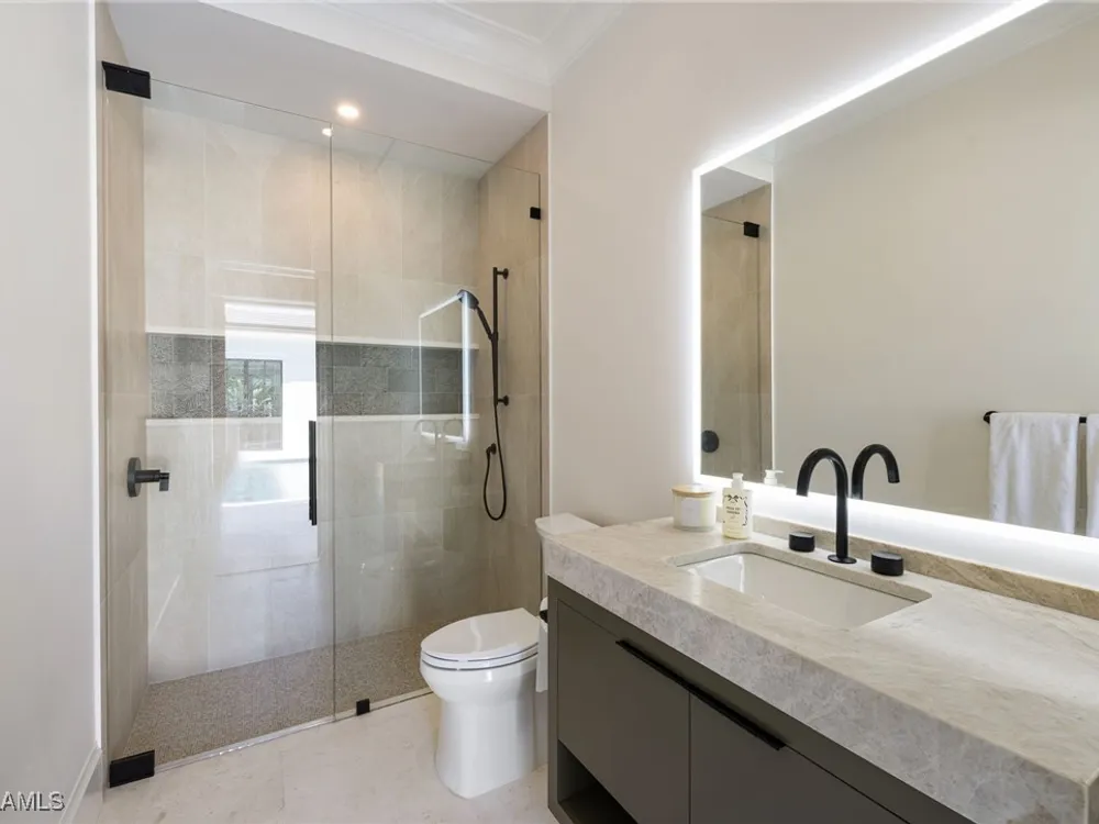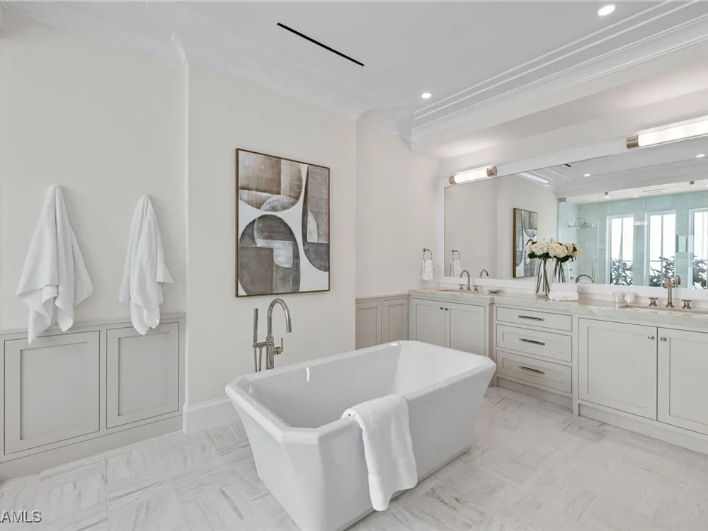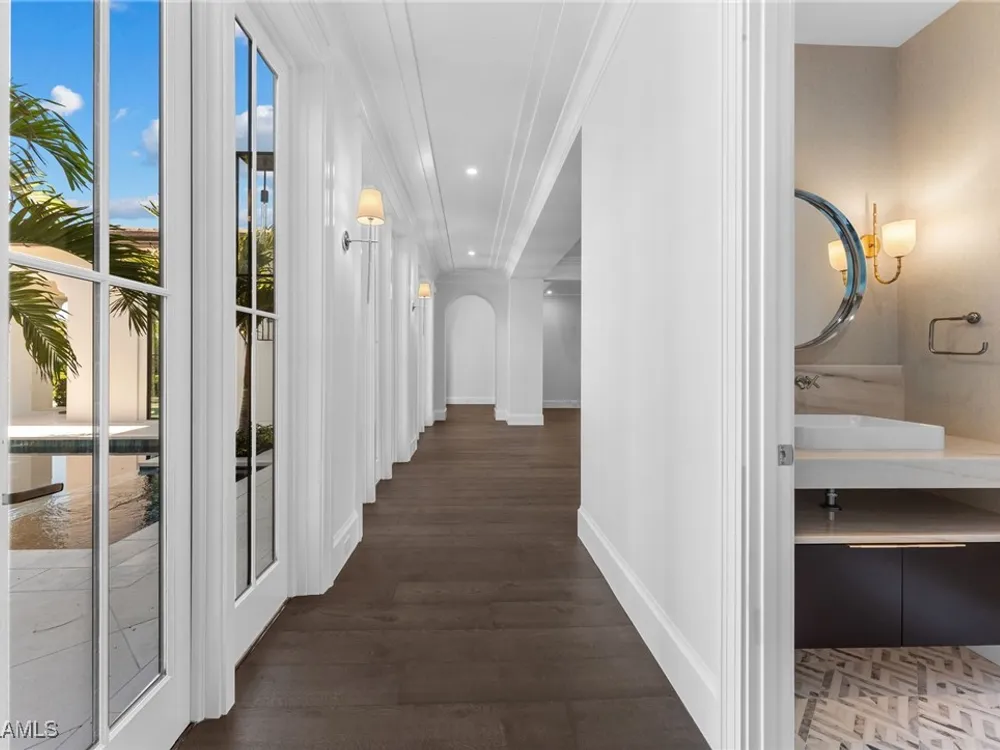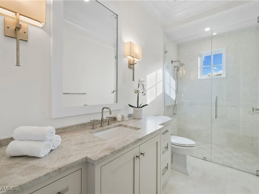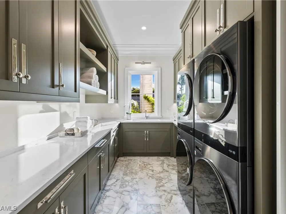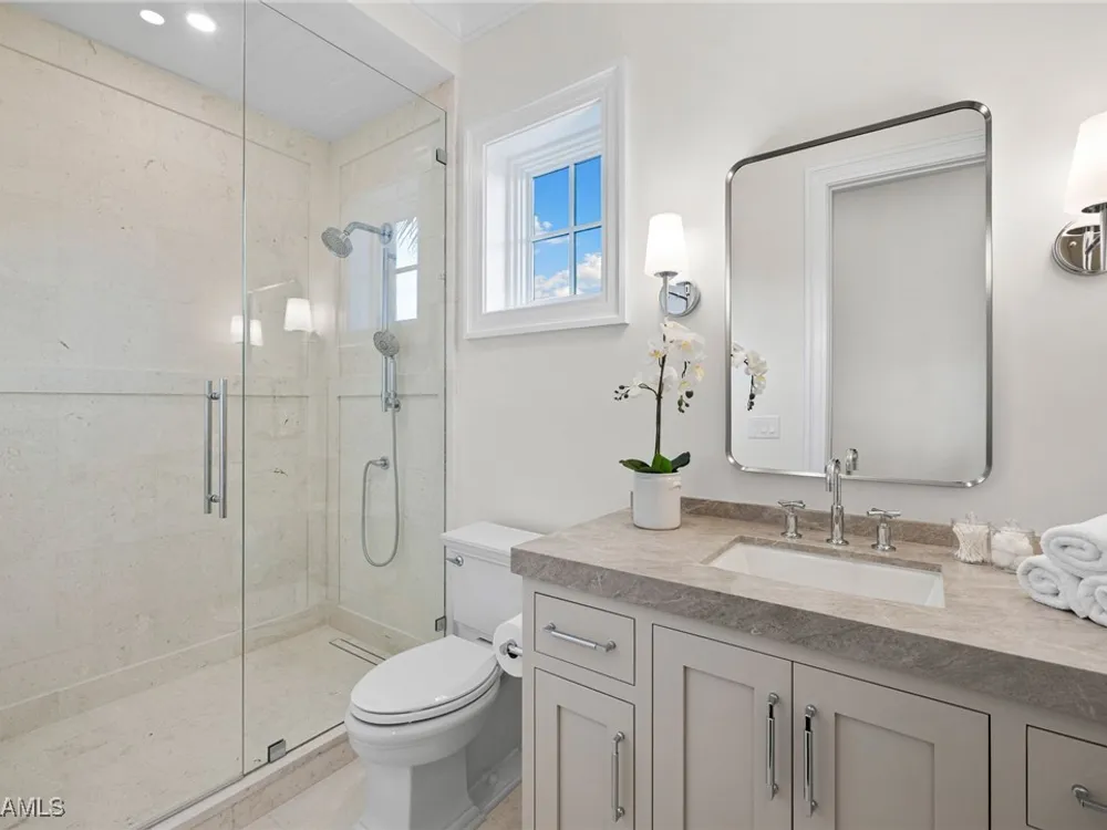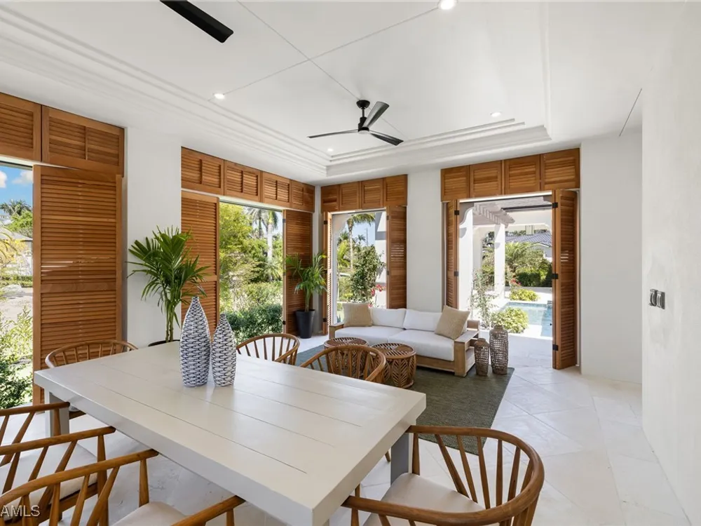 This stunning 2025-built residence is a true masterpiece. Combining the timeless charm of Santa Barbara architecture with the relaxed elegance of the Caribbean, this home offers a seamless blend of sophistication, modern luxury, and serene living.  With 5 bedrooms, a dedicated study, and a library, this expansive home spans almost 6,000 square feet of refined living space, designed for both grand entertaining and intimate family moments. From the moment you enter, you'll be captivated by custom millwork Mahogany front doors , elegant architectural details of the foyer, dark Legno Bastone French Oak flooring, and the abundance of natural light pouring through large windows that bring the outdoors in. The chef’s kitchen is a showstopper, featuring a central quartzite island, custom cabinetry, and high-end appliances, including two Sub-Zero refrigerator/freezers, a 48-inch Wolf gas range, double oven, Wolf microwave, and warming drawer. The adjacent butler’s pantry with Sub-Zero beverage center and Bosch dishwasher elevates both style and function for the most discerning home chefs. The main floor includes a guest bedroom with an en-suite bath, a private den, and a library (with ice make, beverage refrigerator and 102 bottle wine refrigerator, along with a half bath and a full bath accessible from the lanai. The sun-soaked primary suite is a luxurious retreat, offering an expansive walk-through custom closet that leads into the spa-inspired bath, designed with indulgence in mind. The family room seamlessly opens to the lushly landscaped patio, featuring a summer kitchen equipped with a Sub-Zero beverage center, ice maker, GE dishwasher, and a 40-inch BBQ—perfect for year-round outdoor entertaining.  Pool is 24 x 18.5, plus the hot tub is 9.5 x 6. The second level features a bonus loft area and 3 additional en-suite bedrooms. This custom-built home it’s a treat to experience as it is one of Naples finest new construction homes in the area, where every detail has been carefully designed for those with discerning taste. Built to the latest and best codes, including a full house generator. Moorings Private Beach Club has a very low membership fee, what other beach club can you join for $1450.