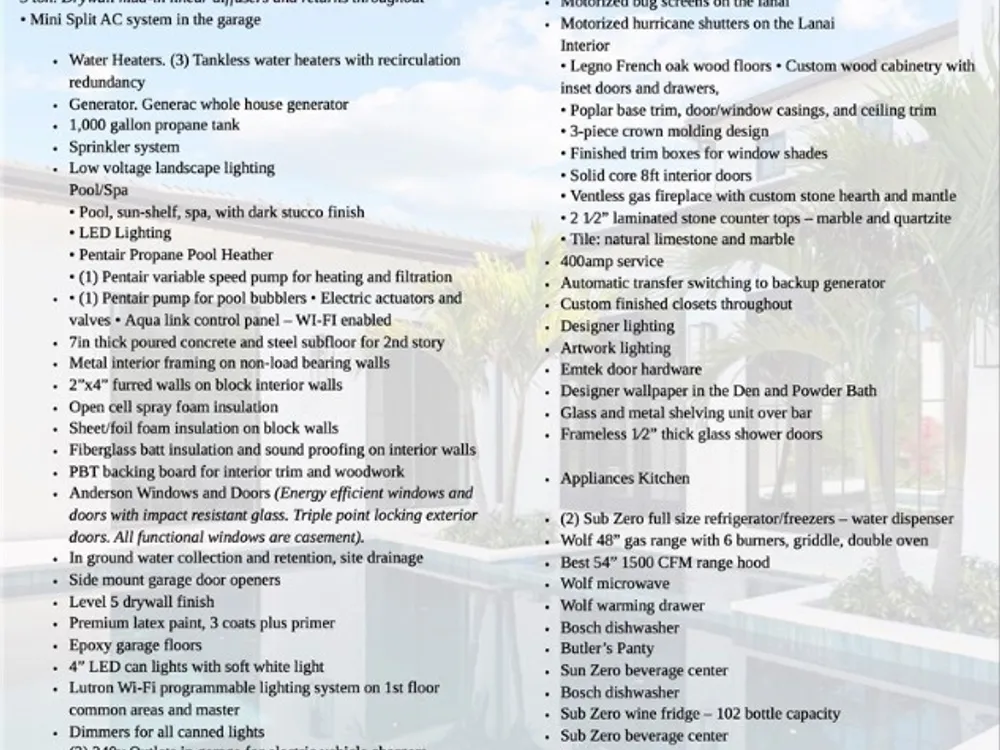 - Double Oven, Dishwasher, Freezer, Gas Cooktop, Microwave, Range, Refrigerator, Tankless Water Heater, Wine Cooler, Warming Drawer
