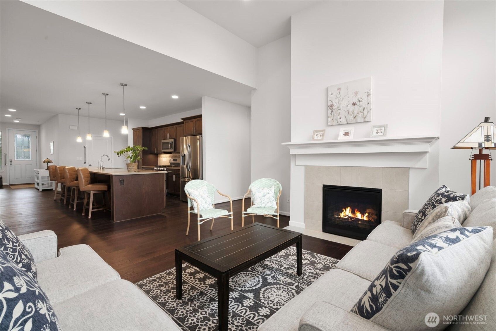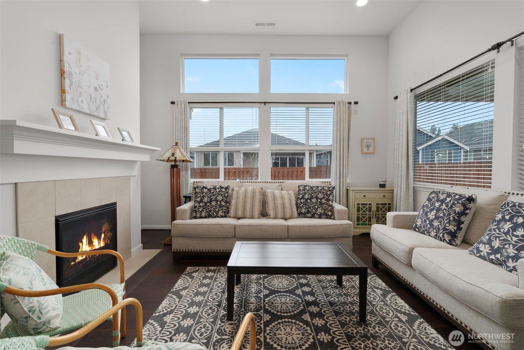 Embrace modern elegance in this coveted 55+ Ovation Community. This 2 bedroom plus den home embodies luxury, sophistication with easy, practical living. High ceilings & clerestory windows provide a light and airy feel. Entertain guests in the gourmet kitchen with large granite counter, expansive storage & SS appliances. Kitchen opens to inviting formal dining and living room. Engineered hardwood floors and gas fireplace add to a warm and inviting ambiance. Retreat to luxury primary suite with luxury bath. Fully fenced lot and covered patio. A community of friendly clubs and a place for great interactions. Just 2 blocks to the amazing lodge with entertainment spaces, pool, pickleball courts and much more. Monthly HOD provides access to all of the community facilities for your enjoyment. Front yard maintained by HOA. This home is not just a residence - it's a lifestyle.