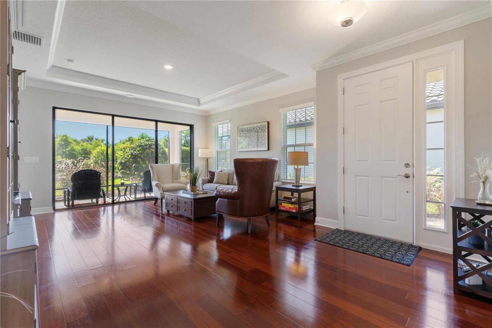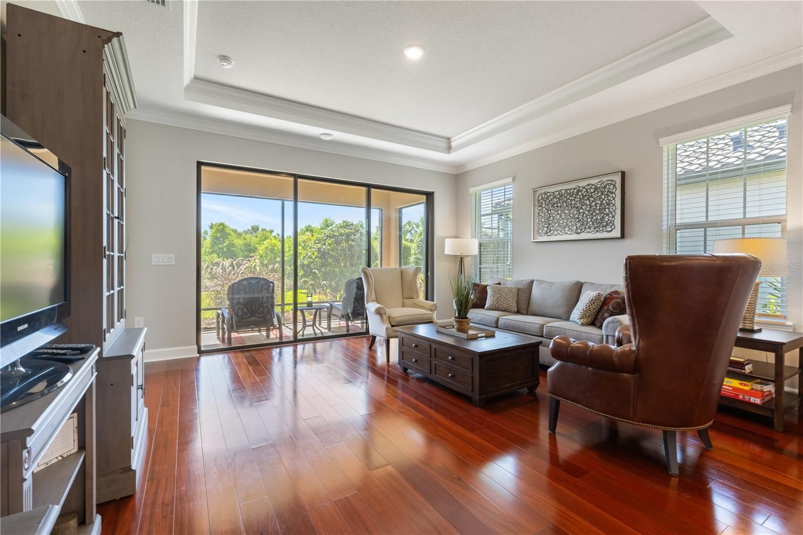 Welcome to this immaculate LOW MAINTENANCE 2-bedroom, 2-bathroom Taylor Morrison Roma model, located in the highly sought-after Esplanade at Starkey Ranch—a premier gated, resort-style community. Built in 2021, this thoughtfully designed home offers a perfect blend of modern finishes, elegant upgrades, and a functional layout that includes a dedicated office or den, ideal for working from home or flexible living needs. Situated on a premium conservation lot, the home offers tranquil views and enhanced privacy, creating a serene backdrop for everyday living. Step inside to find rich cherry hardwood floors flowing throughout the main living spaces, complemented by high ceilings and natural light that fills the open-concept layout. The formal dining room offers a transom window, tray ceilings and crown molding, which creates both a bright and sophisticated setting for hosting gatherings. The heart of the home is the sleek and modern chef’s kitchen, featuring a gas range, upgraded cabinetry, quartz countertops, and stainless steel appliances—perfect for entertaining or casual meals. The spacious living and dining areas flow effortlessly to a screened-in lanai, where you can unwind while enjoying peaceful views of the lush conservation area. The primary suite is a true retreat with a large walk-in closet, dual vanities, and a walk-in shower. A generous secondary bedroom is positioned for privacy, and the additional full bathroom makes hosting guests comfortable and convenient. The office/den offers a quiet and stylish space that easily functions as a third sleeping area, hobby room, or reading nook. Additional highlights include a full laundry room, ample storage, and a two-car garage. This home has been meticulously maintained and feels like new—ready for you to move right in and enjoy. Living in Esplanade at Starkey Ranch means access to exclusive amenities, including a clubhouse, fitness center, resort-style pool and spa, tennis and pickleball courts, walking trails, and and a full-time lifestyle director who coordinates a wide array of social events.. Residents also benefit from the greater Starkey Ranch community, which offers additional parks, playgrounds, dog parks, and access to the Starkey Ranch District Park and Library. Conveniently located near shopping, dining, medical facilities, and top-rated schools, and just a short drive to Tampa International Airport, downtown Tampa, and area beaches, this home offers a rare opportunity to enjoy luxury living in one of Pasco County’s most vibrant and well-connected communities. Don't miss your chance to own this stunning home in a one-of-a-kind neighborhood.