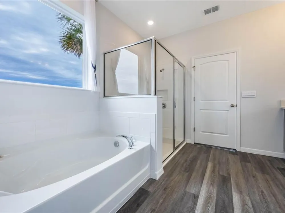 - Eat-in Kitchen, Kitchen/Family Room Combo, Open Floorplan, Solid Surface Counters, Split Bedrooms, Stone Counters, Thermostat, Tray Ceiling(s), Walk-In Closet(s)