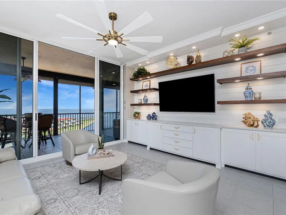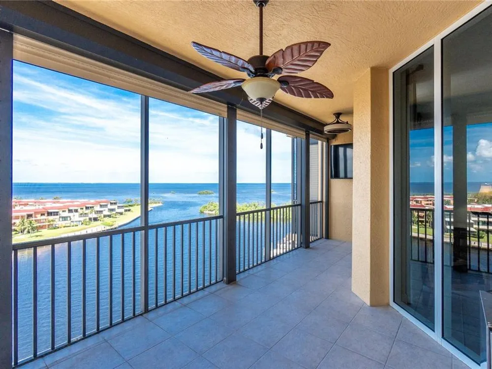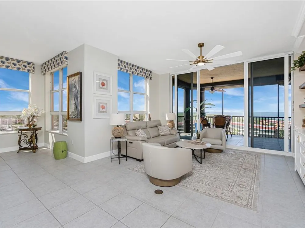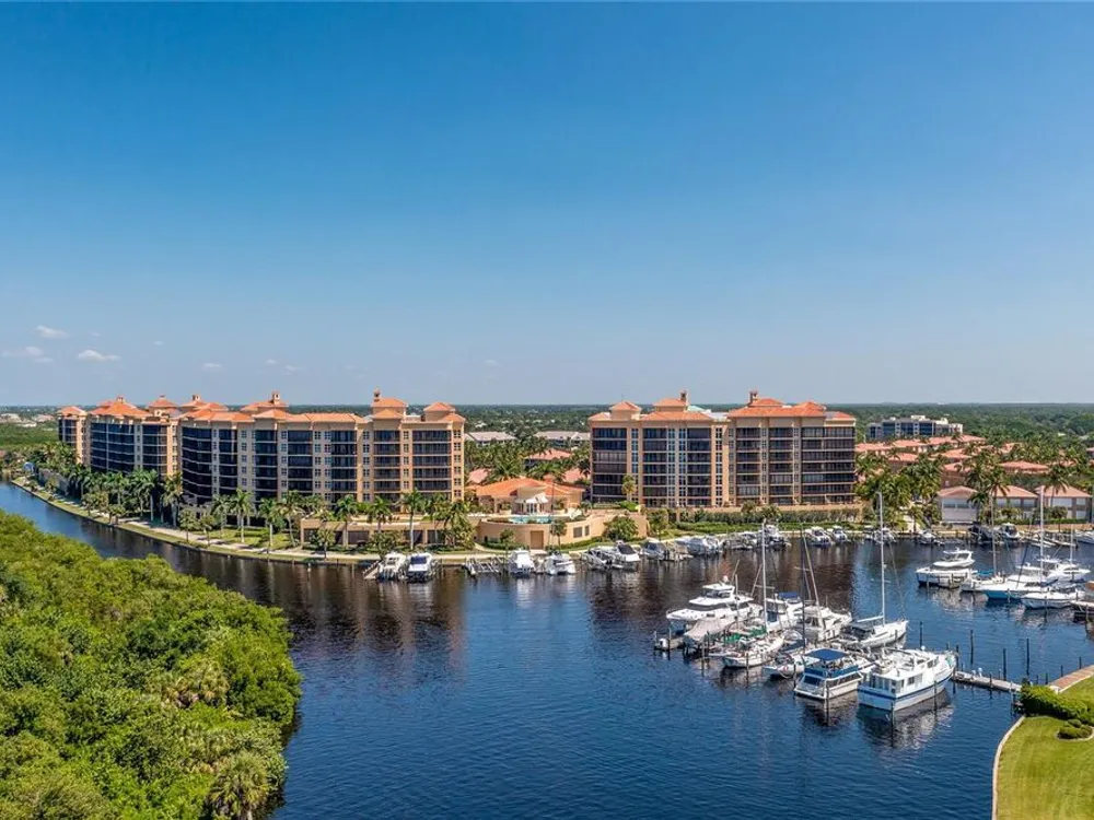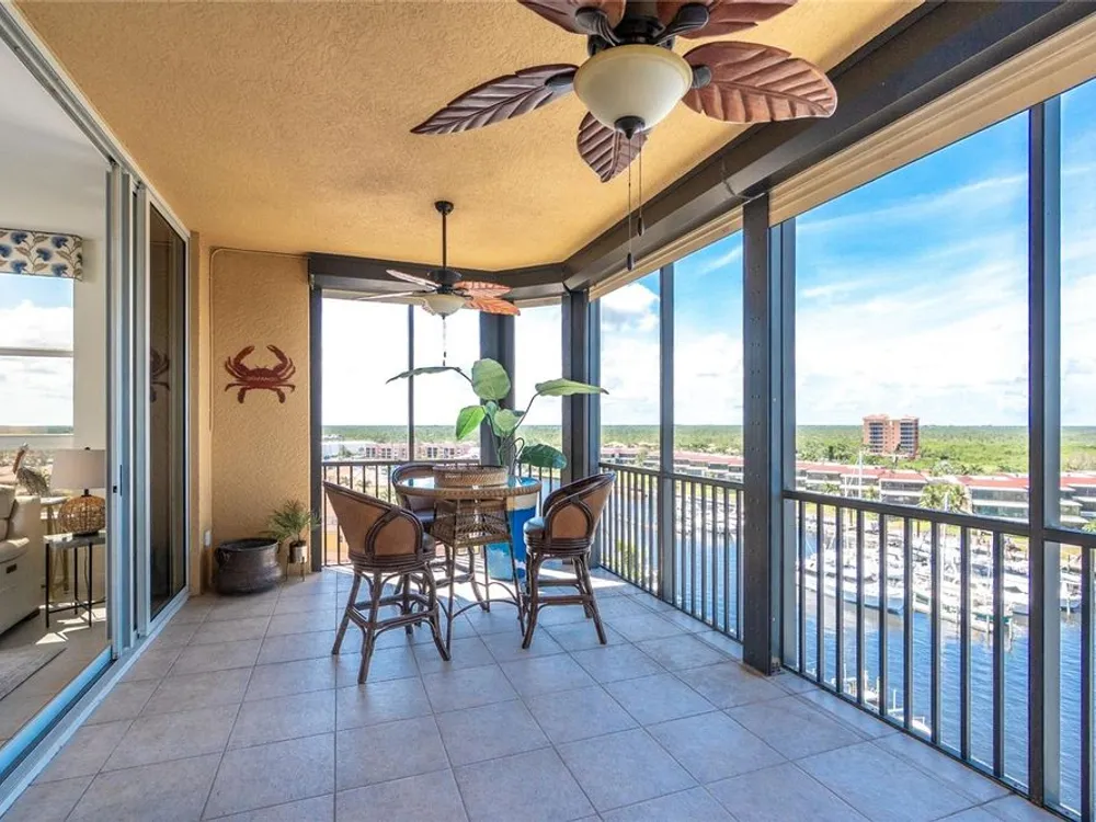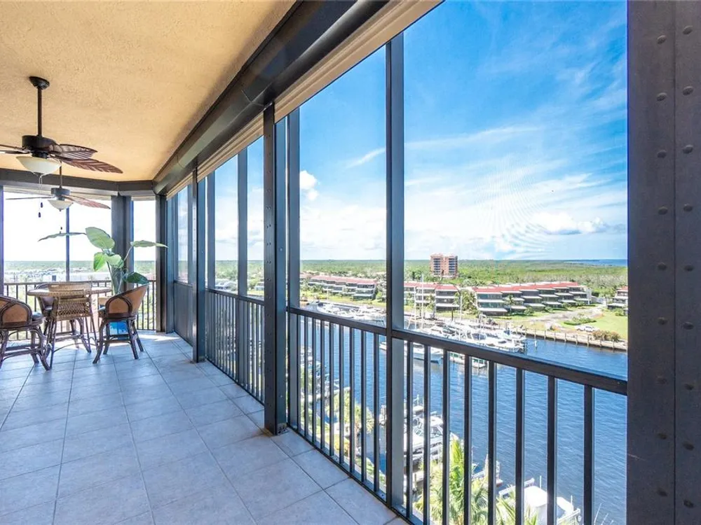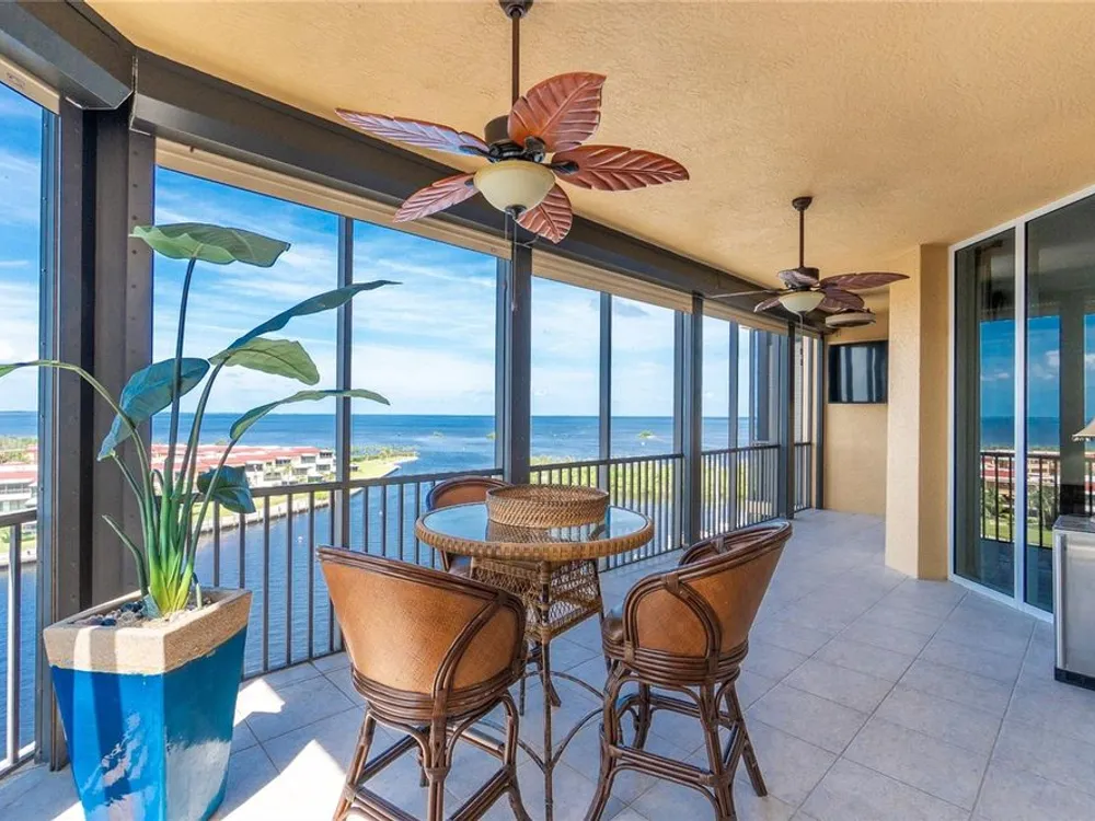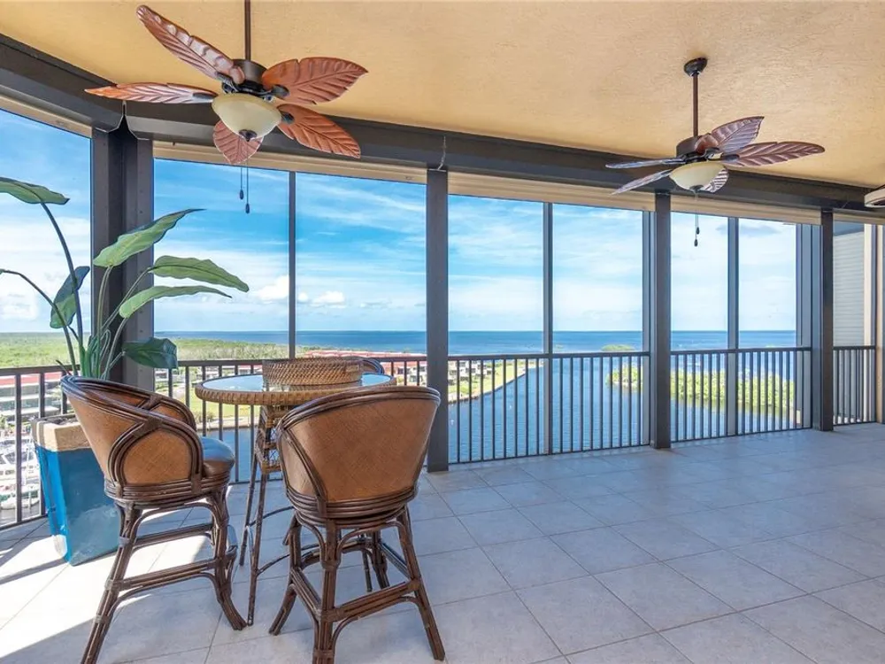 Exceptional opportunity awaits for luxurious waterfront living in this updated, rarely available end-unit penthouse in Grand Isle Towers. Perfectly positioned on the south end of the top floor with direct views of the marina channel entrance, Charlotte Harbor and the south marina basin. You will not only enjoy colorful Florida sunsets and magical sunrises from your tiled and screened lanai, but also from many rooms inside. Pleasing volume ceilings and walls of glass help to flood the space of this FULLY FURNISHED residence with natural light, offering panoramic water views from nearly every room. The tiled, open-concept living area showcases spectacular views of Charlotte Harbor and boats sailing in and out of the marina’s main channel and is anchored by a striking custom built-in feature wall, complete with handsome illuminated wood display shelving mounted on ship lap and custom recessed accent lighting. A sprawling quartz surface tops off custom Amish cabinet and drawer storage with goldtone hardware—creating a stylish and functional focal point. The bright open kitchen makes entertaining a pleasure, featuring a large breakfast bar, abundant cabinets with expansive granite tops, and Whirlpool stainless steel appliances. Adjacent to the kitchen, a beautifully designed entertainment bar adds a touch of elegance with custom Amish navy blue cabinetry with gold hardware, with quartz tops and backsplash, glass display cabinets, handy beverage refrigerator drawers, and a True ice maker—perfect for hosting guests in style. The updated primary suite is a private sanctuary, showcasing floor-to-ceiling windows and sliding doors that frame incredible views of the marina and harbor. You'll love the neutral wood plank tile flooring, walk-in closet with custom built-ins, and a spa-inspired customized primary bath featuring dual vanities with quartz countertops, abundant drawer storage, a dedicated cosmetic station, and updated frameless glass walk-in shower with eye-catching tile inlays. The guest wing offers optimal privacy and versatility with two guest bedrooms, and a spacious den with wood flooring. Both guest rooms have LVP flooring and offer views of the lush Sunset Key Lagoon and island pool, and one includes a beautifully appointed ensuite bath with a walk-in shower, custom freestanding vanity, framed mirror and California closet. Enjoy peace of mind, as your stunning views are framed by impact-rated glass doors and windows throughout, and protected by motorized hurricane roll-down shutters on the lanai for added peace of mind. Grand Isle boasts resort-like amenities, including a private fitness center, theater room, grand salon, and an expansive waterfront deck with an Olympic-size geo-thermal heated swimming pool, spa, and grilling area. Residents of Burnt Store Marina enjoy a vibrant recreational lifestyle, with two on-site restaurants, a 27-hole golf course, active pickleball & tennis groups, fitness center, and the largest deepwater marina in SWFL.