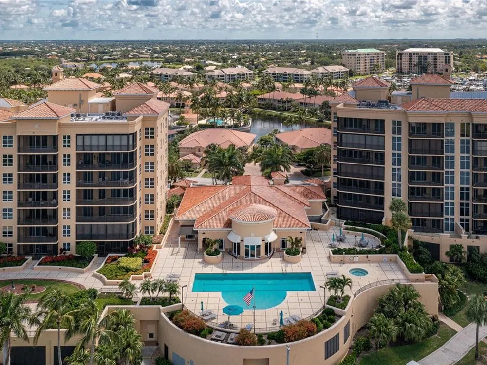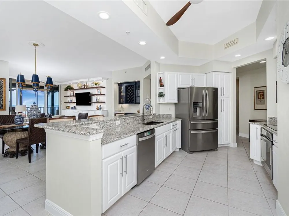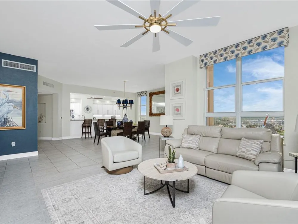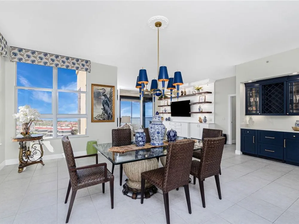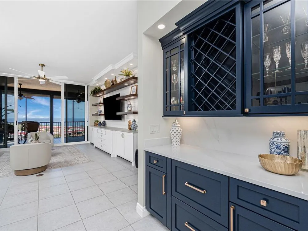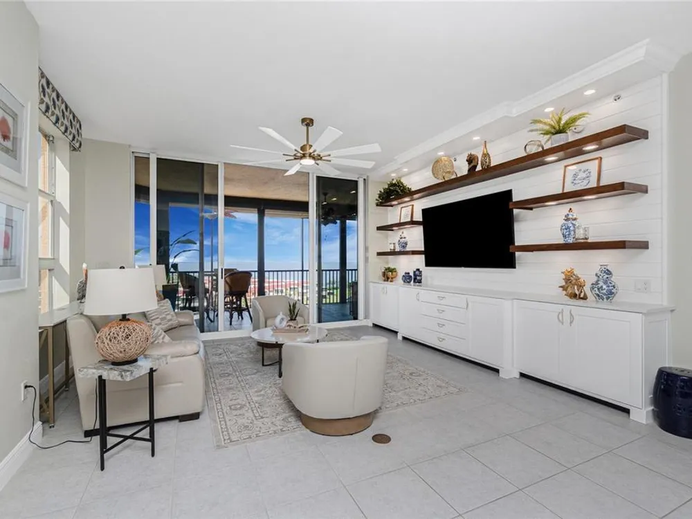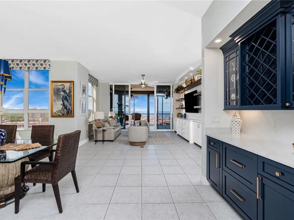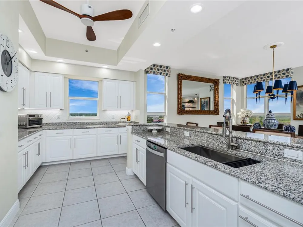 Exceptional opportunity awaits for luxurious waterfront living in this updated, rarely available end-unit penthouse in Grand Isle Towers. Perfectly positioned on the south end of the top floor with direct views of the marina channel entrance, Charlotte Harbor and the south marina basin. You will not only enjoy colorful Florida sunsets and magical sunrises from your tiled and screened lanai, but also from many rooms inside. Pleasing volume ceilings and walls of glass help to flood the space of this FULLY FURNISHED residence with natural light, offering panoramic water views from nearly every room. The tiled, open-concept living area showcases spectacular views of Charlotte Harbor and boats sailing in and out of the marina’s main channel and is anchored by a striking custom built-in feature wall, complete with handsome illuminated wood display shelving mounted on ship lap and custom recessed accent lighting. A sprawling quartz surface tops off custom Amish cabinet and drawer storage with goldtone hardware—creating a stylish and functional focal point. The bright open kitchen makes entertaining a pleasure, featuring a large breakfast bar, abundant cabinets with expansive granite tops, and Whirlpool stainless steel appliances. Adjacent to the kitchen, a beautifully designed entertainment bar adds a touch of elegance with custom Amish navy blue cabinetry with gold hardware, with quartz tops and backsplash, glass display cabinets, handy beverage refrigerator drawers, and a True ice maker—perfect for hosting guests in style. The updated primary suite is a private sanctuary, showcasing floor-to-ceiling windows and sliding doors that frame incredible views of the marina and harbor. You'll love the neutral wood plank tile flooring, walk-in closet with custom built-ins, and a spa-inspired customized primary bath featuring dual vanities with quartz countertops, abundant drawer storage, a dedicated cosmetic station, and updated frameless glass walk-in shower with eye-catching tile inlays. The guest wing offers optimal privacy and versatility with two guest bedrooms, and a spacious den with wood flooring. Both guest rooms have LVP flooring and offer views of the lush Sunset Key Lagoon and island pool, and one includes a beautifully appointed ensuite bath with a walk-in shower, custom freestanding vanity, framed mirror and California closet. Enjoy peace of mind, as your stunning views are framed by impact-rated glass doors and windows throughout, and protected by motorized hurricane roll-down shutters on the lanai for added peace of mind. Grand Isle boasts resort-like amenities, including a private fitness center, theater room, grand salon, and an expansive waterfront deck with an Olympic-size geo-thermal heated swimming pool, spa, and grilling area. Residents of Burnt Store Marina enjoy a vibrant recreational lifestyle, with two on-site restaurants, a 27-hole golf course, active pickleball & tennis groups, fitness center, and the largest deepwater marina in SWFL.