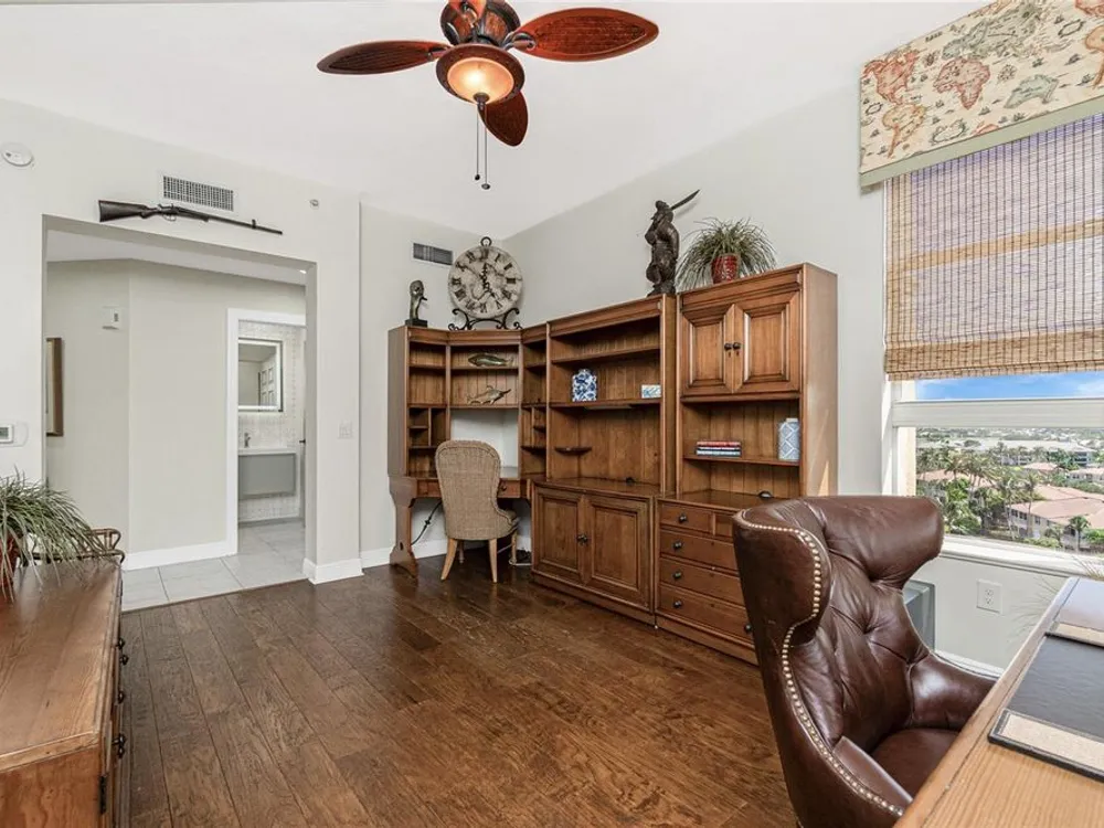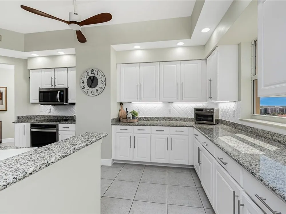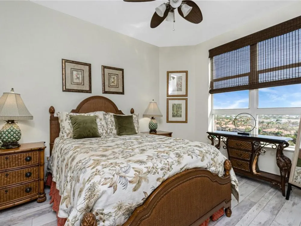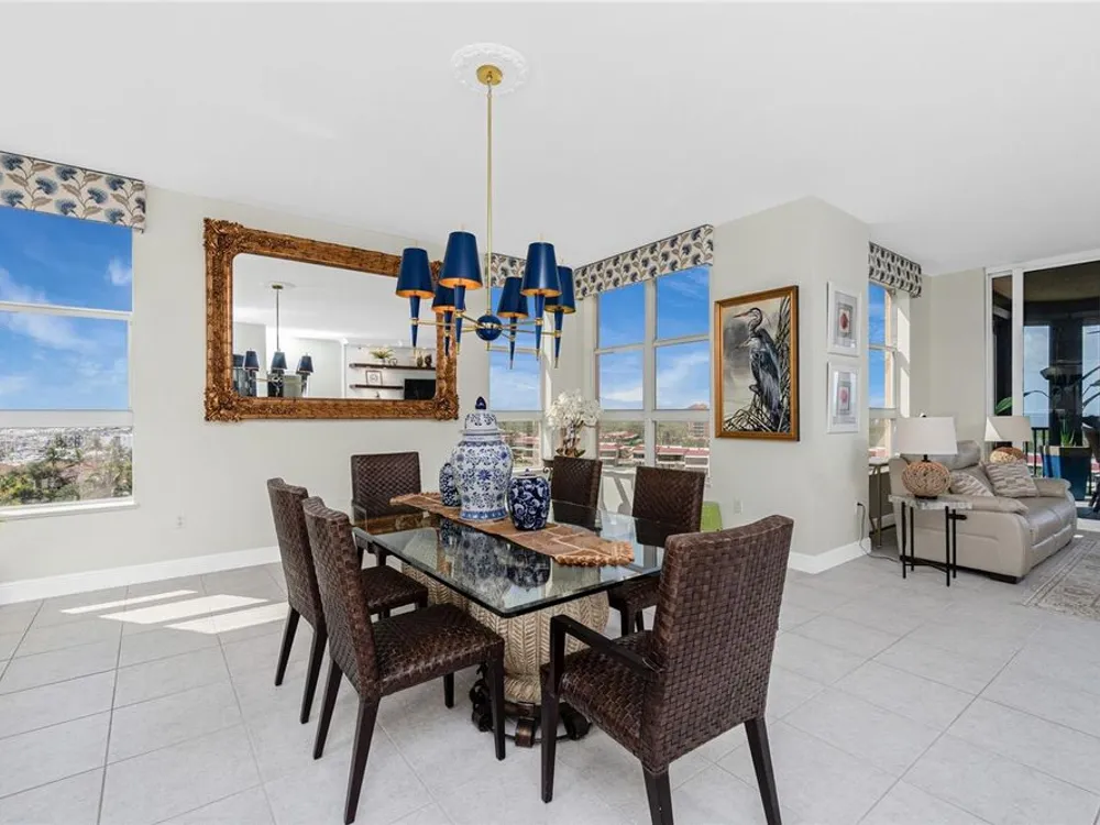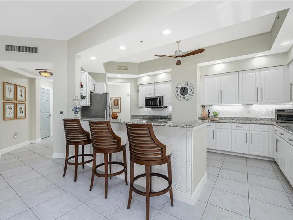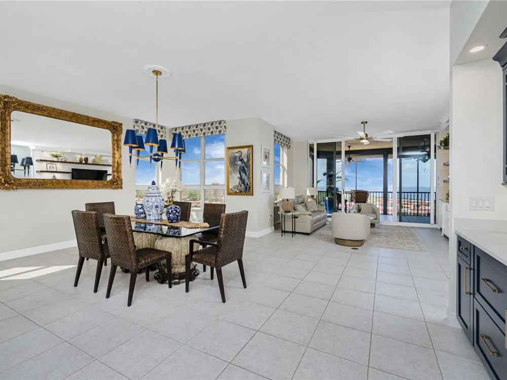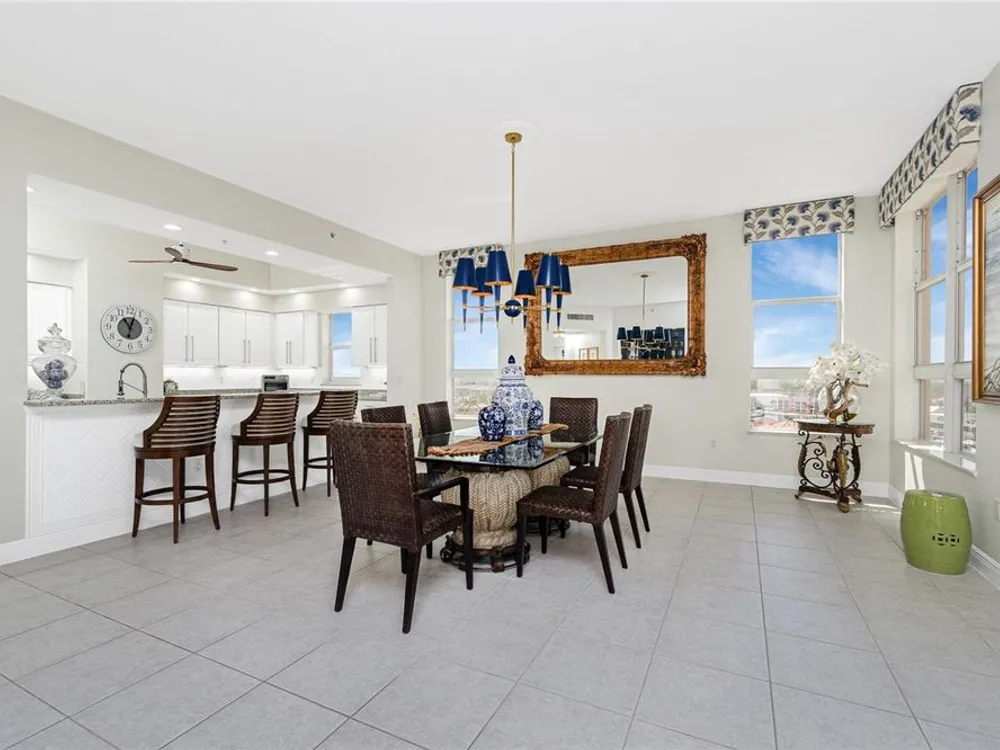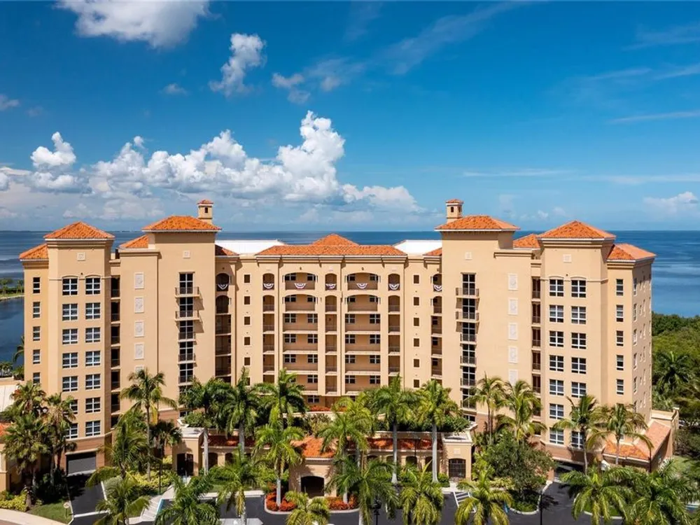 Exceptional opportunity awaits for luxurious waterfront living in this updated, rarely available end-unit penthouse in Grand Isle Towers. Perfectly positioned on the south end of the top floor with direct views of the marina channel entrance, Charlotte Harbor and the south marina basin. You will not only enjoy colorful Florida sunsets and magical sunrises from your tiled and screened lanai, but also from many rooms inside. Pleasing volume ceilings and walls of glass help to flood the space of this FULLY FURNISHED residence with natural light, offering panoramic water views from nearly every room. The tiled, open-concept living area showcases spectacular views of Charlotte Harbor and boats sailing in and out of the marina’s main channel and is anchored by a striking custom built-in feature wall, complete with handsome illuminated wood display shelving mounted on ship lap and custom recessed accent lighting. A sprawling quartz surface tops off custom Amish cabinet and drawer storage with goldtone hardware—creating a stylish and functional focal point. The bright open kitchen makes entertaining a pleasure, featuring a large breakfast bar, abundant cabinets with expansive granite tops, and Whirlpool stainless steel appliances. Adjacent to the kitchen, a beautifully designed entertainment bar adds a touch of elegance with custom Amish navy blue cabinetry with gold hardware, with quartz tops and backsplash, glass display cabinets, handy beverage refrigerator drawers, and a True ice maker—perfect for hosting guests in style. The updated primary suite is a private sanctuary, showcasing floor-to-ceiling windows and sliding doors that frame incredible views of the marina and harbor. You'll love the neutral wood plank tile flooring, walk-in closet with custom built-ins, and a spa-inspired customized primary bath featuring dual vanities with quartz countertops, abundant drawer storage, a dedicated cosmetic station, and updated frameless glass walk-in shower with eye-catching tile inlays. The guest wing offers optimal privacy and versatility with two guest bedrooms, and a spacious den with wood flooring. Both guest rooms have LVP flooring and offer views of the lush Sunset Key Lagoon and island pool, and one includes a beautifully appointed ensuite bath with a walk-in shower, custom freestanding vanity, framed mirror and California closet. Enjoy peace of mind, as your stunning views are framed by impact-rated glass doors and windows throughout, and protected by motorized hurricane roll-down shutters on the lanai for added peace of mind. Grand Isle boasts resort-like amenities, including a private fitness center, theater room, grand salon, and an expansive waterfront deck with an Olympic-size geo-thermal heated swimming pool, spa, and grilling area. Residents of Burnt Store Marina enjoy a vibrant recreational lifestyle, with two on-site restaurants, a 27-hole golf course, active pickleball & tennis groups, fitness center, and the largest deepwater marina in SWFL.