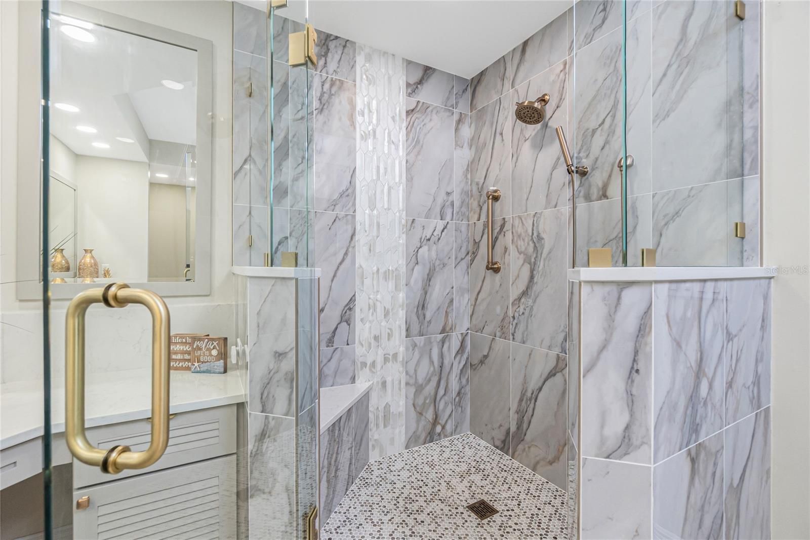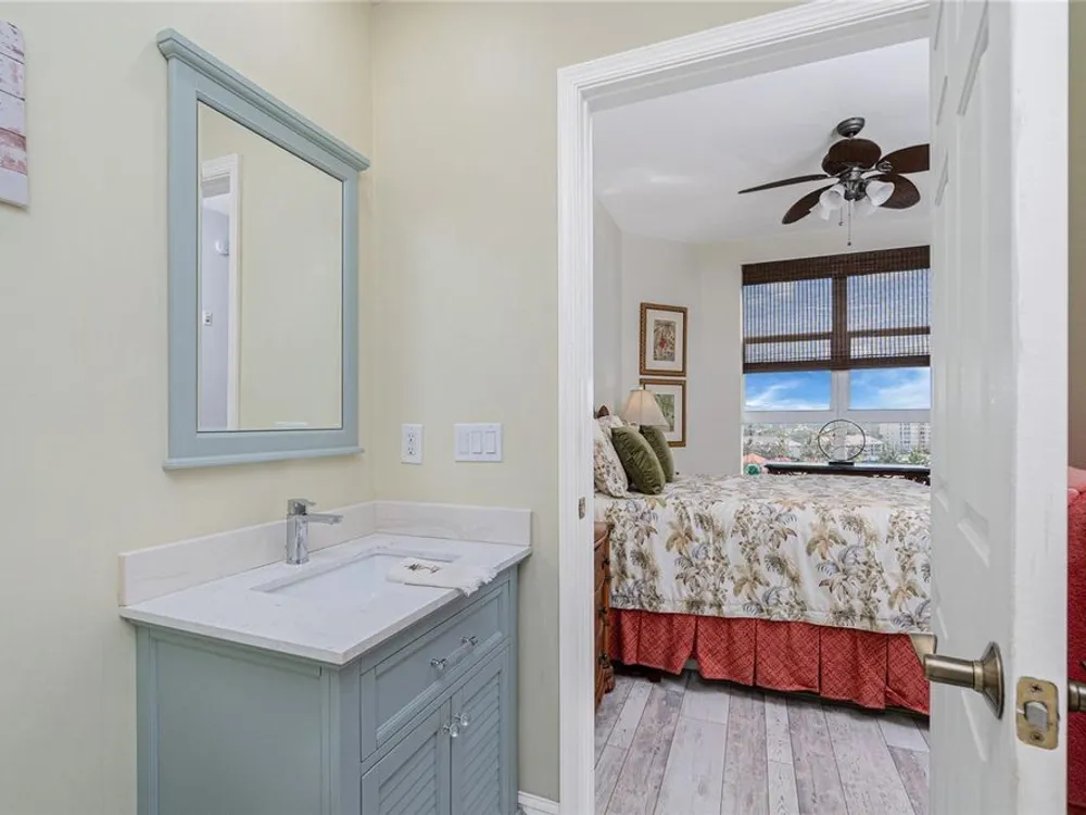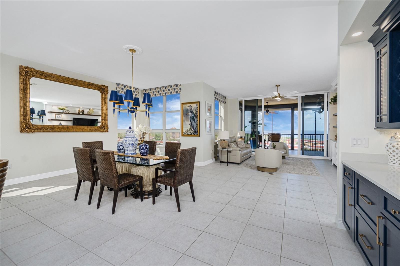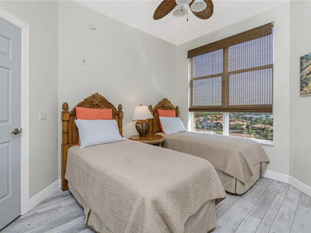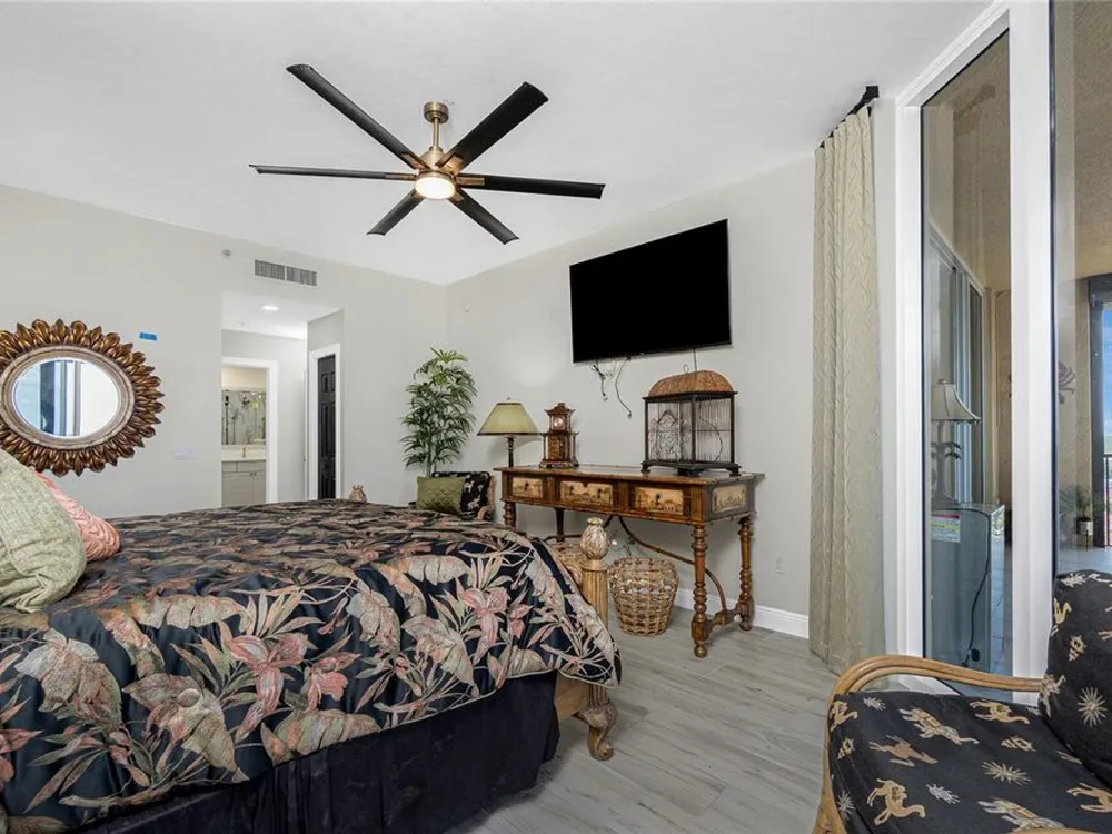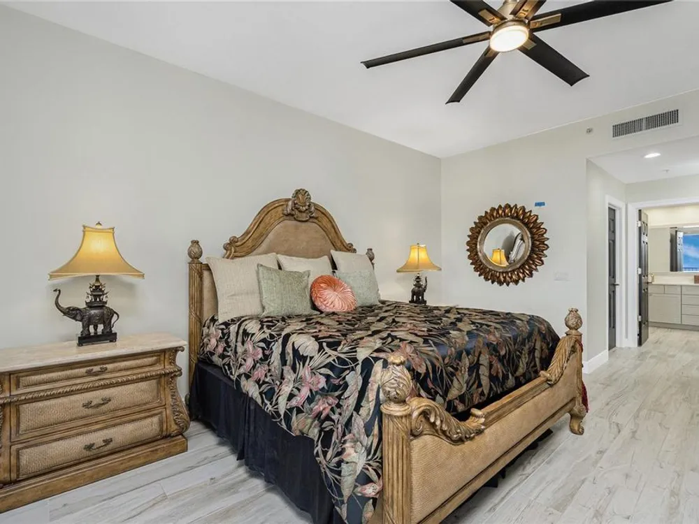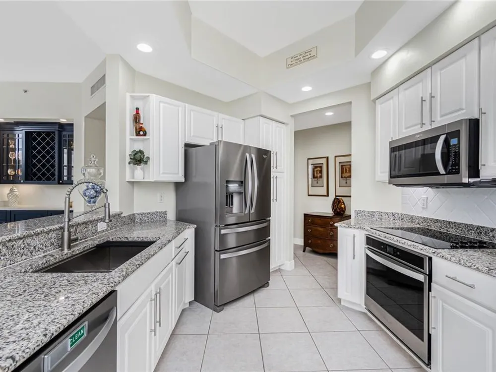 Exceptional opportunity awaits for luxurious waterfront living in this updated, rarely available end-unit penthouse in Grand Isle Towers. Perfectly positioned on the south end of the top floor with direct views of the marina channel entrance, Charlotte Harbor and the south marina basin. You will not only enjoy colorful Florida sunsets and magical sunrises from your tiled and screened lanai, but also from many rooms inside. Pleasing volume ceilings and walls of glass help to flood the space of this FULLY FURNISHED residence with natural light, offering panoramic water views from nearly every room. The tiled, open-concept living area showcases spectacular views of Charlotte Harbor and boats sailing in and out of the marina’s main channel and is anchored by a striking custom built-in feature wall, complete with handsome illuminated wood display shelving mounted on ship lap and custom recessed accent lighting. A sprawling quartz surface tops off custom Amish cabinet and drawer storage with goldtone hardware—creating a stylish and functional focal point. The bright open kitchen makes entertaining a pleasure, featuring a large breakfast bar, abundant cabinets with expansive granite tops, and Whirlpool stainless steel appliances. Adjacent to the kitchen, a beautifully designed entertainment bar adds a touch of elegance with custom Amish navy blue cabinetry with gold hardware, with quartz tops and backsplash, glass display cabinets, handy beverage refrigerator drawers, and a True ice maker—perfect for hosting guests in style. The updated primary suite is a private sanctuary, showcasing floor-to-ceiling windows and sliding doors that frame incredible views of the marina and harbor. You'll love the neutral wood plank tile flooring, walk-in closet with custom built-ins, and a spa-inspired customized primary bath featuring dual vanities with quartz countertops, abundant drawer storage, a dedicated cosmetic station, and updated frameless glass walk-in shower with eye-catching tile inlays. The guest wing offers optimal privacy and versatility with two guest bedrooms, and a spacious den with wood flooring. Both guest rooms have LVP flooring and offer views of the lush Sunset Key Lagoon and island pool, and one includes a beautifully appointed ensuite bath with a walk-in shower, custom freestanding vanity, framed mirror and California closet. Enjoy peace of mind, as your stunning views are framed by impact-rated glass doors and windows throughout, and protected by motorized hurricane roll-down shutters on the lanai for added peace of mind. Grand Isle boasts resort-like amenities, including a private fitness center, theater room, grand salon, and an expansive waterfront deck with an Olympic-size geo-thermal heated swimming pool, spa, and grilling area. Residents of Burnt Store Marina enjoy a vibrant recreational lifestyle, with two on-site restaurants, a 27-hole golf course, active pickleball & tennis groups, fitness center, and the largest deepwater marina in SWFL.