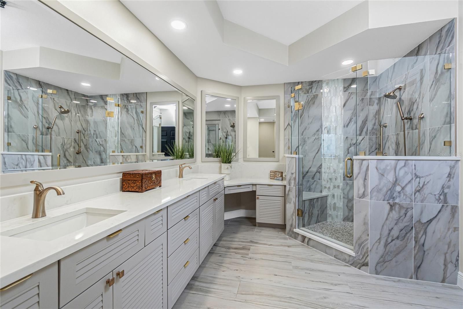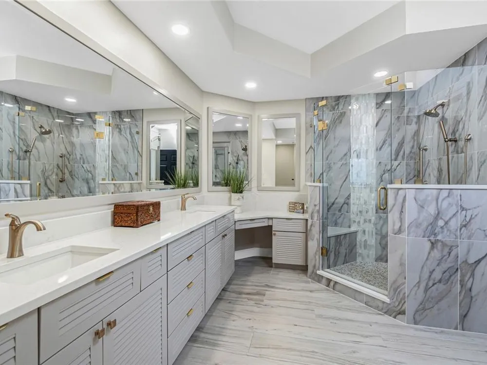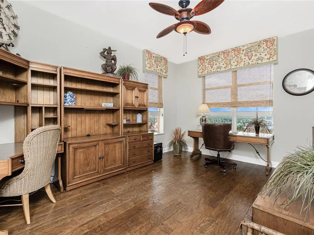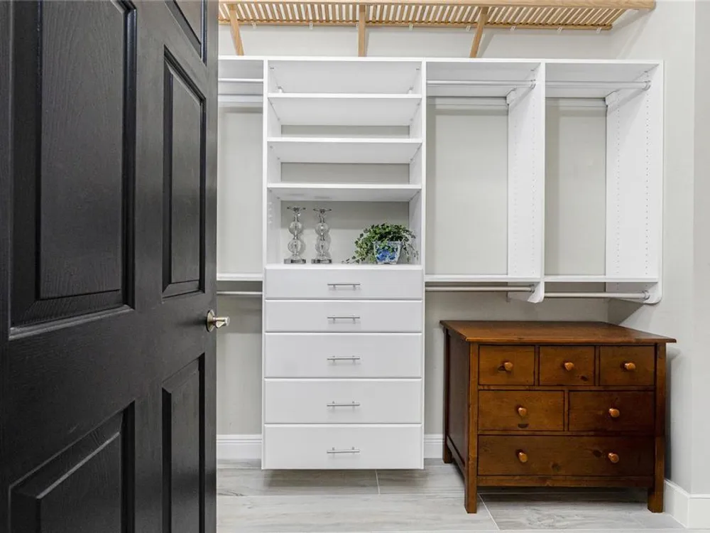 - Ceiling Fan(s), Crown Molding, Dry Bar, High Ceilings, Open Floorplan, Main Level Primary, Split Bedrooms, Stone Counters, Thermostat, Tray Ceiling(s), Walk-In Closet(s), Window Treatments