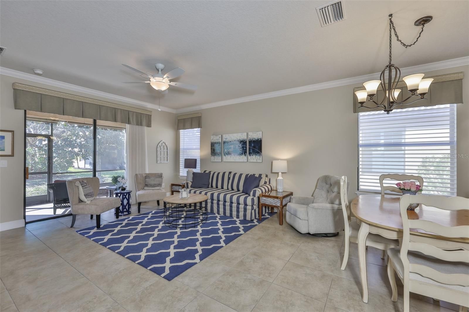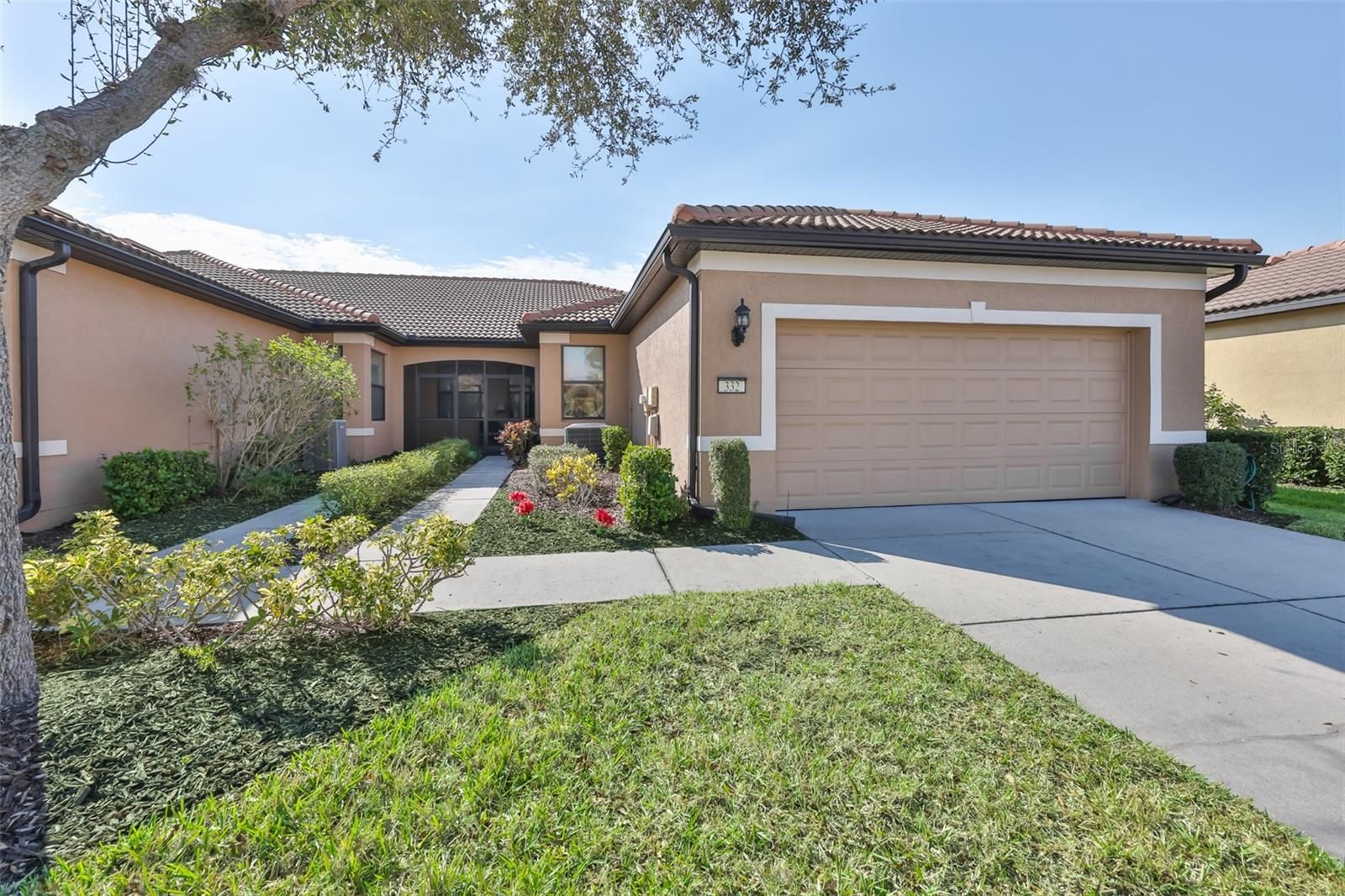 This is THE ONE you NEED TO SEE in Del Webb Southshore Falls 55+ Guard Gated Community! This highly sought after End Unit, 1,616 sq ft villa is Completely TURN-KEY FURNISHED, EVERYTHING IS INCLUDED, ALL Furniture, including Bedroom Sets, Office Furniture, T.V.s, Living Room Set, ALL Artwork and decorative items, ALL household items, from pots and pans to kitchenware... basically Everything from Soup to Nuts and Patio furniture too! Just bring your toothbrush! Meticulously maintained, MODEL PERFECT this "Cascadia" Villa has 2 main Bedrooms, 2 Baths plus Office/Flex Room(or 3rd bedroom), 2 car garage, Relaxing PRIVATE Lanai and is MOVE-IN READY!! As you step into the Foyer, you will know you've found the perfect place to call home! You will feel the Richness and Quality from the Ceilings trimmed with Crown Molding to the 14" Tiled floors accented with 5" baseboards, beautiful Engineered Hardwood Floors in the office/den (which includes double size DayBed), Chest of Drawers, and Desk set and light wood Laminate in the other Guest bedroom! The Gourmet Kitchen has Crowned top solid Light CherryWood Cabinets with Pull-Out drawer, Granite countertops, tiled backsplash, Stainless Steel Appliances, Large Pantry, Kitchen nook with table and Breakfast Bar with tiled front PLUS a Dining room area! NEW HVAC SYSTEM in 2022 and NEW WATER HEATER in 2023! The Primary Suite is very spacious with a huge Walk-in Closet plus additional wall closet, and En-Suite bathroom with GRANITE counter tops, Dual Sinks and Step-in TILED Shower with bench. The 2nd bedroom is very accommodating! The split floor plan affords your guests privacy and is just steps away from the guest bathroom, accented with Granite Counters, Tub & Shower! The Flex room makes a great office or 3rd bedroom! Inside Laundry has a NEW Washer and includes Dryer. Open Floor plan and expansive Great room with built-in Entertainment Center leads out to your Private Screened Tiled Lanai, secluded with plants and trees where you can sip your coffee in the morning or enjoy a glass of wine and entertain in the evenings! The 2 car garage has plenty of storage including work Bench and Built-in Shelving above garage door and shelves along sides, finished garage floor, utility sink, attic space and Auto Door Opener. So many extras you must see including: Screened in front tiled porch plus additional screen door, Ceiling fans throughout, Dual Pane Windows, Custom Window Treatments with mini Valances, Pull-out drawer in kitchen and security system. This Villa was originally designed as a model home and it has so many upgrades you MUST SEE! Enjoy Resort-style living in this 24-hour Guard Gated Community...Florida's Best Kept Secret Beyond Compare... Very low HOAs (NO CDDs) Pets Welcome! Spectacular recreation area in a Vacation-Style setting with Lagoon Heated pool, Resistance Pool, Spa, state-of-the-art Fitness Center, Water Aerobics, Bike Club, Walking Trails, Golf putting greens, Bocce & Pickle Ball & Tennis courts, Arts and Crafts, Billiards, Library, Card Clubs, Internet café and so many daily activities and Entertainment in the Expansive Clubhouse! Very close to World Renowned Sugar Sand beaches in any direction, Golf Courses, a public boat launch, Freedom Boat Club, Tampa Bay City Life, International Airports and Hospitals. So, Come on, get away from it all at Del Webb SouthShore Falls Paradise and Live, Laugh, and Love Life!