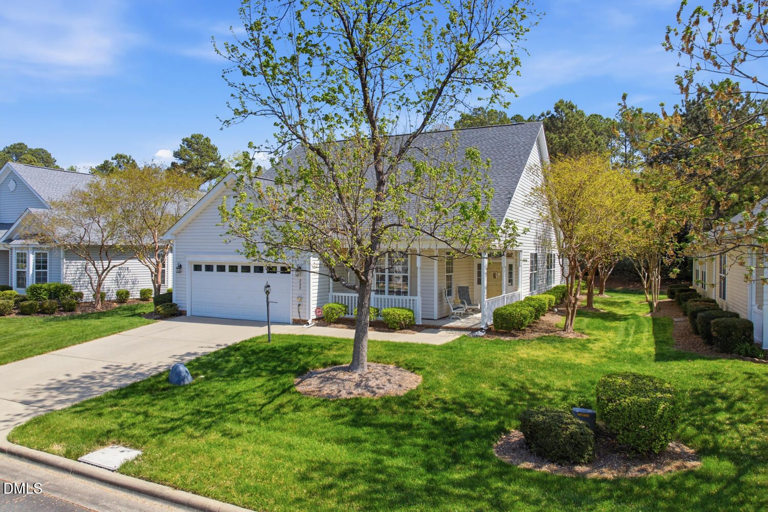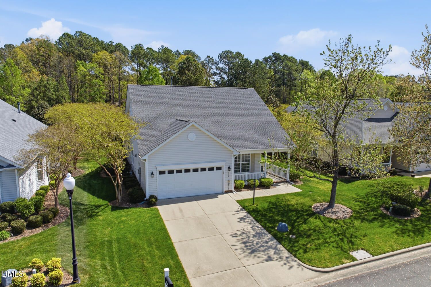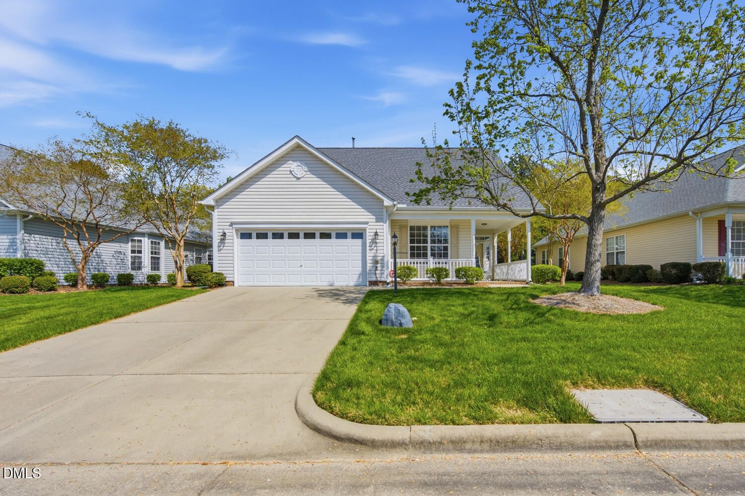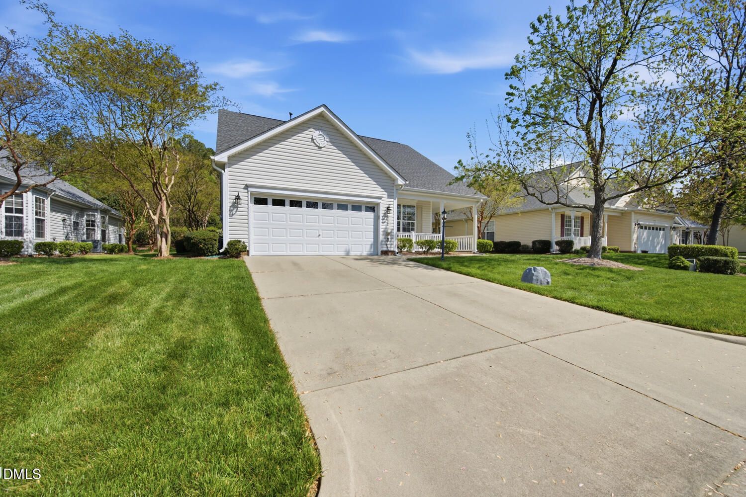 Enjoy active adult living in an ideal Cary location in Heritage Pines. This charming, like-new transitional ranch offers a bright, open, and versatile design with thoughtful details throughout. The spacious kitchen features granite countertops, 42'' maple cabinets, a serving bar, and a sunny bay window in the breakfast area, all flowing seamlessly into the family room - perfect for everyday living and entertaining. A striking double-sided fireplace connects the family room and formal living room, creating warmth and ambiance across both spaces. The home also includes a formal dining room, 2 bedrooms plus a study, and a comfortable, functional layout. Step outside to relax on the inviting wrap-around porch or enjoy the rear patio - ideal for outdoor dining or quiet mornings. Additional features include a 2-car garage, security system, and 4-zone irrigation system. Refrigerator, washer, and dryer convey. Located in a sidewalk- and trail-lined community near the Cary Greenway, RTP, RDU, shopping, dining, and major roadways, this home includes access to Heritage Pines' exceptional amenities: clubhouse with library, game room, arts and crafts room, and catering kitchen; fitness center and large gathering space; monthly resident art displays; outdoor pool and hot tub; and tennis, pickleball, bocce ball, and shuffleboard courts. A perfect blend of comfort, convenience, and vibrant community living.