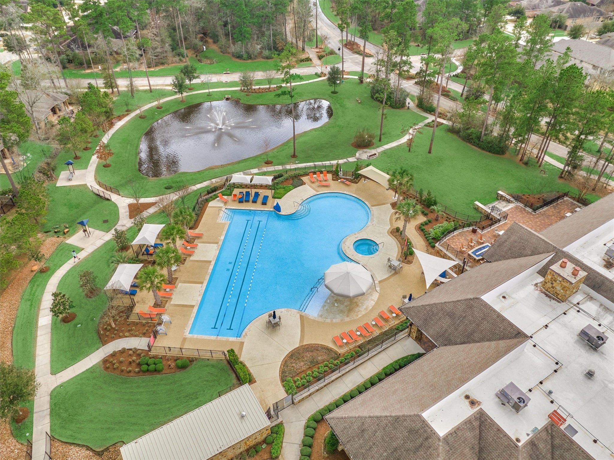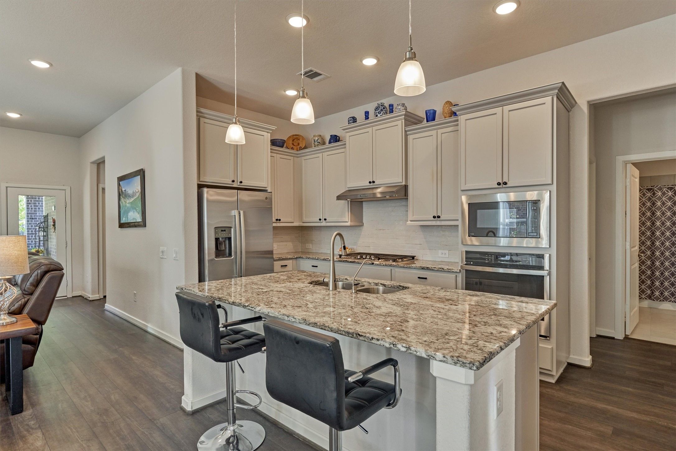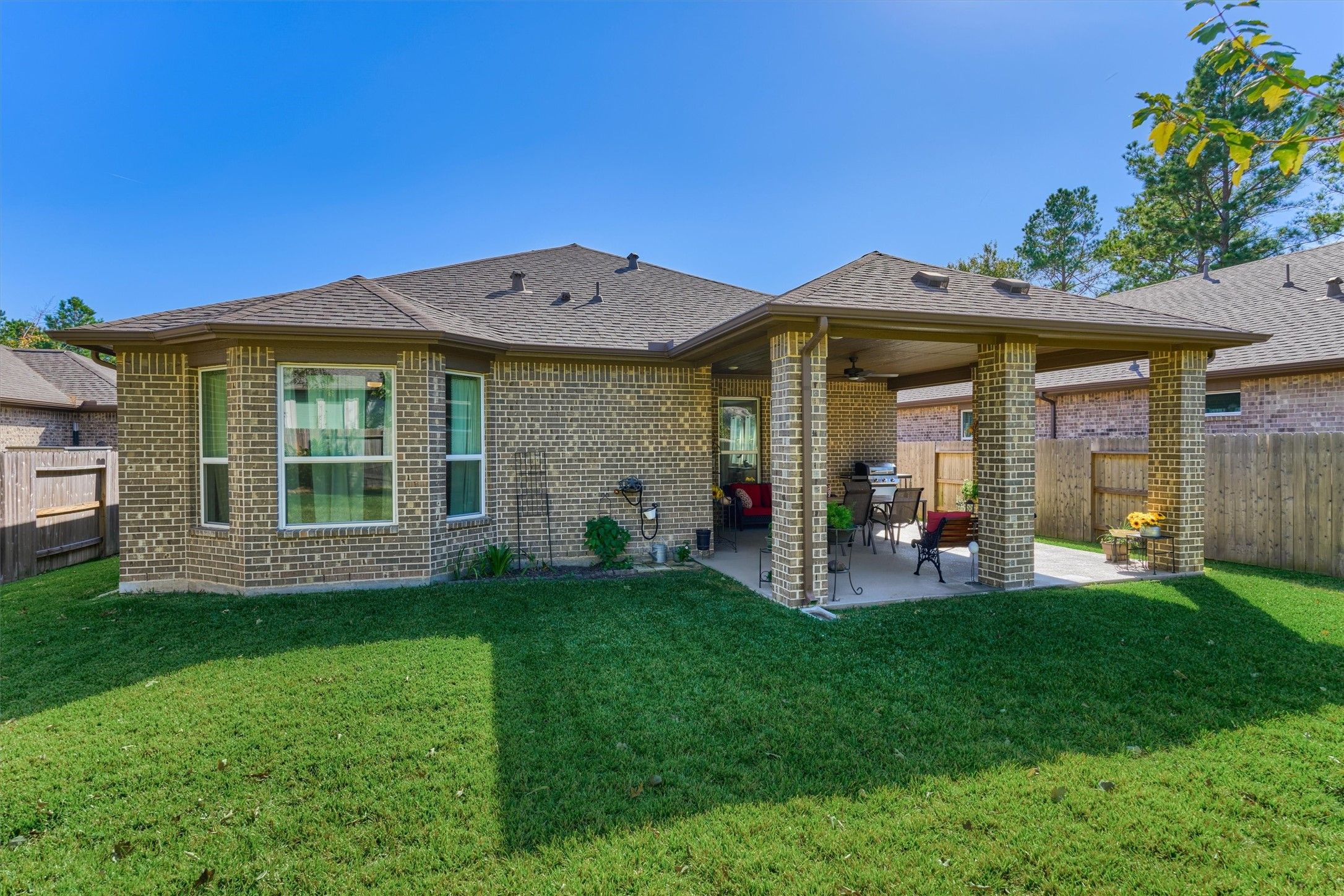 Enjoy easy, low-maintenance living in this beautifully designed one-story home located in the sought-after 55+ community of Bonterra at Woodforest. Designed for comfort and style, this home features a beautifully appointed kitchen with stainless steel appliances, granite countertops, gas cooktop, soft-close drawers, and ample cabinet space. The single-story plan offers an open layout with high ceilings. A dedicated study with French doors offers the perfect space for a home office, hobby room, or quiet retreat. The living area provides great natural light, a cozy gas fireplace, and a warm, inviting atmosphere. The spacious primary suite includes a bay window, dual sinks, and an oversized walk-in shower. Enjoy a covered front porch and large covered back patio—plus a full sprinkler system for easy maintenance. Bonterra offers resort-style amenities including a clubhouse, fitness center, pool, pickleball, trails, and a vibrant social calendar making it easy to stay active and connected.
