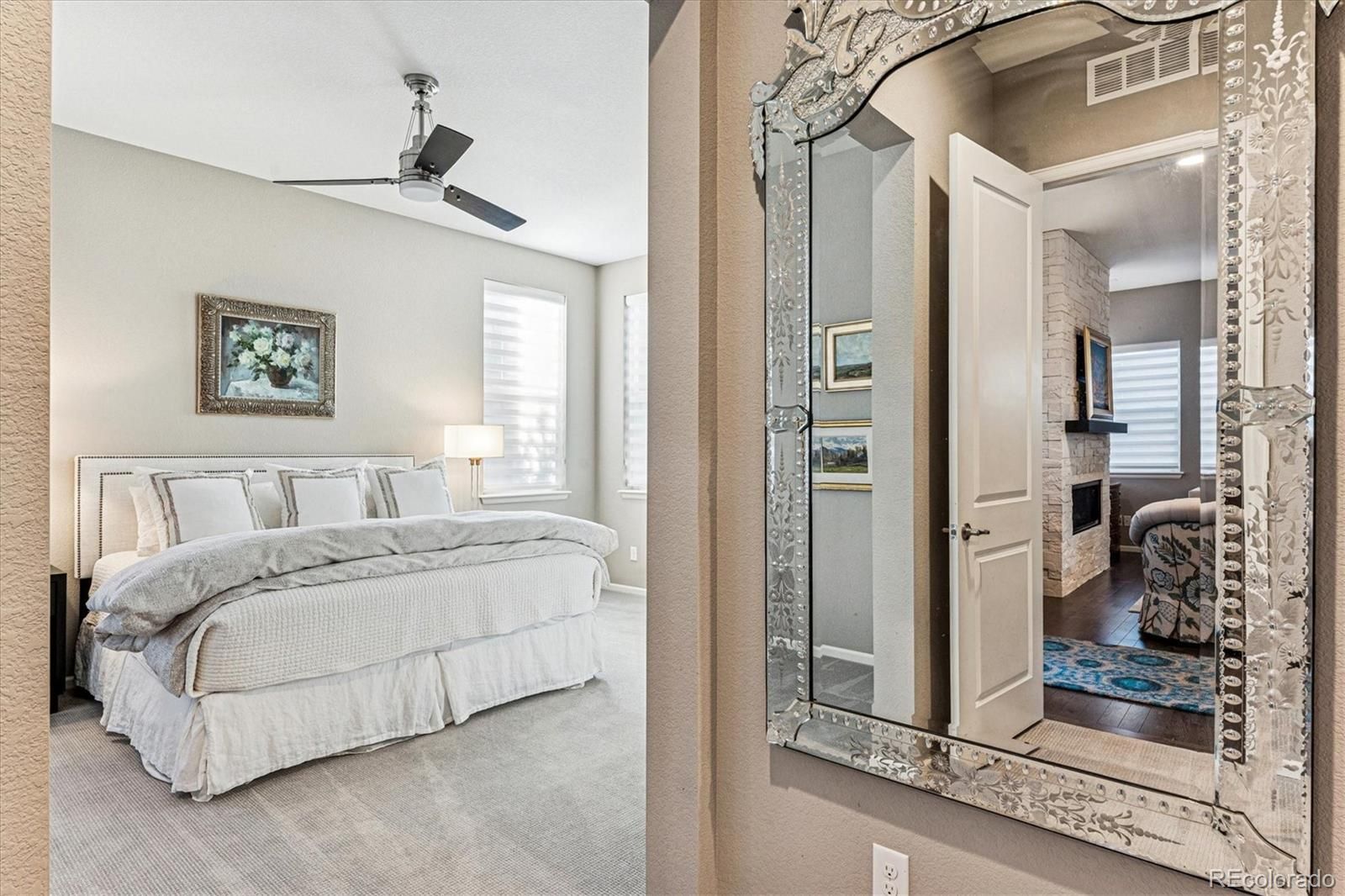 Embrace life in a low-maintenance patio home community! Let the friendly HOA take care of your front lawn and snow shoveling chores, then relax and enjoy home. Ten-foot ceilings and 8’ doors lend a luxe vibe to the open floor plan. French doors—etched glass antiques—open to a commanding mountain view from the study. The spacious kitchen is well appointed with stacked cabinets, a gas cooktop and double ovens, separate pantry, cheerful white quartz tops and a fresh backsplash, plus a grand island with seating. The dining room and great room are open with a stunning fireplace as a focal point. But wait, there’s more! The roomy main floor primary bedroom has a walk-in closet fully built-out and adjustable to keep you organized just the way you like. There’s lots of counterspace and storage in the ensuite bath, plus access to full-sized laundry. A second bedroom has its own ensuite bath, too. The premium lot has an extra wide, fully fenced yard (woof!), plus a “sunset patio” with clear views of the continental divide. More than 2000 sf of unfinished basement accommodate storage and hobby needs, also stubbed for a bath if additional living space is ever desired. It’s nearly impossible to find a property like this with a breathtaking mountain view at this price point. Lock-n-leave, the mountains are calling!