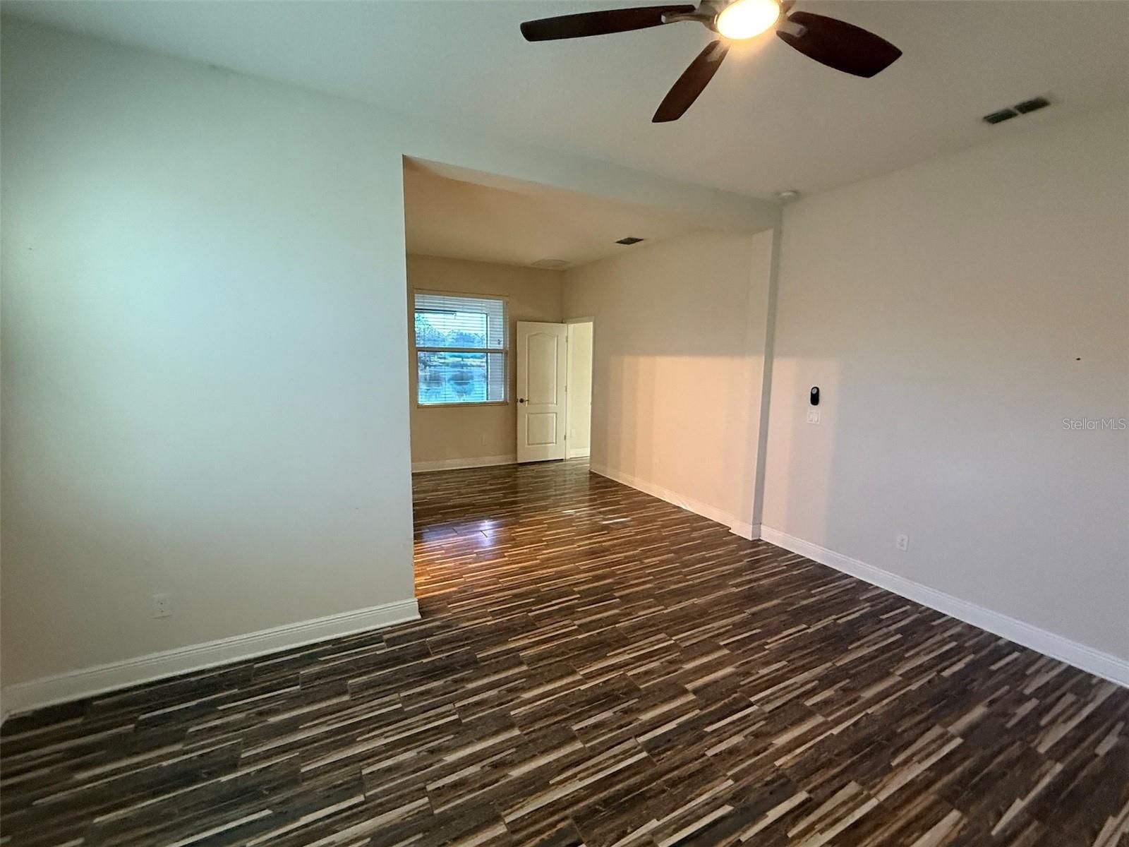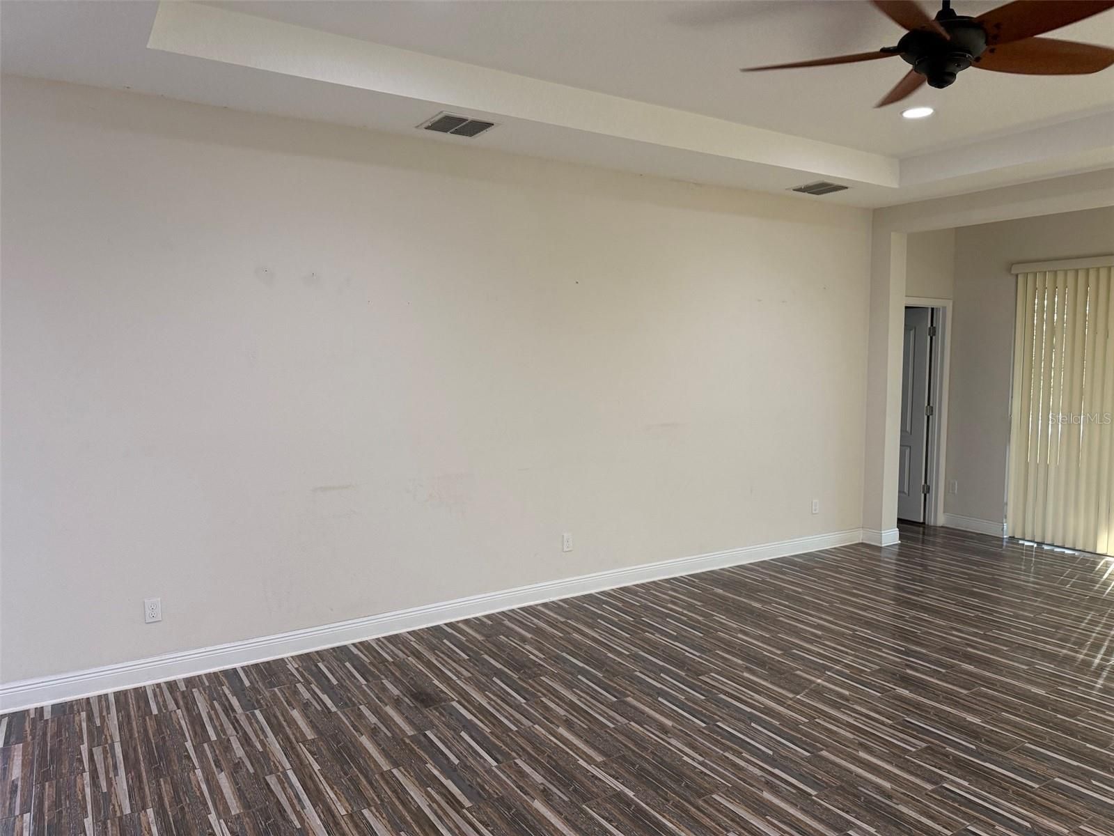 - Ceiling Fan(s), Eat-in Kitchen, High Ceilings, Kitchen/Family Room Combo, Open Floorplan, Main Level Primary, Solid-Wood Cabinets, Split Bedrooms, Stone Counters, Thermostat, Tray Ceiling(s), Walk-In Closet(s)