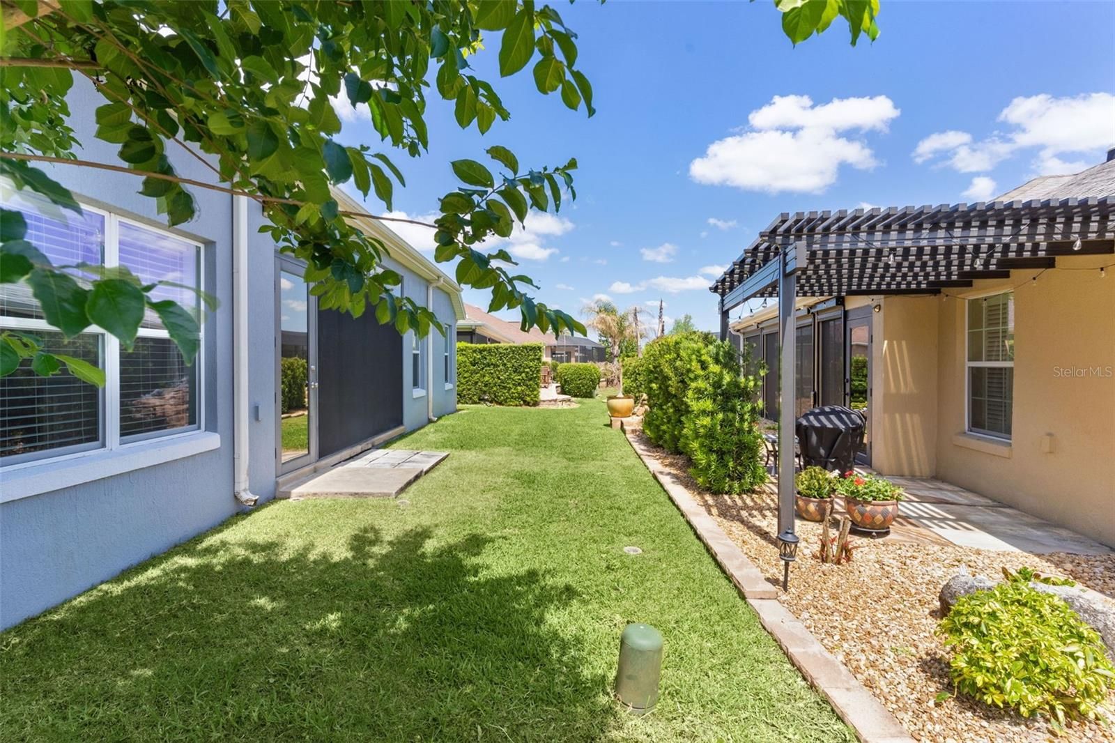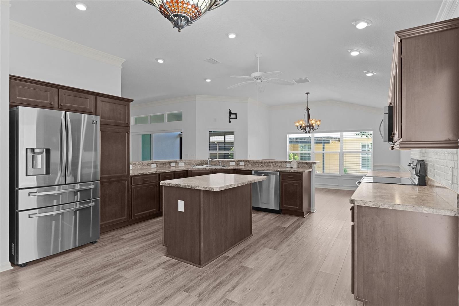 Welcome home to this beautifully maintained 3-bedroom, 2-bath “Holly” model, ideally located in the highly desirable Village of Charlotte. Centrally positioned and gently lived in, this home offers a perfect blend of comfort, style, and convenience. From the moment you arrive, you’ll appreciate the exceptional curb appeal, featuring a stamped concrete driveway and meticulously maintained landscaping. Inside, the home showcases soaring ceilings, laminate flooring, plantation shutters, upgraded lighting and ceiling fans, fresh interior paint, and elegant crown molding throughout. The spacious kitchen is designed for both everyday living and entertaining, offering gas cooking, stainless steel appliances, a center island, built-in desk, abundant cabinetry with pull-out drawers, and a stylish backsplash. The primary suite offers two walk-in closets and an en-suite bath with dual vanities, a linen closet, and a Roman shower. Two additional guest bedrooms offer generous closet space and share an updated bathroom with a walk-in shower. Enjoy year-round outdoor living in the enclosed lanai with acrylic sliders and pull-down shades, creating ideal space for year-round relaxation and entertaining. Additional highlights include an insulated garage, indoor laundry room with utility sink and extra storage, and a peek-a-boo water view in the backyard. Ideally located just minutes to Brownwood Paddock Square and Lake Sumter Landing, with easy access to pools, recreation centers, golf courses, shopping, and dining. This home checks all the boxes—schedule your exclusive showing today!