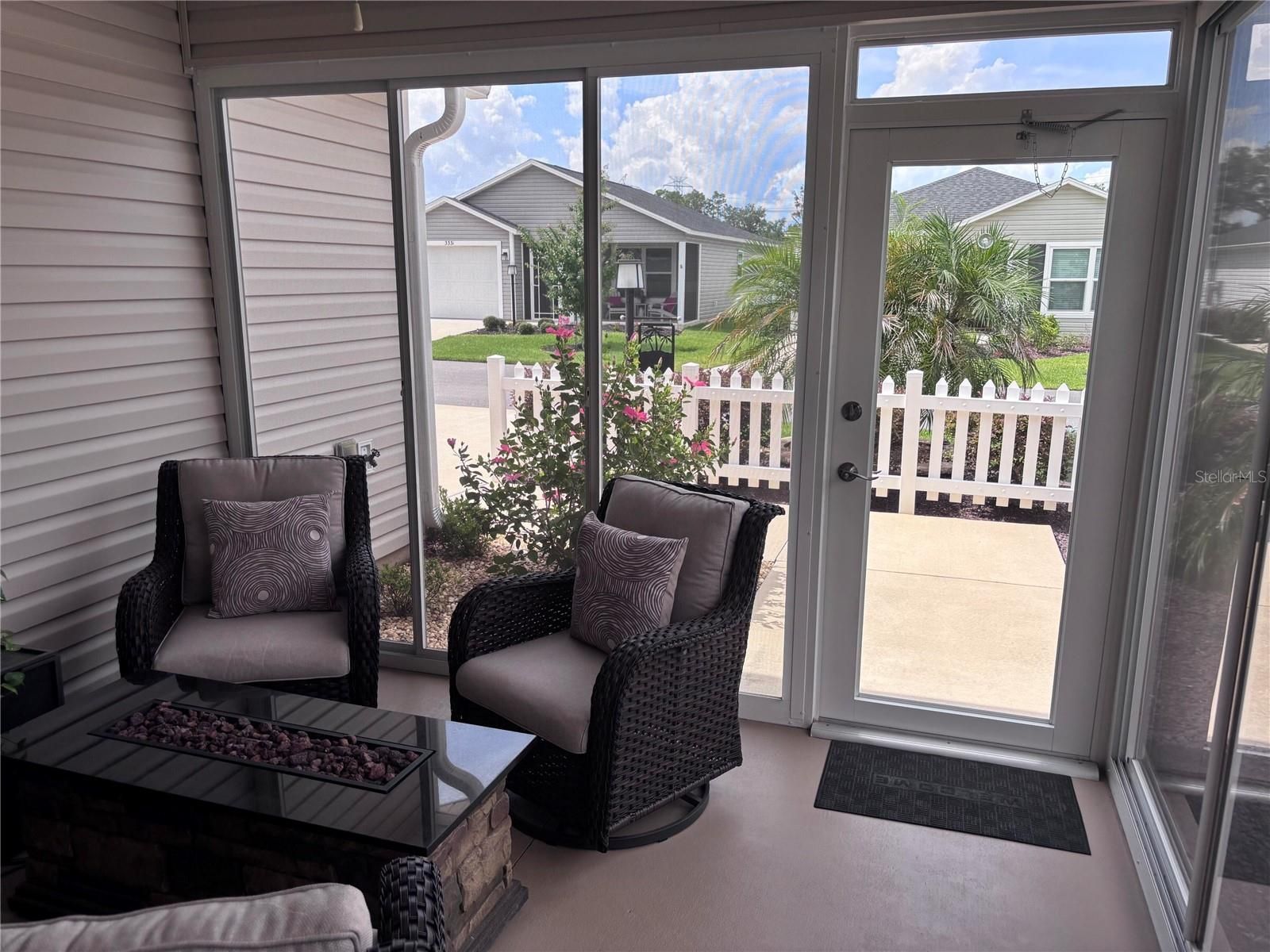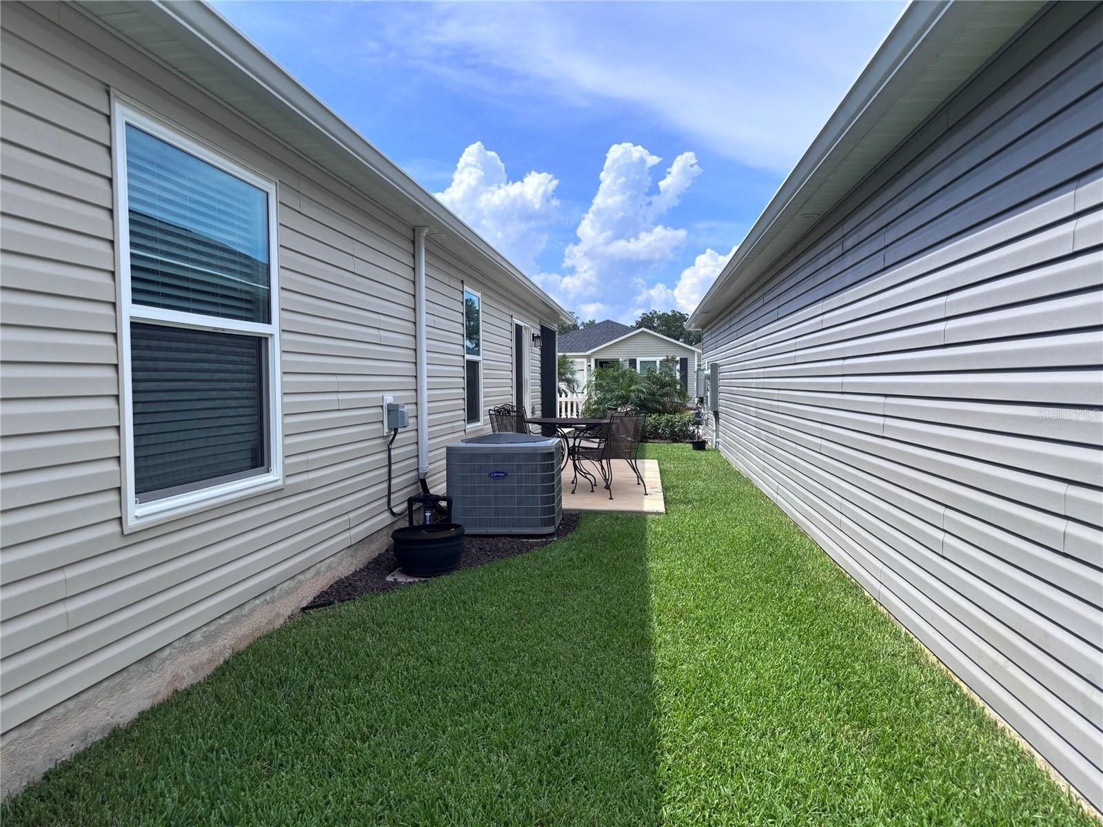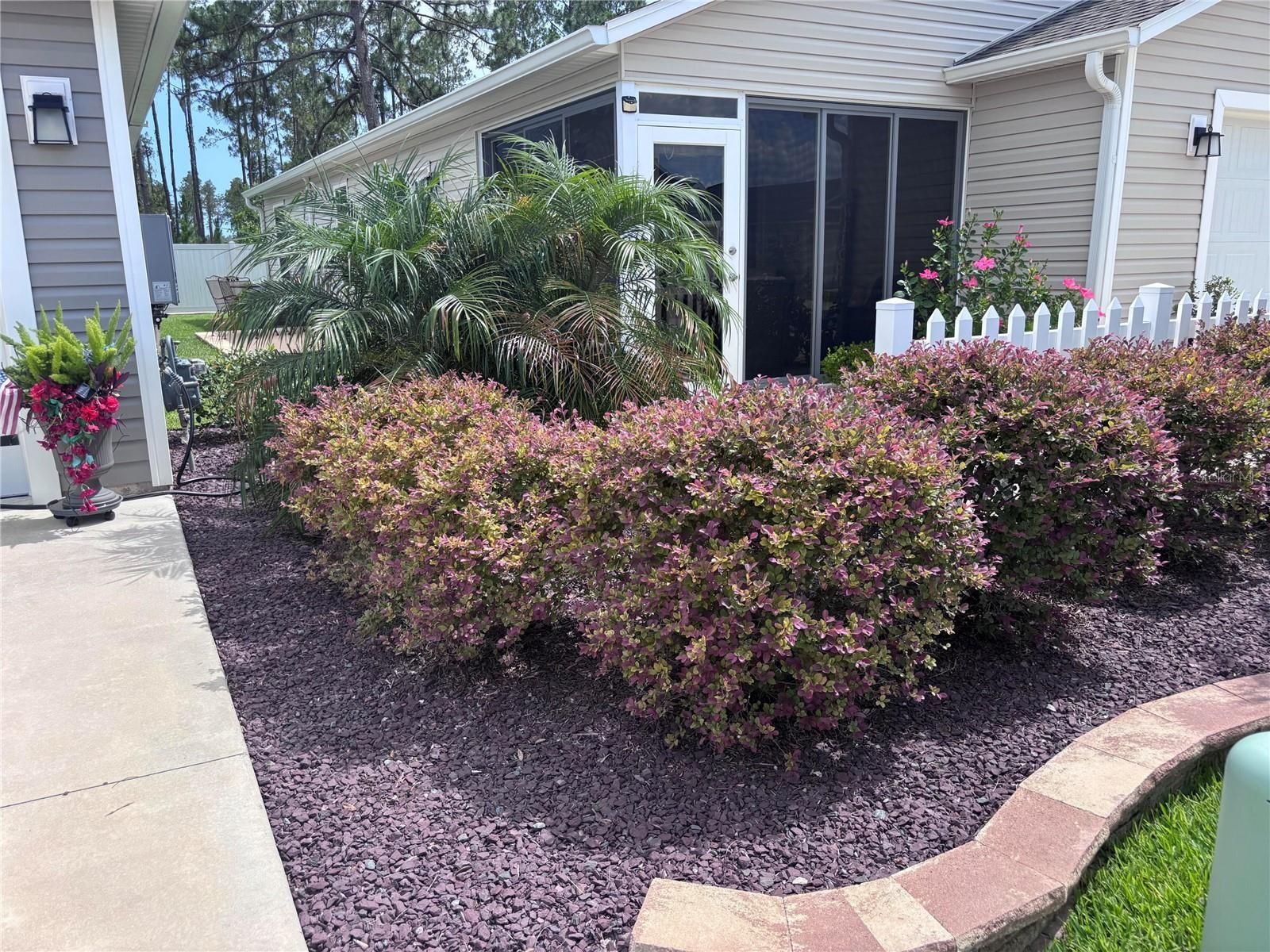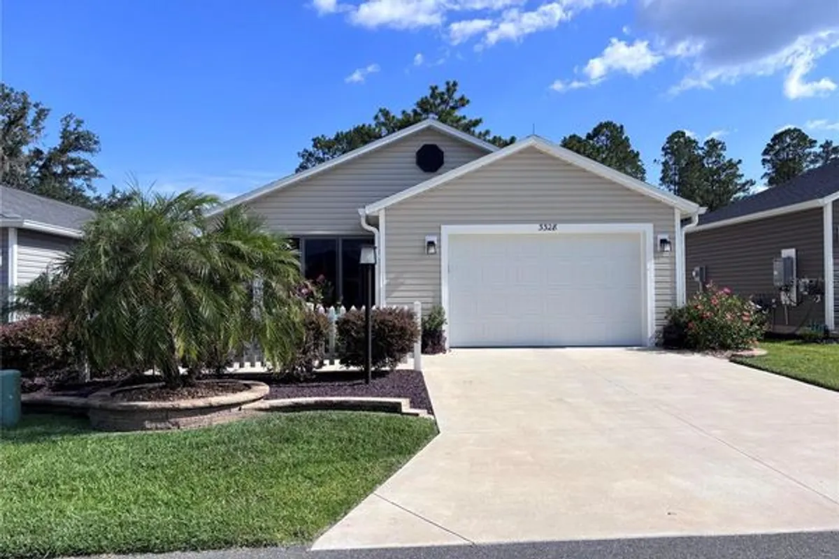 PRICE REDUCTION! Charming 2 bedroom, 2-bathroom patio villa located in The Villages, FL. This well-maintained property offers enhanced landscaping and open floor plan with volume ceilings. A beautiful leaded glass door invites you to explore the spacious villa. The modern kitchen features stainless steel appliances, deep stainless steel double sink, travertine tile backsplash with under cabinet lighting, pendant lights over center island, loads of cabinet space and a built in desk. A solartube in the center of the kitchen brings in an abundance of natural light. Additional storage cabinets have been installed in the laundry, garage, and master bathroom. Also included are ceiling light kits in the bedrooms and a glass shower door in the master bathroom. Enjoy outdoor living in the beautifully landscaped yard with sweeping stacked walls around Robellini Palms and beautiful hibiscus. Find a glass enclosed lanai and side patio to enjoy your morning coffee or evening wine. Bonus upgrades include a lightning rod system, whole house gutters, a solar attic fan, a filter and extra hose bib on the irrigation system, extra insulation over the garage and lanai. The villa built in 2022 comes with Whirlpool washer and gas dryer set. The villa backs to a vinyl fence with no rear neighbors. Just a short golf cart ride over the Water Lily Bridge to Brownwood Paddock Square for shopping, dining and nightly live music. Conveniently situated to recreational amenities, the DeLuna Adult Pool is 1 mile away, Water Lily Recreation Center is less than 2.5 miles away and the Fenney Recreation Center is less than 3 miles away, each with gorgeous walking/biking paths. A home to provide a comfortable and vibrant lifestyle in a sought-after community.