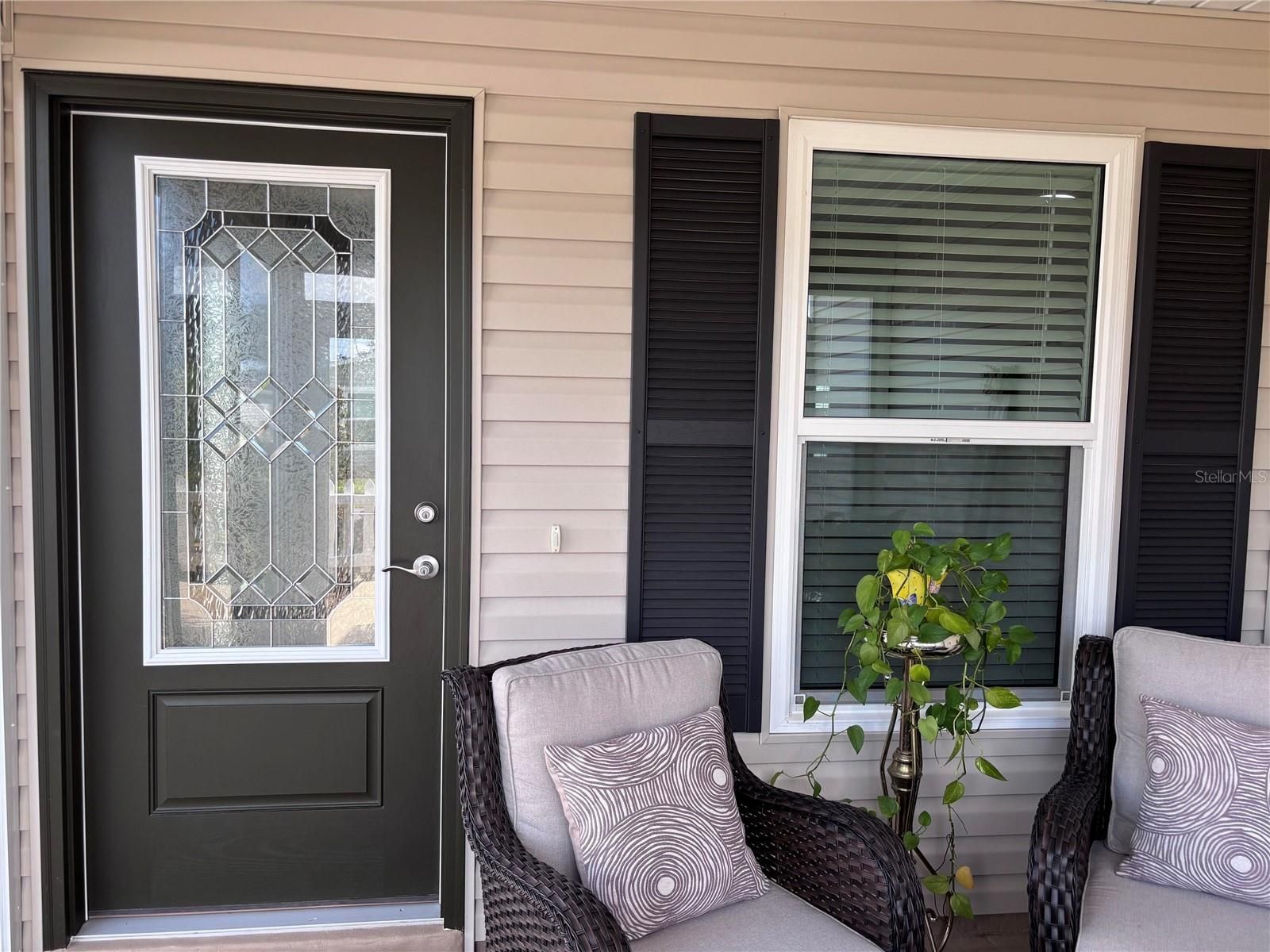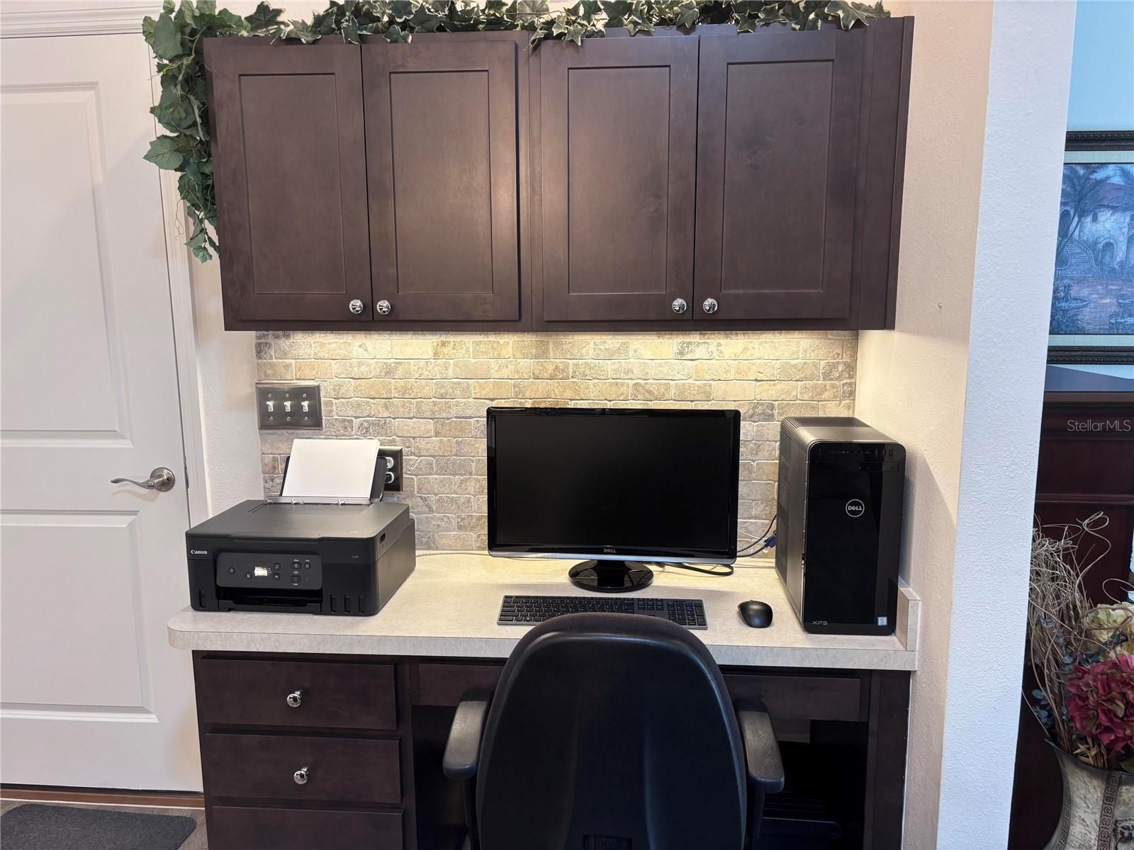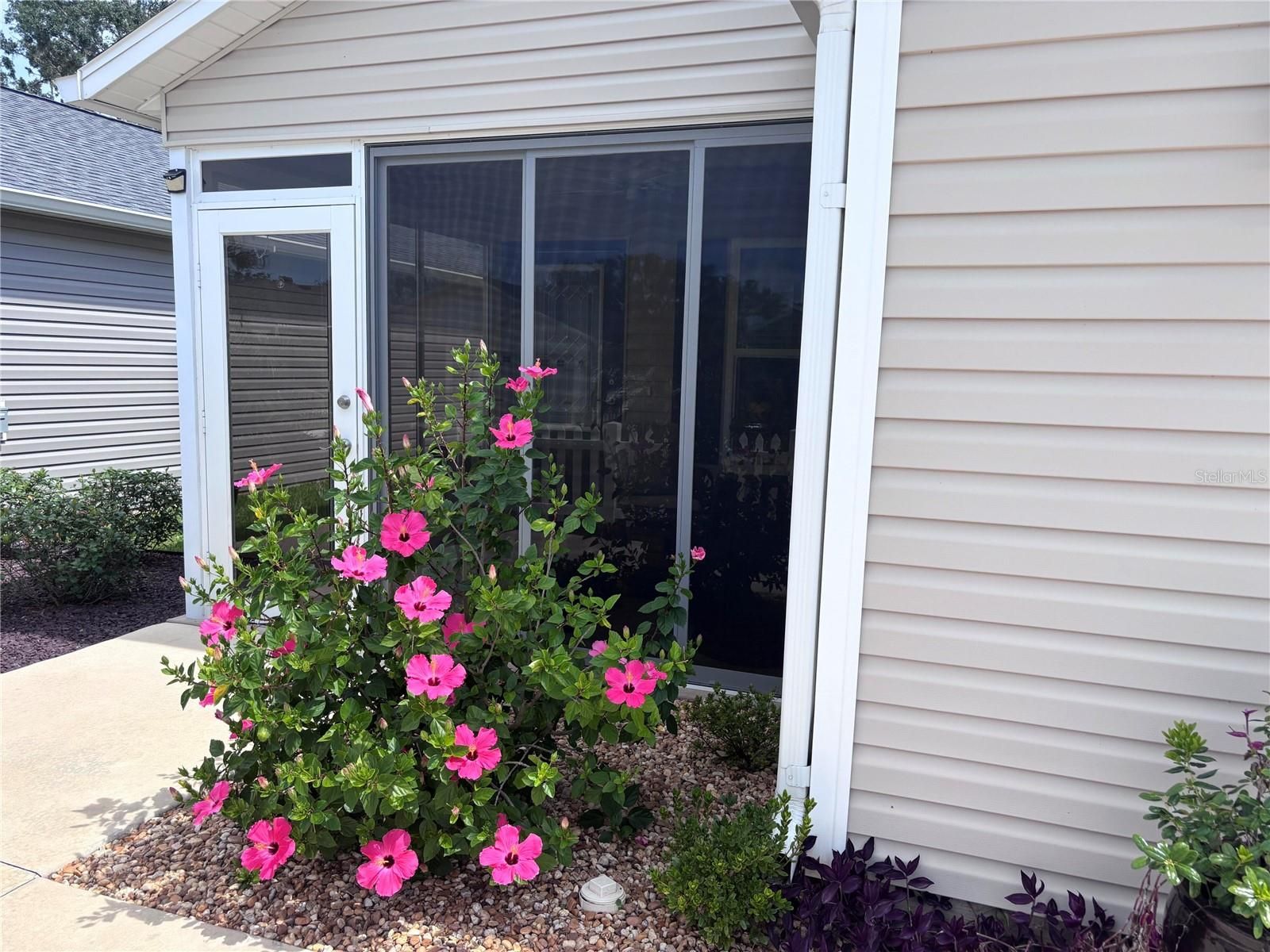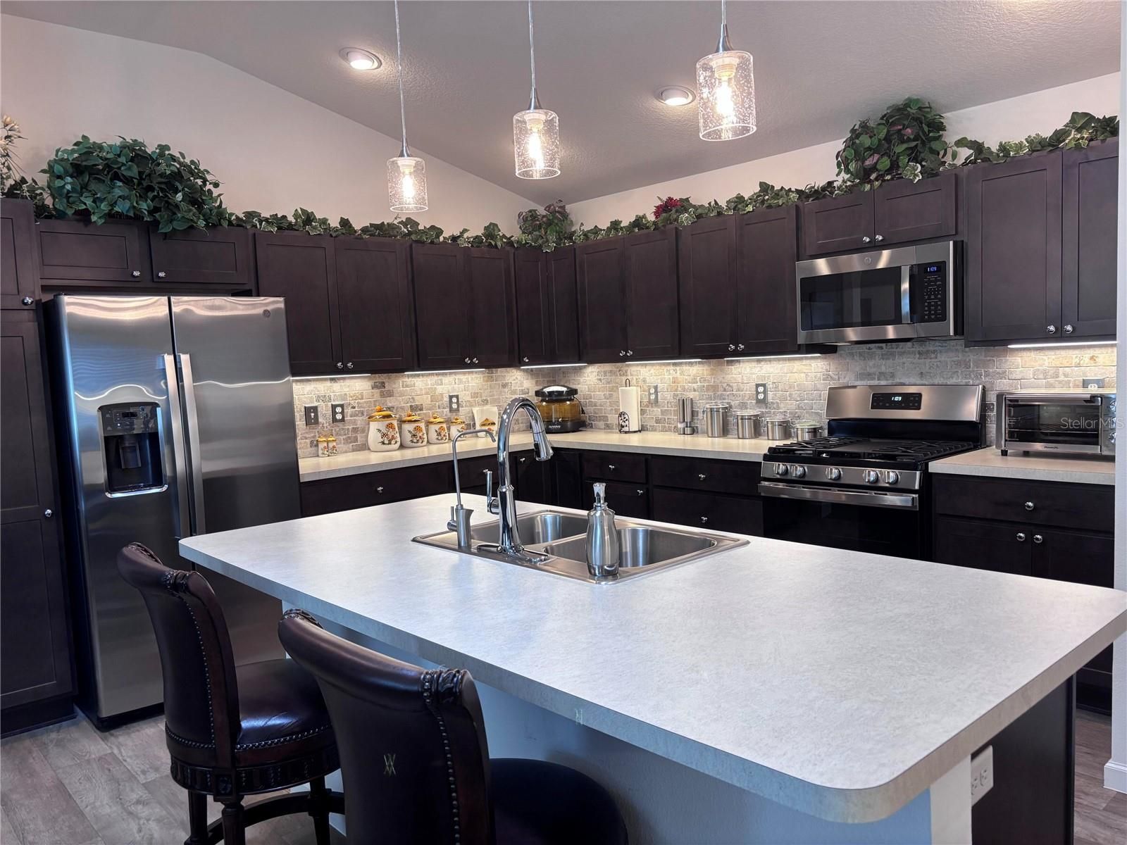 PRICE REDUCTION! Charming 2 bedroom, 2-bathroom patio villa located in The Villages, FL. This well-maintained property offers enhanced landscaping and open floor plan with volume ceilings. A beautiful leaded glass door invites you to explore the spacious villa. The modern kitchen features stainless steel appliances, deep stainless steel double sink, travertine tile backsplash with under cabinet lighting, pendant lights over center island, loads of cabinet space and a built in desk. A solartube in the center of the kitchen brings in an abundance of natural light. Additional storage cabinets have been installed in the laundry, garage, and master bathroom. Also included are ceiling light kits in the bedrooms and a glass shower door in the master bathroom. Enjoy outdoor living in the beautifully landscaped yard with sweeping stacked walls around Robellini Palms and beautiful hibiscus. Find a glass enclosed lanai and side patio to enjoy your morning coffee or evening wine. Bonus upgrades include a lightning rod system, whole house gutters, a solar attic fan, a filter and extra hose bib on the irrigation system, extra insulation over the garage and lanai. The villa built in 2022 comes with Whirlpool washer and gas dryer set. The villa backs to a vinyl fence with no rear neighbors. Just a short golf cart ride over the Water Lily Bridge to Brownwood Paddock Square for shopping, dining and nightly live music. Conveniently situated to recreational amenities, the DeLuna Adult Pool is 1 mile away, Water Lily Recreation Center is less than 2.5 miles away and the Fenney Recreation Center is less than 3 miles away, each with gorgeous walking/biking paths. A home to provide a comfortable and vibrant lifestyle in a sought-after community.