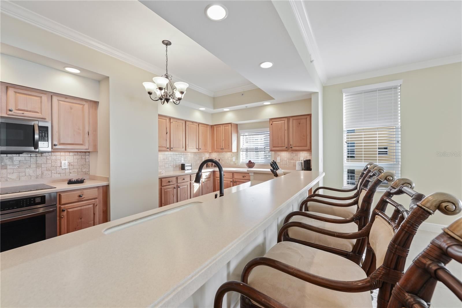 - Ceiling Fan(s), Crown Molding, Living/Dining Room, Open Floorplan, Main Level Primary, Solid-Wood Cabinets, Split Bedrooms, Walk-In Closet(s), Wet Bar, Window Treatments