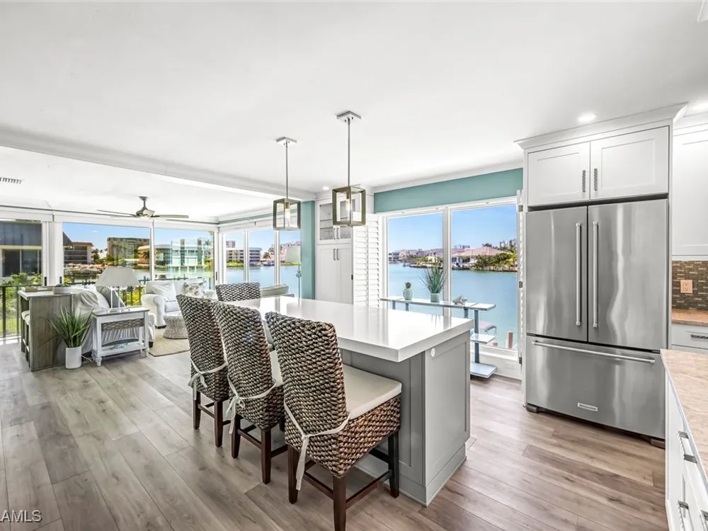 PRIVATE Boat Dock with DIRECT GULF ACCESS: Experience the ultimate in Coastal living with this beautifully remodeled & coveted 2nd Floor Corner Unit in the heart of the Moorings, offering sweeping Bay views and an abundance of natural light with floor to ceiling windows! Open concept with Coastal chic décor and upscale SS KitchenAid appliances make it ideal for entertaining or just relaxing after a day at the Beach or boating on the Gulf/Bay. Toast to the end of another perfect day with the convenience of a B/I Wine Cooler and Bar area, while watching the Dolphins frolic in the Bay and enjoying another spectacular Naples Sunset directly from the comforts of this condo. Perfectly situated just minutes from Naples’ pristine white sandy beaches, Venetian Village and the renowned 5th Avenue South, you will be ideally positioned close to world-class waterfront dining shopping, and entertainment, then return home to the peaceful beauty of waterfront living! This is a true gem for those that love the water, value luxury and want to embrace the highly desired Naples lifestyle, a rare find for the Boating enthusiast, enjoying quick easy access to open waters right from your “backyard.” Schedule your private viewing today, as this rarely available jewel won’t last!
