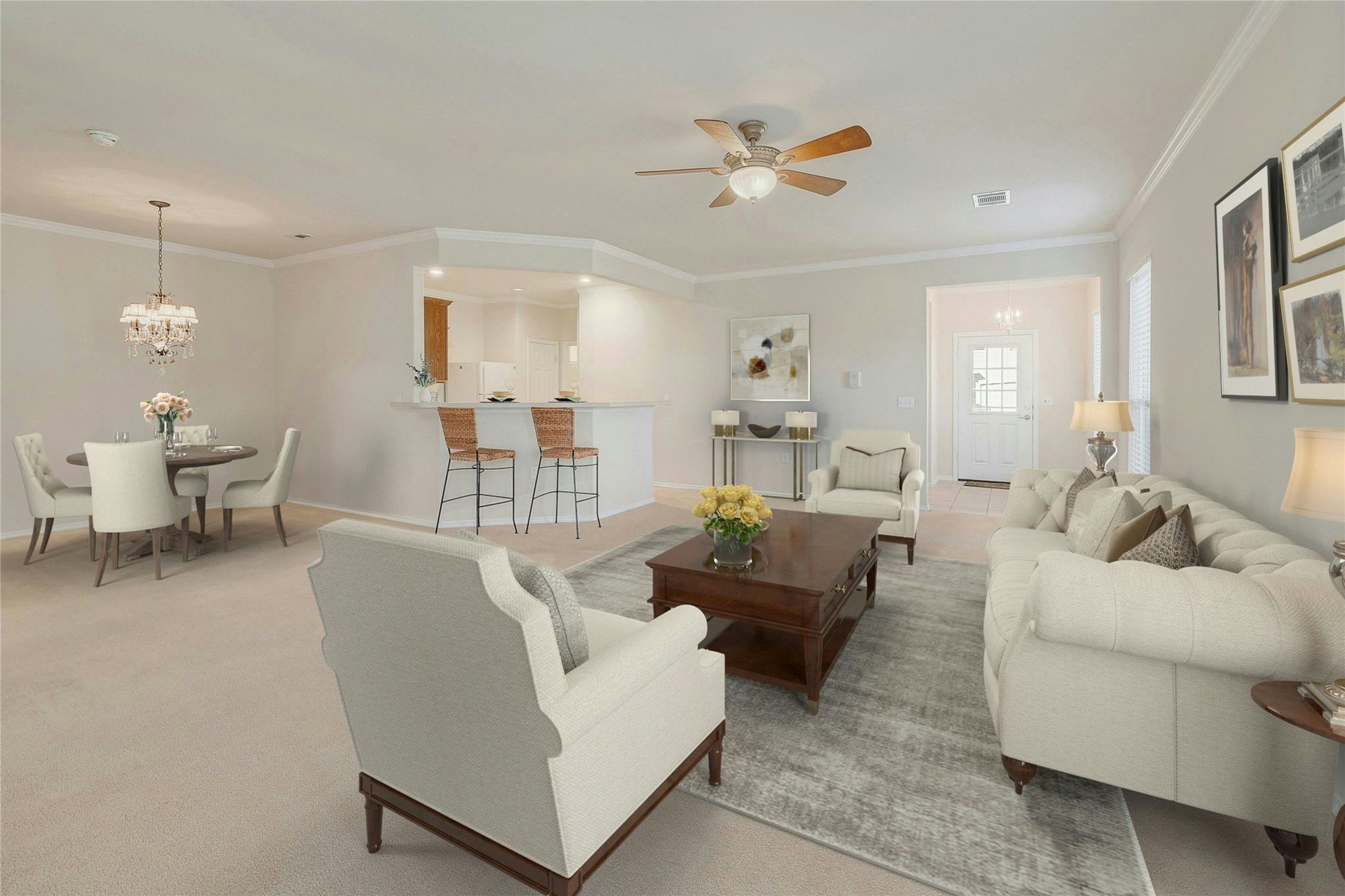 - Breakfast Bar, Ceiling Fan(s), Crown Molding, Double Vanity, Laminate Counters, Main Level Primary, NoInteriorSteps, Open Floorplan, Pantry, Recessed Lighting, Walk-In Closet(s)