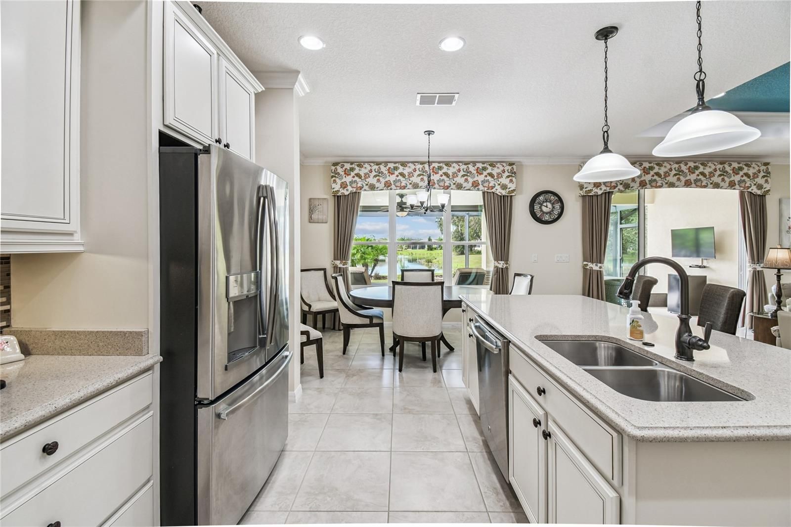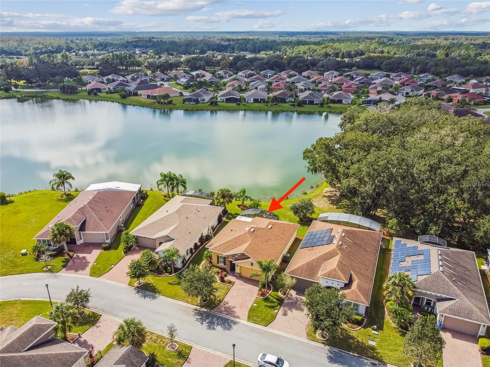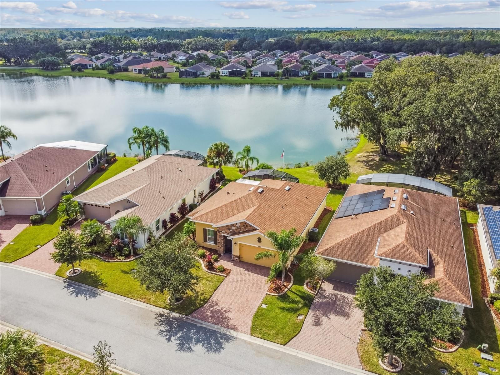 STUNNING CABELLA MODEL WITH BREATHTAKING WATER VIEWS! **See the FULL LENGTH 3D MATTERPORT VIDEO on Tour Link 1. ** Located in the desirable Treviso neighborhood of Solivita, this beautifully appointed home features 2 bedrooms, 2 baths, and a versatile DEN. Elegant CROWN MOLDING and TRAY CEILINGS add a touch of sophistication and style to the open, inviting floor plan. Step into the living room and take in the direct sight lines to the gorgeous water views from your EXTENDED, COVERED, and screened lanai with WIDE SCREEN ENCLOSURES....the perfect place to relax and unwind. The space features 18" CERAMIC TILE flooring, providing easy maintenance throughout. The kitchen is a chef’s delight, showcasing EXTENDED countertops with QUARTZ surfaces, a glass mosaic backsplash, and 42-inch cabinets with light rails and the convenience of DRAWERS for easy access. Stainless steel appliances and an extended island with BREAKFAST BAR make this space both functional and inviting, while a closet pantry provides plenty of additional storage.The PRIMARY SUITE features luxury vinyl plank flooring, an ENSUITE BATH with a walk-in shower, DAUL SINKS, and a large DRESSING ROOM/WALK-IN CLOSET offering ample space and organization. The second bedroom, located at the front of the home, includes an adjacent full bath with a ROLLING GLASS SHOWER ENCLOSURE, providing comfort and convenience for guests. The den features PLANTATION SHUTTERS and can easily serve as a media room, home office, or hobby space, adding flexibility to suit your lifestyle. The extended lanai can be accessed through triple sliding doors and offers PANORAMIC WATER VIEWS with a tree-lined landscape on one side, creating the perfect spot to relax with friends while enjoying the gentle breezes. Additional upgrades include rounded corners, LEADED GLASS entry door, DUAL-PANE windows, and a CENTRAL VACUUM system. The two-car garage features EPOXY FLOORING, pull-down attic stairs, an overhead storage rack, and has been pre-plumbed for a water filtration system. The laundry room includes a washer and dryer, upper cabinets for added storage, and a convenient UTILITY SINK. This home has it all — beautifully move-in ready and located in an award-winning, active adult community offering the resort-style lifestyle you’ve been waiting for! Not to mention its convenient location near the Village Center, where you can easily enjoy dining, entertainment, and all the wonderful amenities Solivita has to offer. The HOA: - maintains the LANDSCAPING & IRRIGATION systems in the common areas as well as at individual homesites - maintains the roads throughout the community - PROVIDES SECURITY with gate guards and mobile patrols including the Polk County Sheriff - allows AUTOMATED GATE ACCESS for residents via license plate readers - provides residents with Fiber Optic Internet & TV service.***Poinciana Lakes Plaza is a MAJOR NEW SHOPPING CENTER that opened directly across from the Solivita Main Gate in Summer of 2024. It features Sprouts Grocery, TJ MAXX, Ross, Burlington, Rack Room Shoes, 5 Below, Ulta, Outback, First Watch, 5 Guys, Urgent Care, Dentist, TD Bank, Petco & Hair Cuttery PLUS MORE TO COME.***