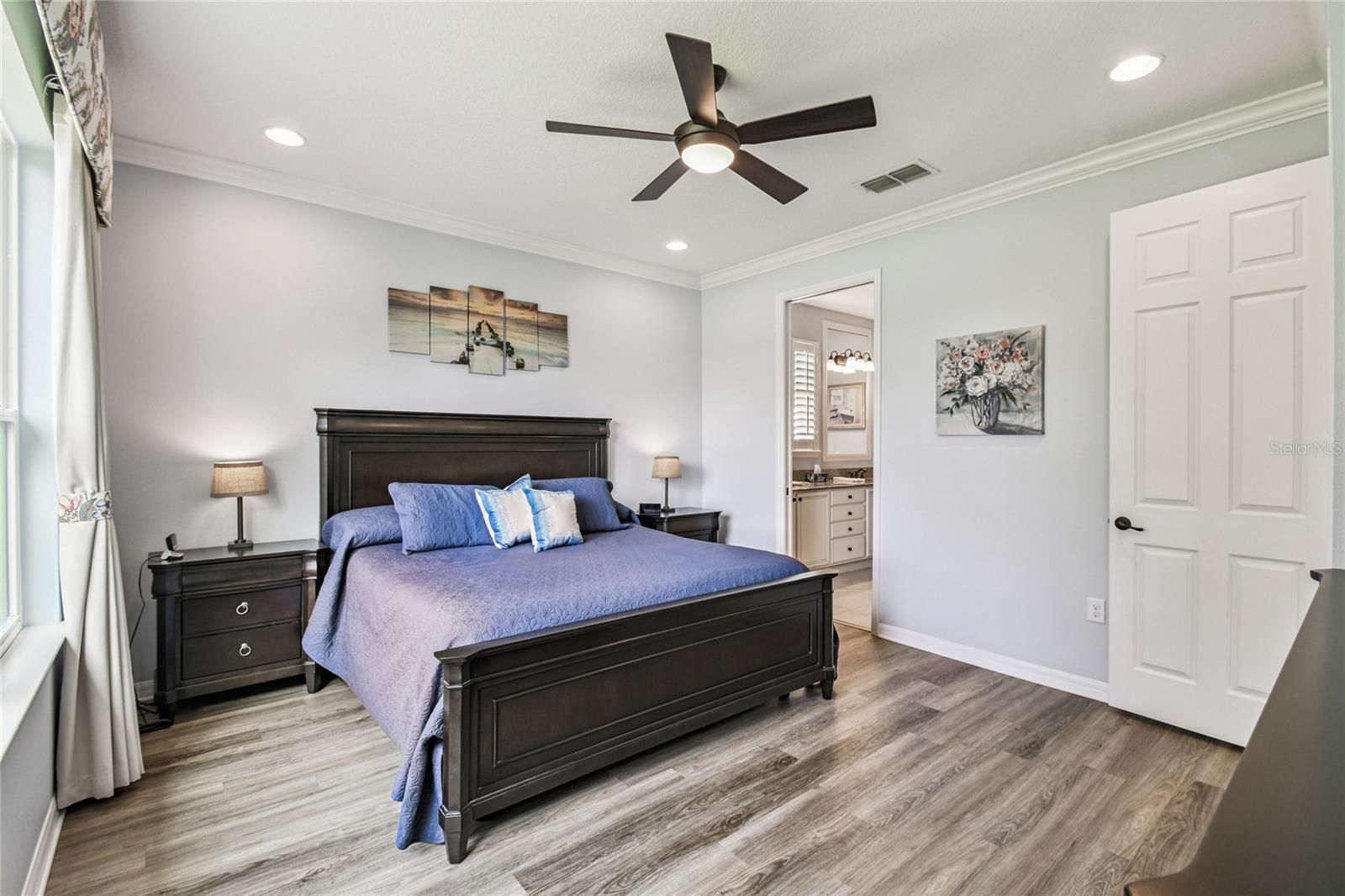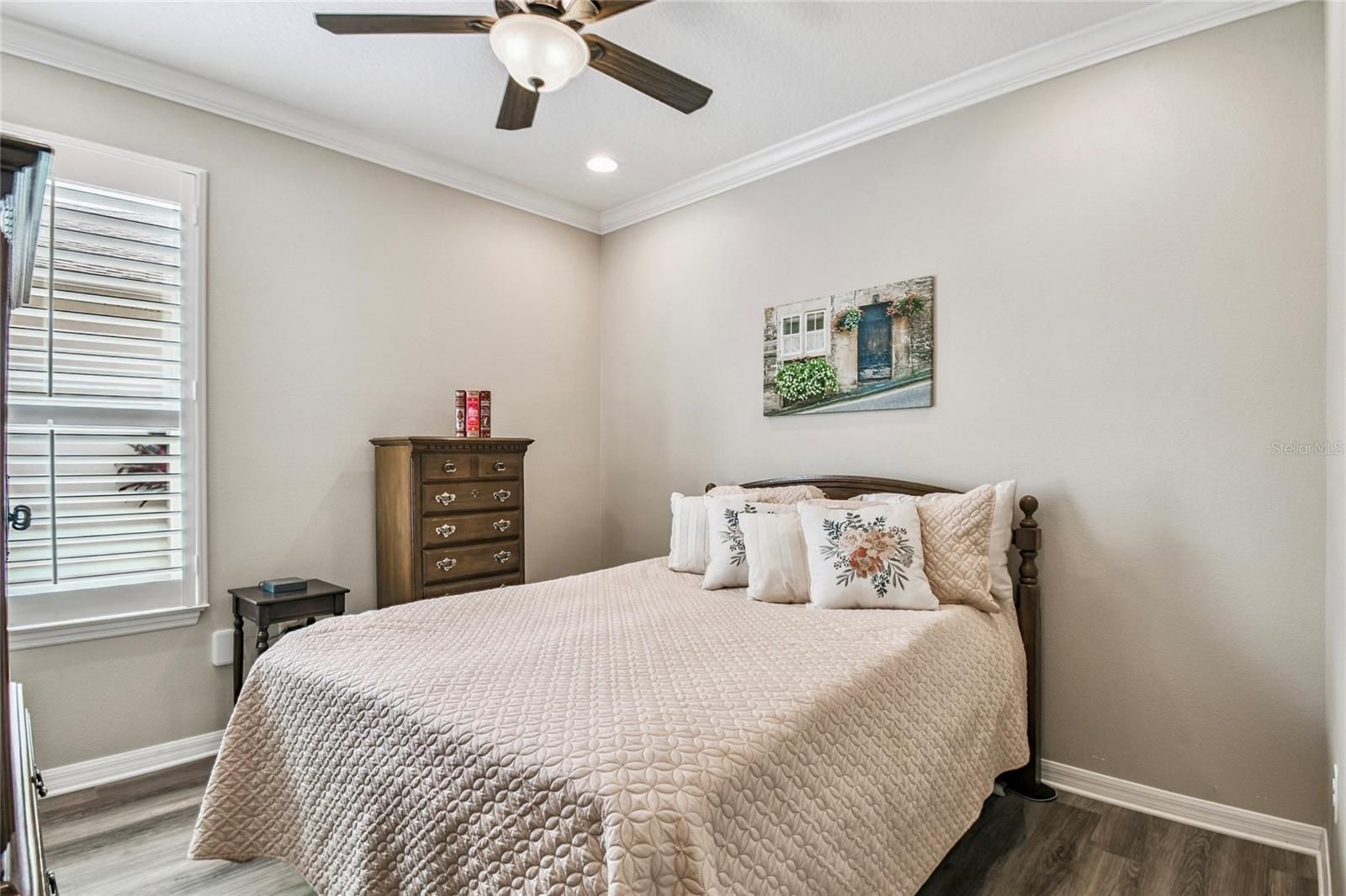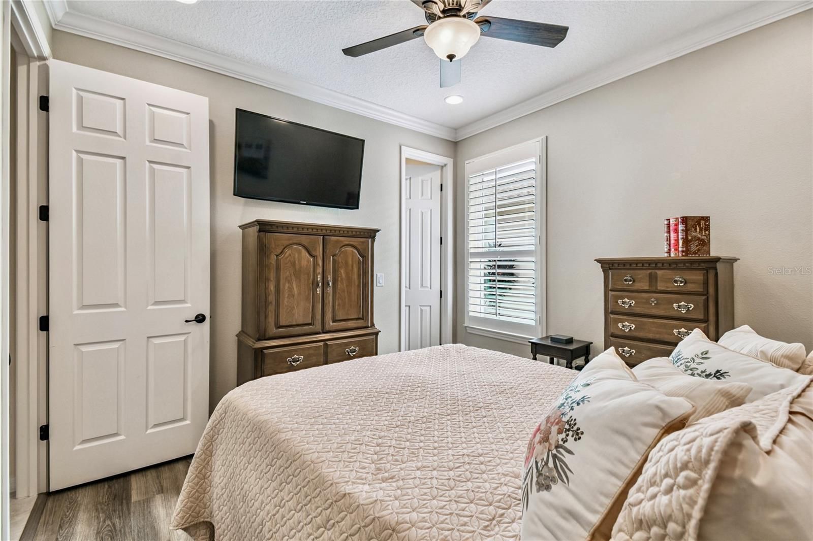 - Ceiling Fan(s), Crown Molding, Open Floorplan, Solid-Wood Cabinets, Split Bedrooms, Stone Counters, Thermostat, Walk-In Closet(s), Window Treatments