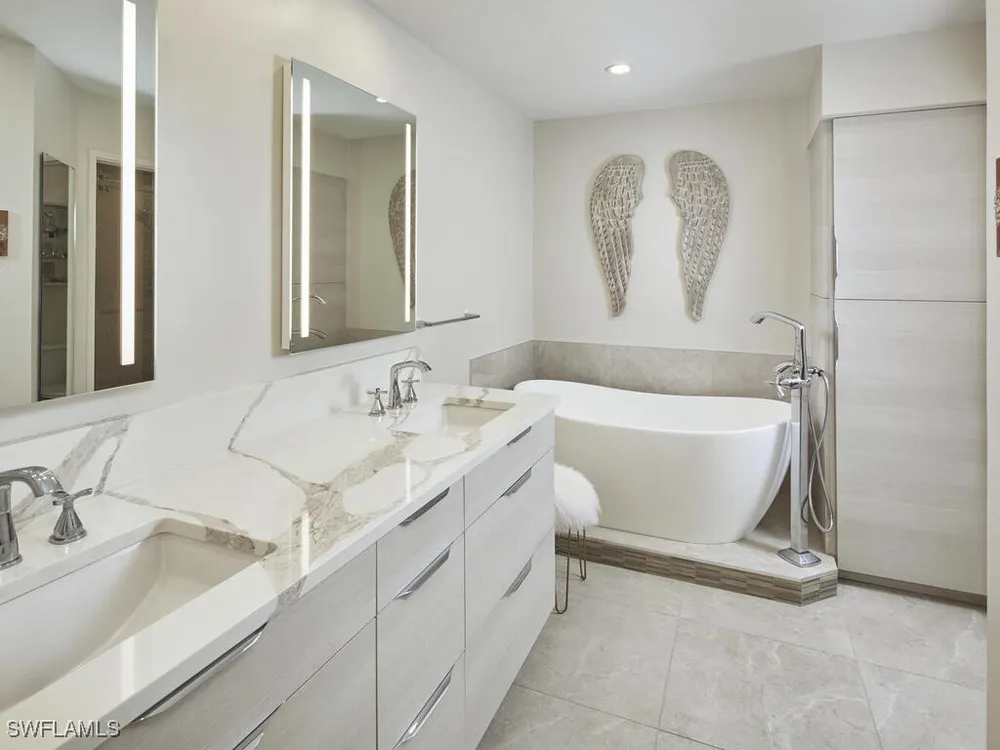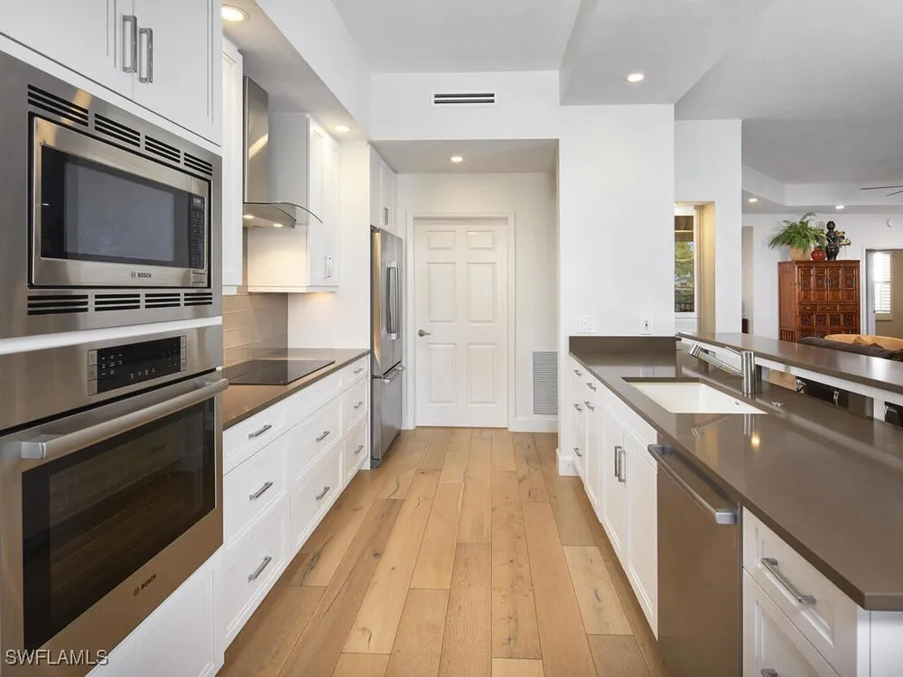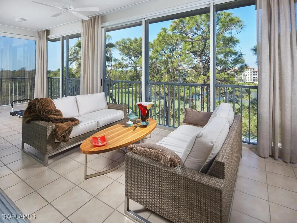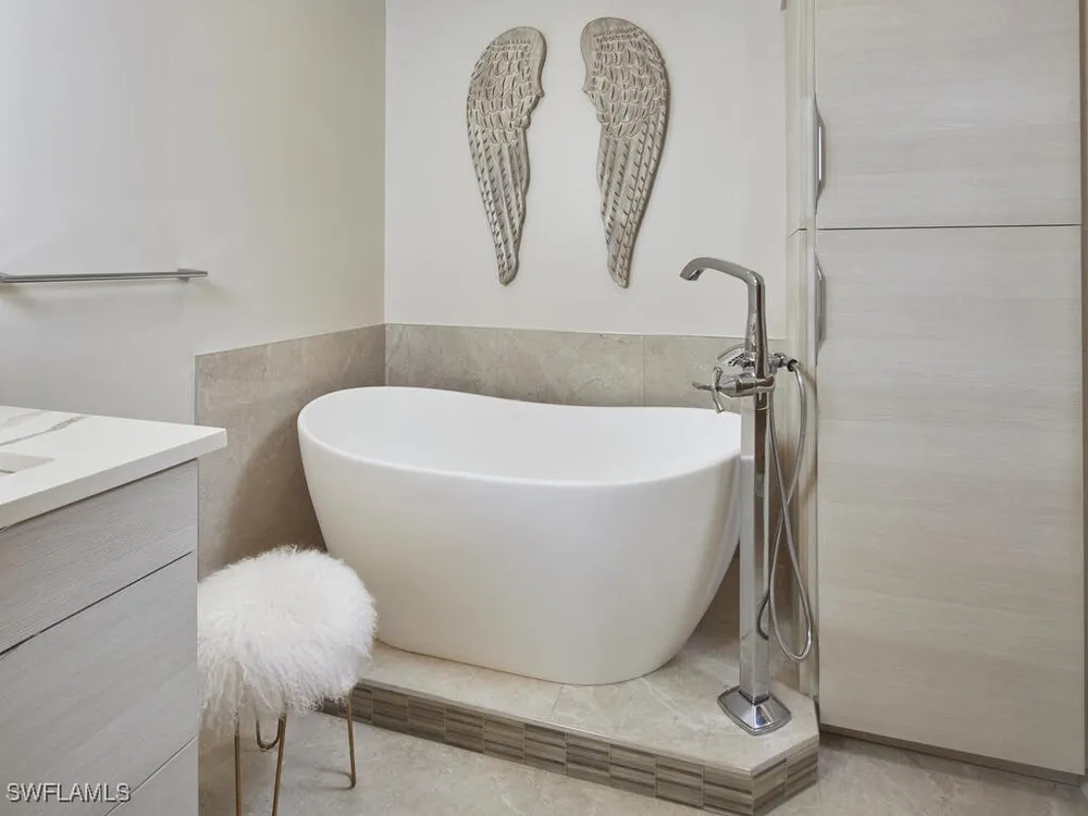 Located in the desirable Crossings at Bonita Bay, this beautifully RENOVATED 3-bedroom, 3-bathroom condo offers breathtaking views of the lush and tropical grounds of Bonita Bay. With volume ceilings and an open-concept layout, the space is bright and inviting, seamlessly connecting to a spacious lanai with sliding glass doors and custom drapes. This home is the definition of indoor/outdoor living! The reconfigured kitchen features quartz countertops, a glass tile backsplash, white self-close cabinetry, and high-end Bosch stainless steel appliances, including a Wolf induction cooktop and a counter-depth French refrigerator. Hardwood oak floors flow throughout, complemented by custom-painted shutters, modern lighting, and sleek cabinetry. The primary bathroom boasts a freestanding resin tub, a barn-style glass shower door, quartz countertops, LED-lit mirrors, and a Grohe thermostatic shower valve, while the guest bath offers a privacy pocket door, a walk-in shower, and quartz finishes. Additional highlights include a Sonos sound system, a security system (with additional fee), deeded under-building parking, and a newly replaced front door. This condo building has always remained dry during hurricanes. The building’s roof replacement is almost complete with the assessment already paid by the seller. A beautifully planned lobby remodel has been approved, with no special assessment. Request a feature sheet as there are too many upgrades and exceptional touches to mention! This exceptional condo provides a move-in-ready opportunity to experience the luxury and convenience of Bonita Bay living. Bonita Bay offers its residents an array of exceptional amenities, including a private beach club, kayaking, canoeing, pickleball, tennis, and multiple community parks. Explore over 12 miles of walking and biking paths, or take advantage of the full-service marina and restaurant. Golf enthusiasts will appreciate the THREE on-site courses, complemented by several dining options, a state-of-the-art fitness center, and more--all available with club membership (additional fees apply). Located just a short drive from world-class dining, shopping, beaches, and nature preserves, you'll also enjoy easy access to the burgeoning downtown Bonita Springs and downtown Naples. RSW International Airport is conveniently nearby!