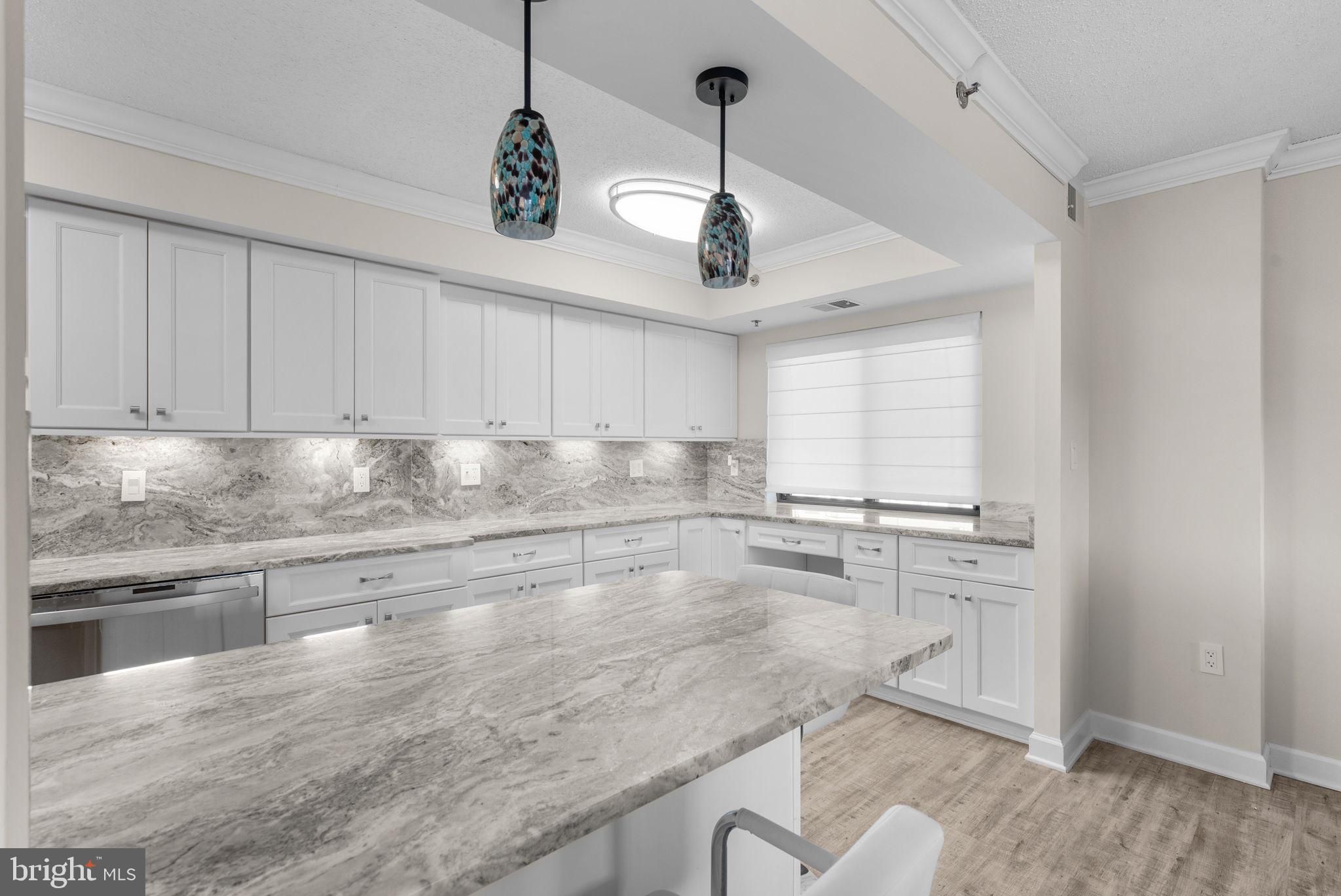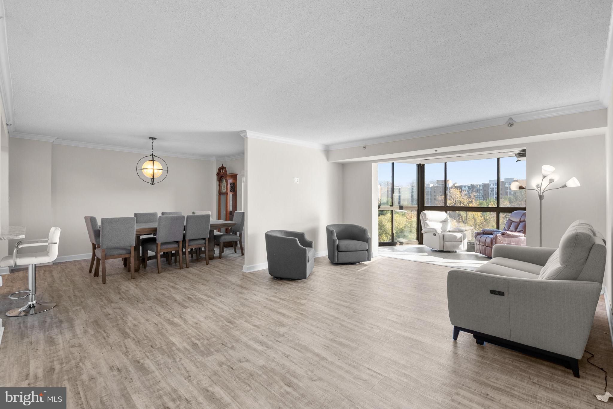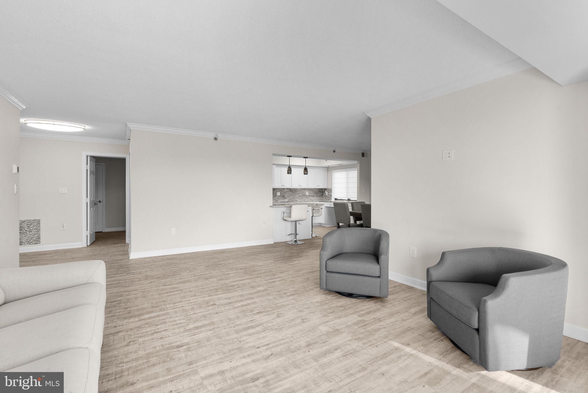 The one you’ve been waiting for in sought-after Leisure World! This beautifully updated home offers an inviting entrance with a guest closet and luxury vinyl plank flooring that flows seamlessly through the foyer, living room, dining room, kitchen, and baths. An open floor plan enhances the spacious feel and makes everyday living and entertaining effortless. The bright living room features elegant crown molding and opens directly to the sunroom—perfect for enjoying natural light year-round. The adjoining dining room also includes crown molding, updated lighting, and opens to the kitchen for an ideal flow. The updated kitchen is a standout with white shaker cabinetry, granite countertops and backsplash, undermount stainless steel sink, and a breakfast peninsula with pendant lighting. Stainless steel appliances include an electric range, dishwasher, French-door refrigerator with water and ice on the door, and built-in microwave. A pantry closet provides excellent storage. The spacious owner’s bedroom offers crown molding, soft carpet, a walk-in closet, and a second closet. The updated owner’s bath features a granite-topped vanity and a beautifully remodeled walk-in shower. Two additional bedrooms add wonderful flexibility. The second bedroom includes carpet, crown molding, and a double-door closet. The third bedroom offers crown molding, a large double-door closet, and a sliding glass door leading to the sunroom. A hall full bath includes LVP flooring, tiled shower, and a single vanity with granite. The powder room also features LVP flooring and a granite-topped vanity. A convenient laundry closet includes a full-size stackable washer and dryer. Additional upgrades include a new HVAC system installed in 2022, humidifier, and many smart home features that elevate comfort and efficiency. Beautifully maintained, thoughtfully updated, and located in one of the area’s premier 55+ communities—this is the Leisure World home you’ve been waiting for!
