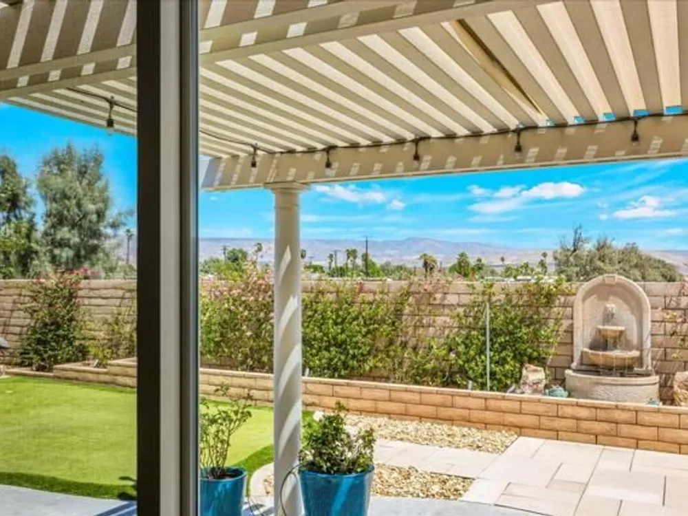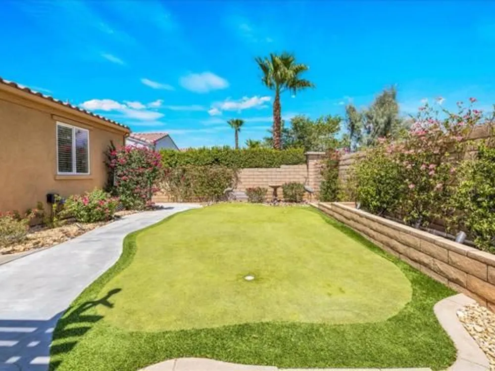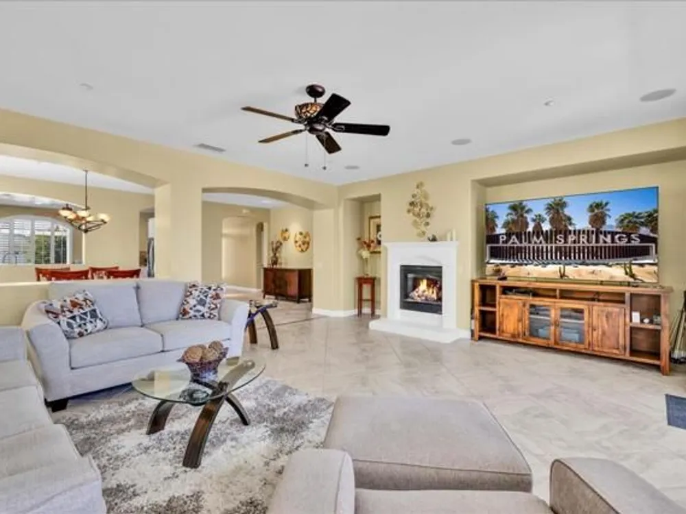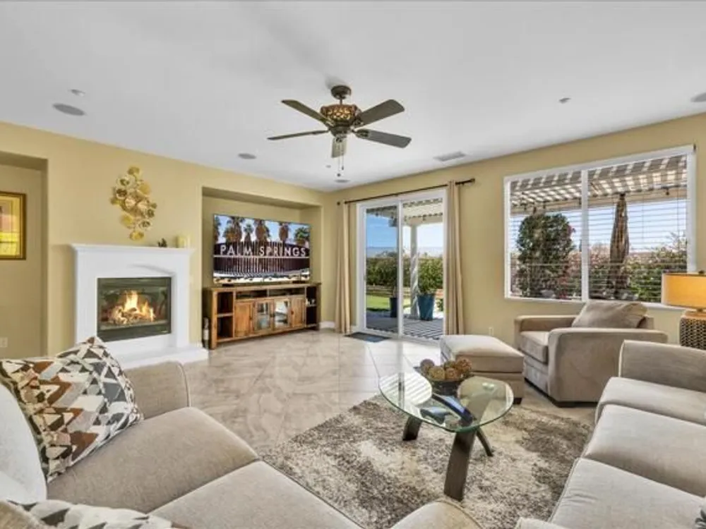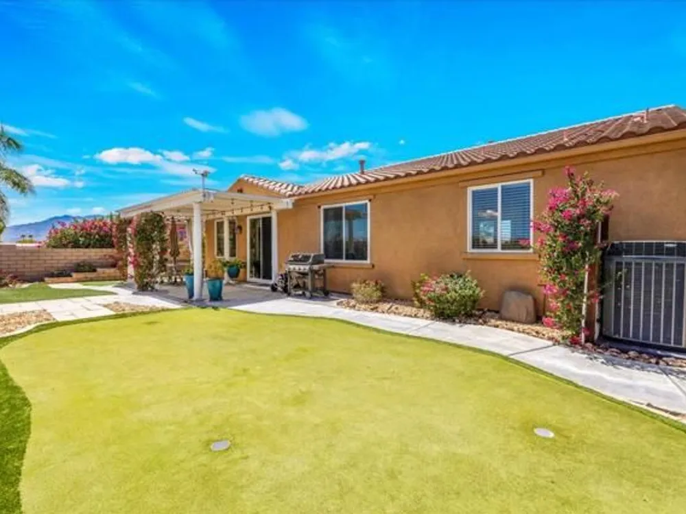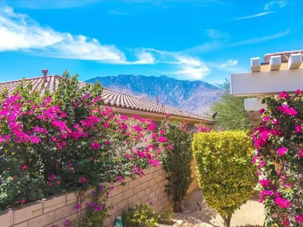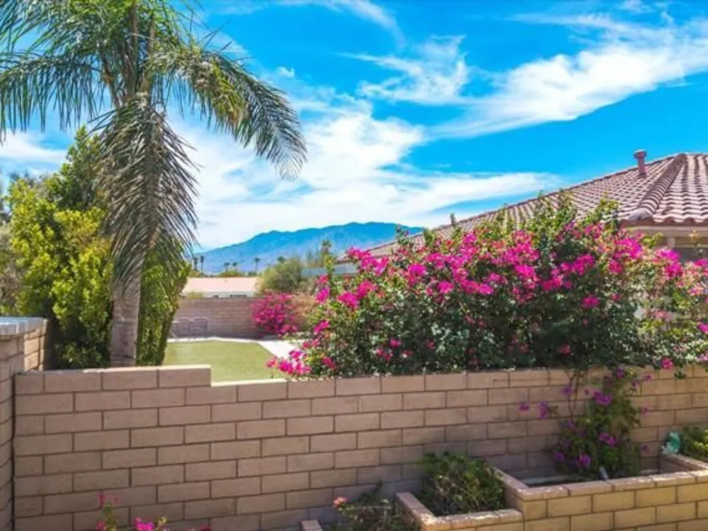 Discover the best of Palm Springs living in the coveted Four Seasons 55+ Gated Community. This 2,288 sq. ft., 3-bedroom, 2-bath home blends elegance & comfort, all framed by majestic mountain views.Inside, you'll be greeted by stunning tile flooring, updated thermopane windows & doors, and a Trane HVAC system with additional split AC for year-round comfort. The gourmet kitchen boasts Silestone quartz counters, pull-out shelving, newer stainless appliances, a spacious center island--plus a breakfast area and formal dining room. The large primary suite offers plush carpeting, a huge built-out walk-in closet, and a remodeled bathroom. Freshly painted interior & exterior in cool modern tones, the home also includes a whole-house water conditioner. Step to the private rear grounds for a tranquil water feature, low-maintenance artificial lawn, private putting green, mature fruit trees & lush landscaping. The garage impresses with epoxy flooring, built-in storage, rain gutters, and more. The Four Seasons ''Lodge'' is a resort-style clubhouse complete with full time staff, a ballroom, fitness & aerobics studios, game room, library, and endless social events. Residents also enjoy swimming pools, spas, tennis & pickleball courts, BBQ pavilion, and scenic walking trails--all designed to capture the active Palm Springs lifestyle. Low HOA's include Frontier fiber-optic internet. Just minutes from downtown Palm Springs' fine dining, designer shopping, world-class entertainment & top medical facilities. Experience the ultimate Palm Springs lifestyle where luxury & convenience merge as one.
