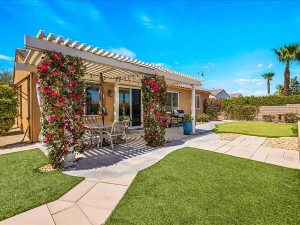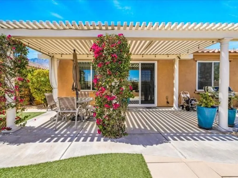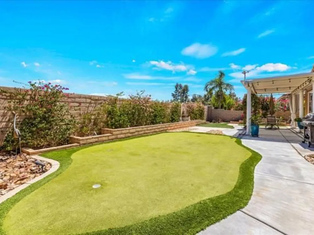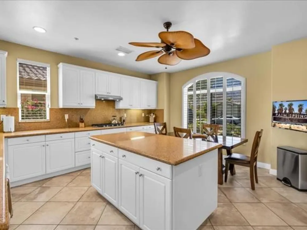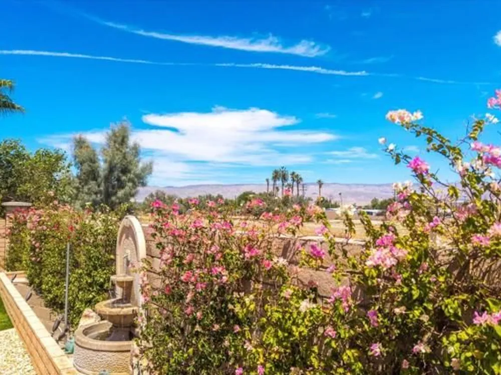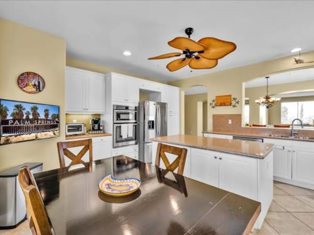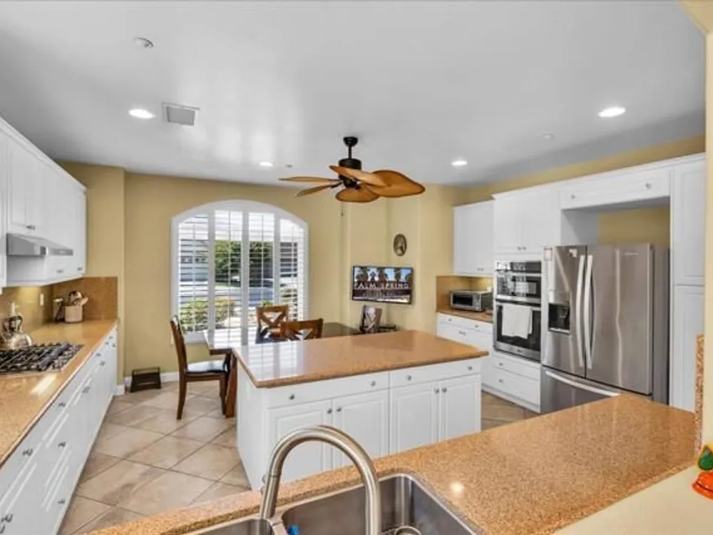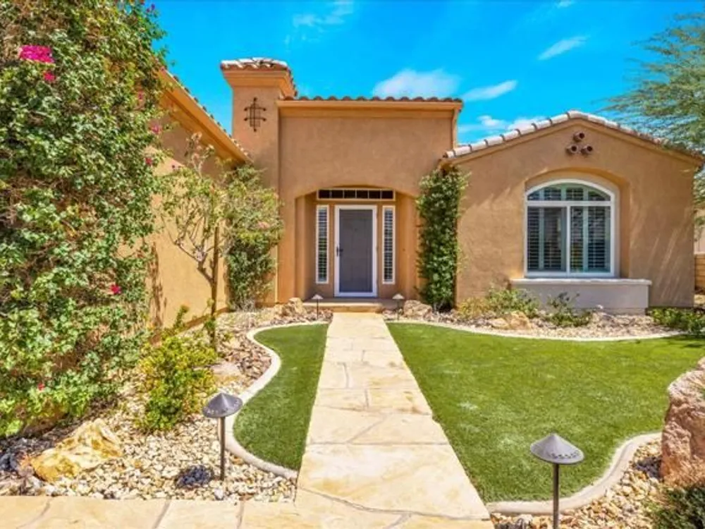 Discover the best of Palm Springs living in the coveted Four Seasons 55+ Gated Community. This 2,288 sq. ft., 3-bedroom, 2-bath home blends elegance & comfort, all framed by majestic mountain views.Inside, you'll be greeted by stunning tile flooring, updated thermopane windows & doors, and a Trane HVAC system with additional split AC for year-round comfort. The gourmet kitchen boasts Silestone quartz counters, pull-out shelving, newer stainless appliances, a spacious center island--plus a breakfast area and formal dining room. The large primary suite offers plush carpeting, a huge built-out walk-in closet, and a remodeled bathroom. Freshly painted interior & exterior in cool modern tones, the home also includes a whole-house water conditioner. Step to the private rear grounds for a tranquil water feature, low-maintenance artificial lawn, private putting green, mature fruit trees & lush landscaping. The garage impresses with epoxy flooring, built-in storage, rain gutters, and more. The Four Seasons ''Lodge'' is a resort-style clubhouse complete with full time staff, a ballroom, fitness & aerobics studios, game room, library, and endless social events. Residents also enjoy swimming pools, spas, tennis & pickleball courts, BBQ pavilion, and scenic walking trails--all designed to capture the active Palm Springs lifestyle. Low HOA's include Frontier fiber-optic internet. Just minutes from downtown Palm Springs' fine dining, designer shopping, world-class entertainment & top medical facilities. Experience the ultimate Palm Springs lifestyle where luxury & convenience merge as one.