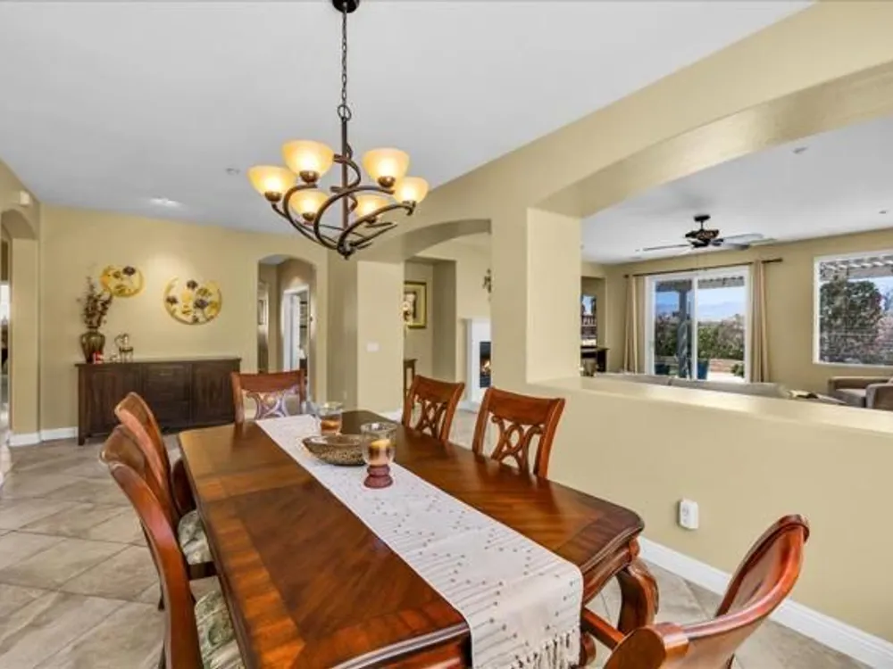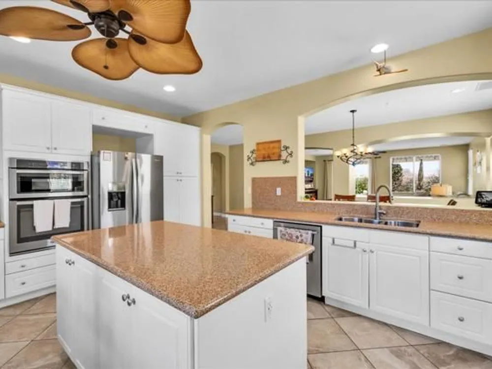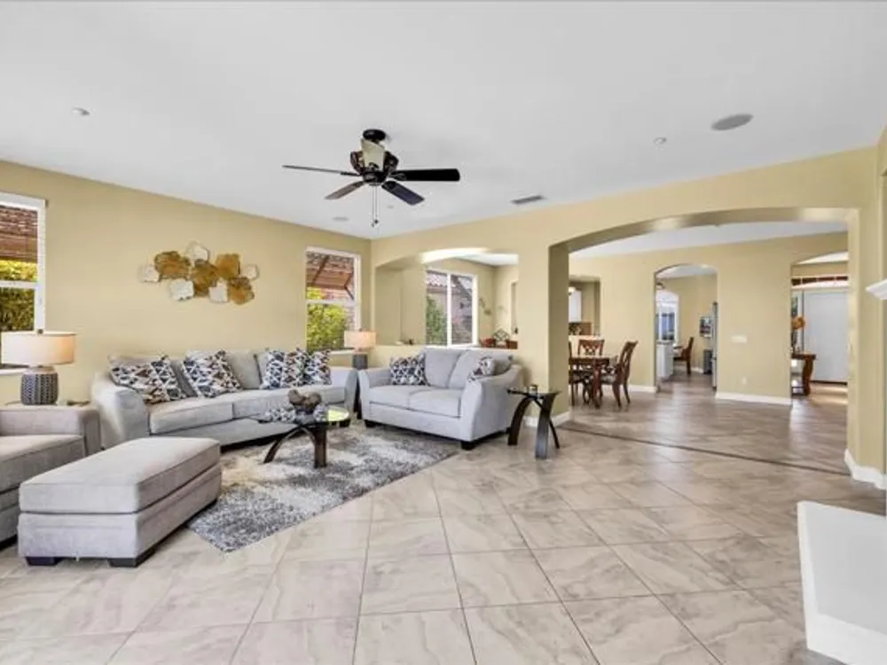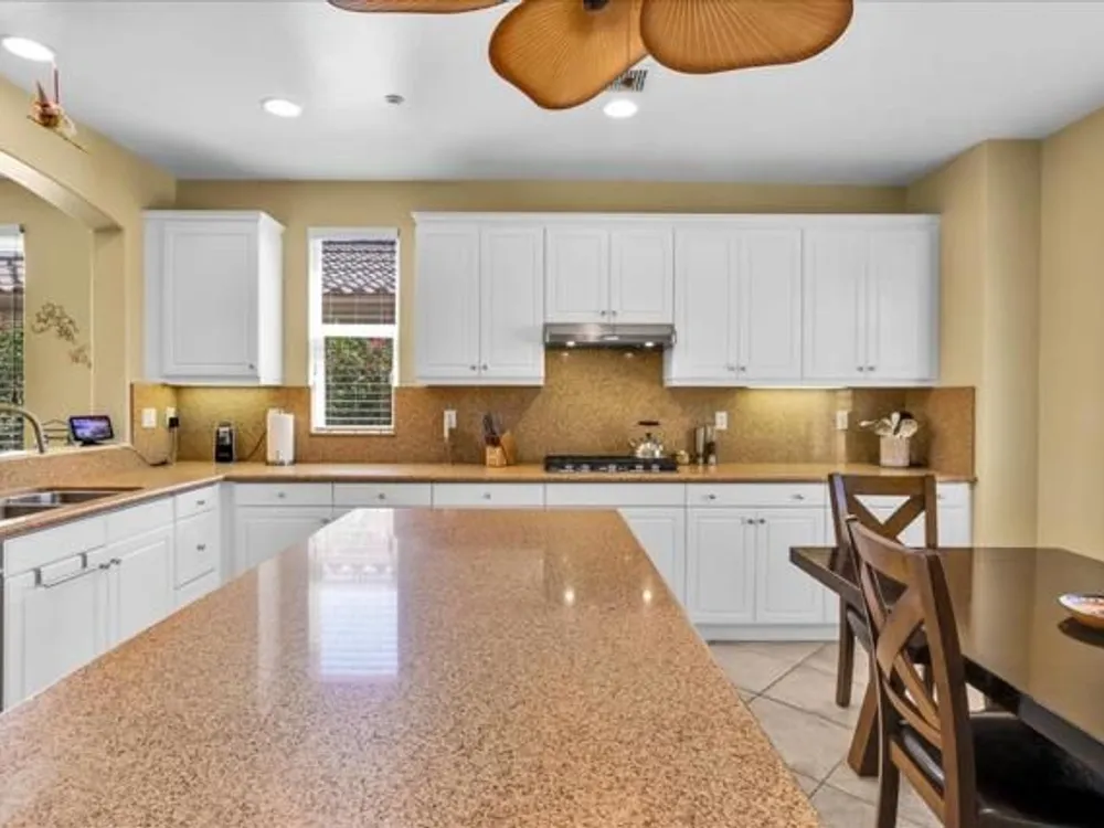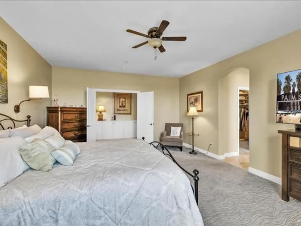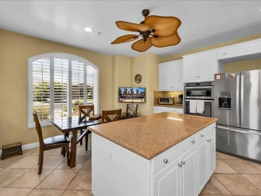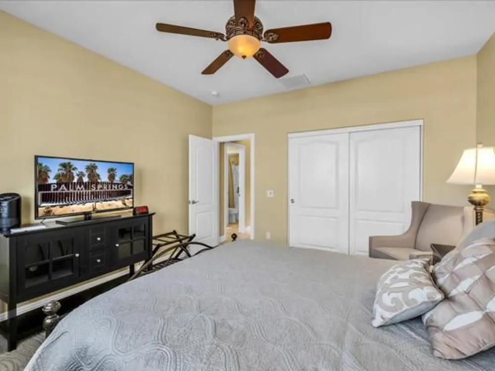 Discover the best of Palm Springs living in the coveted Four Seasons 55+ Gated Community. This 2,288 sq. ft., 3-bedroom, 2-bath home blends elegance & comfort, all framed by majestic mountain views.Inside, you'll be greeted by stunning tile flooring, updated thermopane windows & doors, and a Trane HVAC system with additional split AC for year-round comfort. The gourmet kitchen boasts Silestone quartz counters, pull-out shelving, newer stainless appliances, a spacious center island--plus a breakfast area and formal dining room. The large primary suite offers plush carpeting, a huge built-out walk-in closet, and a remodeled bathroom. Freshly painted interior & exterior in cool modern tones, the home also includes a whole-house water conditioner. Step to the private rear grounds for a tranquil water feature, low-maintenance artificial lawn, private putting green, mature fruit trees & lush landscaping. The garage impresses with epoxy flooring, built-in storage, rain gutters, and more. The Four Seasons ''Lodge'' is a resort-style clubhouse complete with full time staff, a ballroom, fitness & aerobics studios, game room, library, and endless social events. Residents also enjoy swimming pools, spas, tennis & pickleball courts, BBQ pavilion, and scenic walking trails--all designed to capture the active Palm Springs lifestyle. Low HOA's include Frontier fiber-optic internet. Just minutes from downtown Palm Springs' fine dining, designer shopping, world-class entertainment & top medical facilities. Experience the ultimate Palm Springs lifestyle where luxury & convenience merge as one.