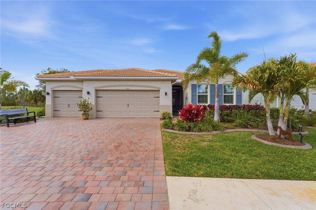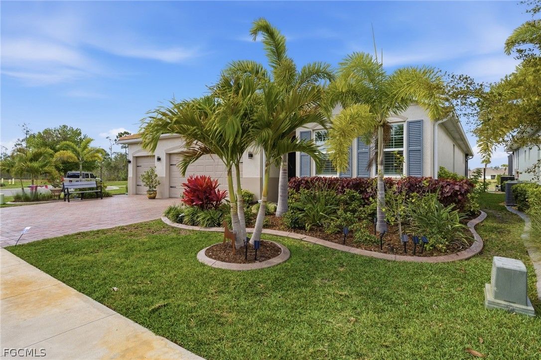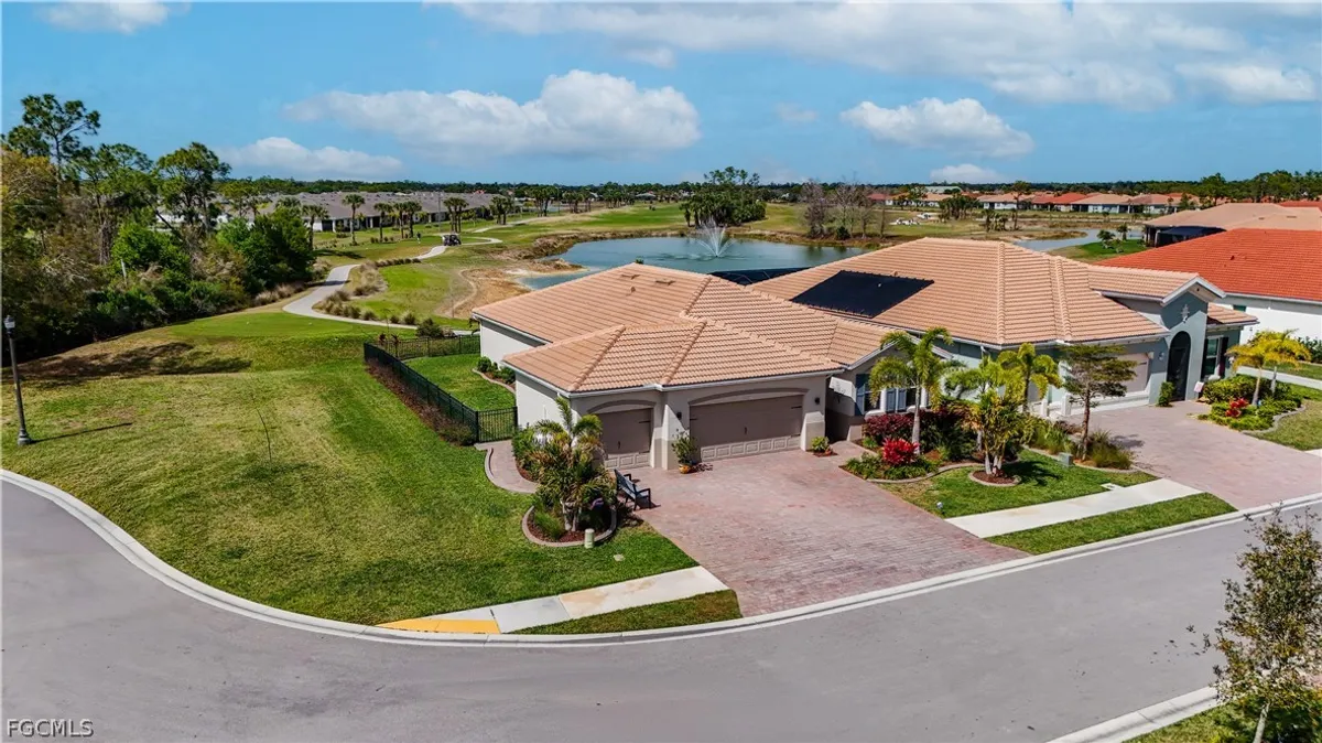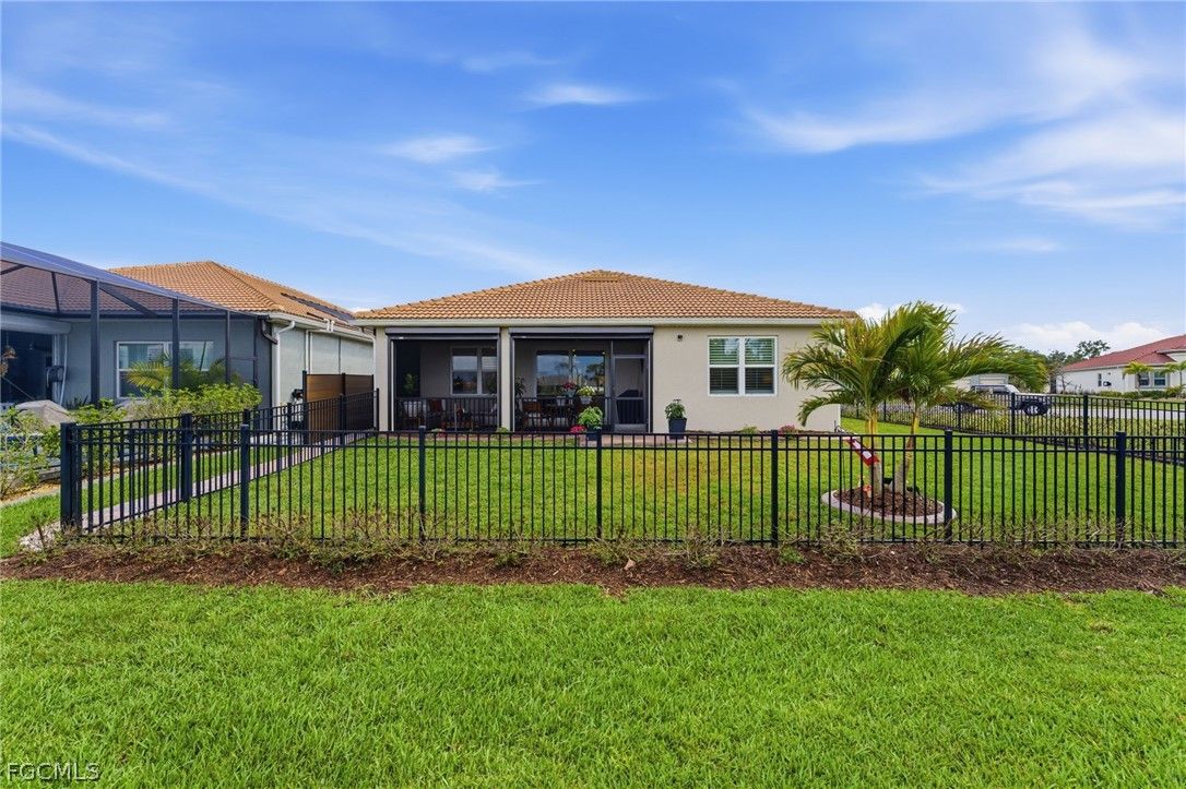 WATER & GOLF VIEWS highlight this beautifully maintained 4-bedroom, 2-bath residence ideally positioned on a cul-de-sac lot in the gated community of Magnolia Landing in North Fort Myers. With no neighboring homes on one side, the setting offers a spacious and open feel while showcasing expansive views of the water and golf course. This move-in ready home combines thoughtful upgrades with a comfortable layout designed for relaxed Florida living. Inside, the home features gorgeous plank tile flooring throughout, crown molding, custom real wood plantation shutters, upgraded lighting with dimmer switches, and a calming coastal palette that creates an inviting and welcoming atmosphere. The open-concept design allows natural light to fill the living spaces while highlighting the scenic views beyond. The spacious primary suite includes two custom walk-in closets and an ensuite bath with a double-bowl vanity and frameless glass shower. A sliding door separates the guest bedrooms and bath, creating a private suite ideal for visiting family or guests. Custom closets and pantry organization provide excellent storage throughout the home, and the laundry room includes an added sink and cabinetry for convenience. Outdoor living is equally impressive with a large, screened lanai featuring added electrical and custom ceiling fans, creating the perfect space to relax and enjoy the water and golf course views. The home features impact windows and doors along with electric and manual storm protection on the lanai, offering valuable peace of mind during storm season. Additional enhancements include decorative landscape curbing, sidewalk pavers on both sides of the home, upgraded exterior lighting, a screened front entry, and a black aluminum fenced yard with landscape hedge. The garage is a standout feature offering an epoxy-finished floor, overhead storage systems, mini-split A/C, additional insulation, generator hook-up, and a whole-home surge protector—creating a functional and comfortable workspace. Located in the highly desirable Magnolia Landing gated golf community, residents enjoy resort-style amenities including a clubhouse with dining, fitness center, resort and lap pools, pickleball, bocce ball, shuffleboard, and a full calendar of social activities. Golf is optional with membership or pay-as-you-play availability. Exceptional views, extensive upgrades, and a premier cul-de-sac location make this home a standout opportunity in Magnolia Landing. The seller is willing to rent back.