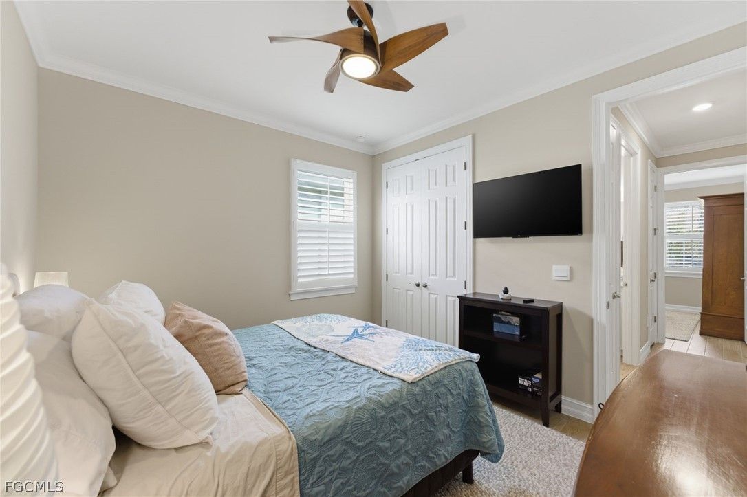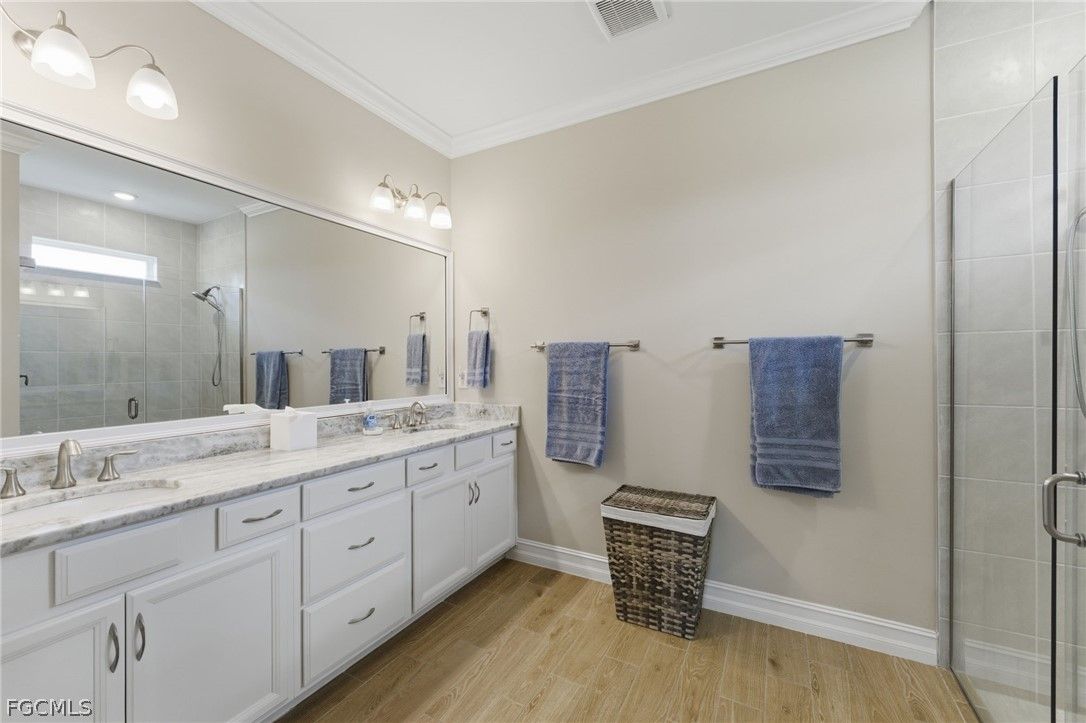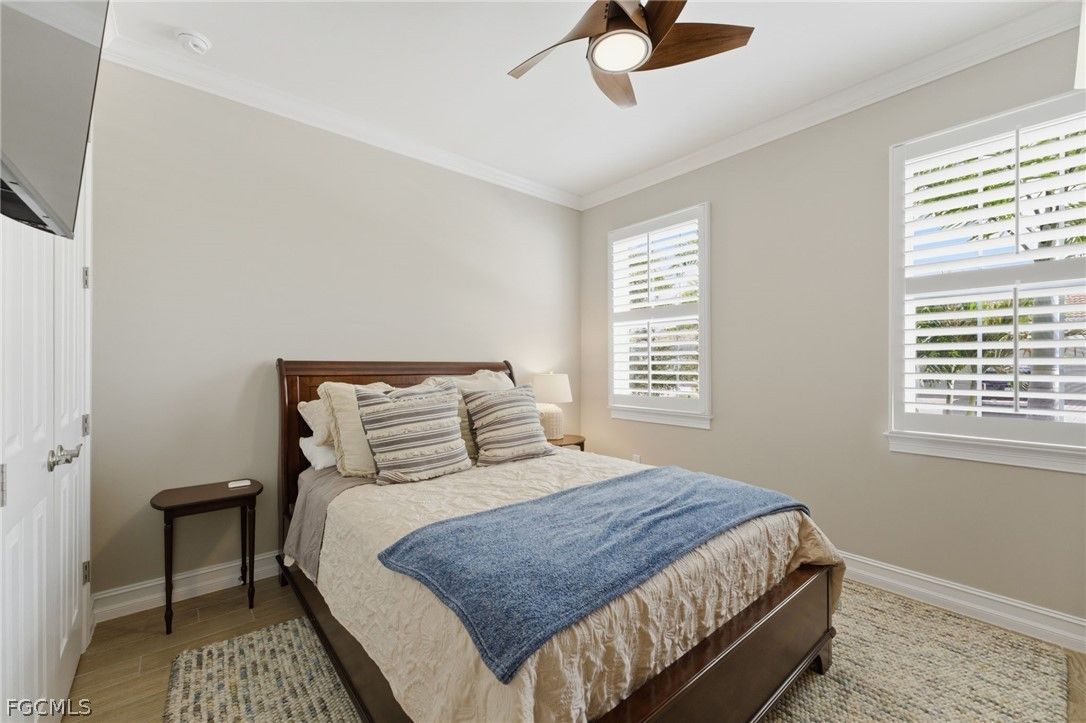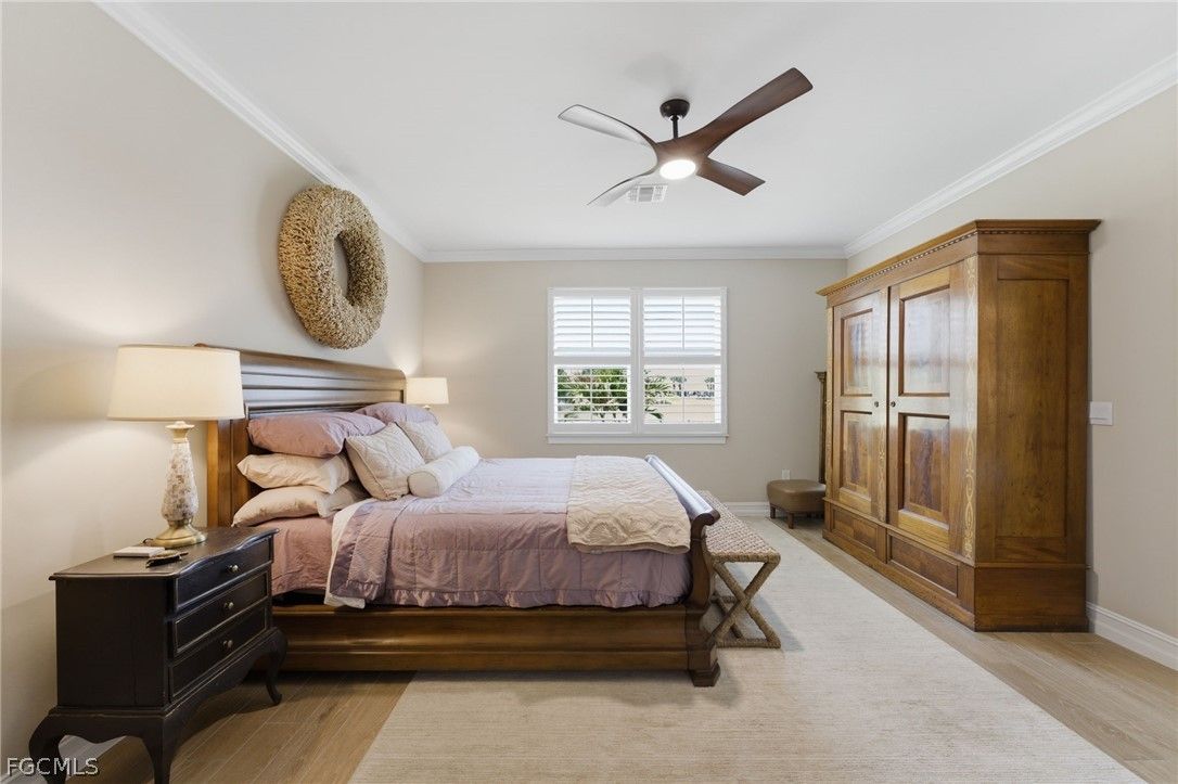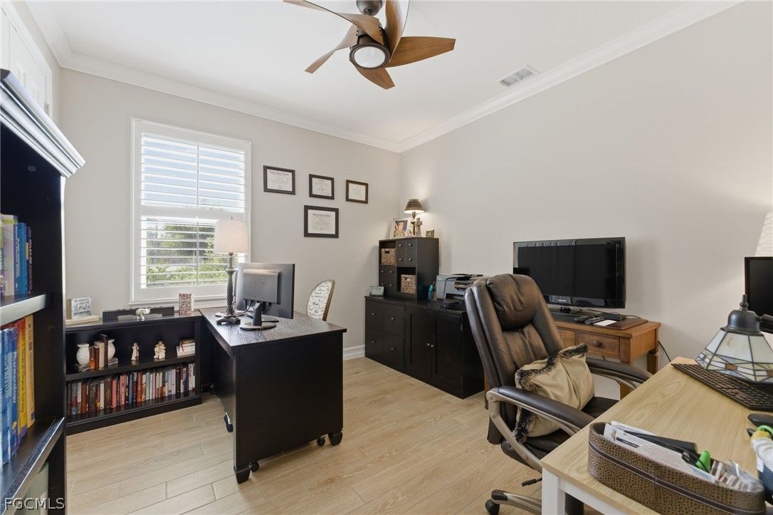 WATER & GOLF VIEWS highlight this beautifully maintained 4-bedroom, 2-bath residence ideally positioned on a cul-de-sac lot in the gated community of Magnolia Landing in North Fort Myers. With no neighboring homes on one side, the setting offers a spacious and open feel while showcasing expansive views of the water and golf course. This move-in ready home combines thoughtful upgrades with a comfortable layout designed for relaxed Florida living. Inside, the home features gorgeous plank tile flooring throughout, crown molding, custom real wood plantation shutters, upgraded lighting with dimmer switches, and a calming coastal palette that creates an inviting and welcoming atmosphere. The open-concept design allows natural light to fill the living spaces while highlighting the scenic views beyond. The spacious primary suite includes two custom walk-in closets and an ensuite bath with a double-bowl vanity and frameless glass shower. A sliding door separates the guest bedrooms and bath, creating a private suite ideal for visiting family or guests. Custom closets and pantry organization provide excellent storage throughout the home, and the laundry room includes an added sink and cabinetry for convenience. Outdoor living is equally impressive with a large, screened lanai featuring added electrical and custom ceiling fans, creating the perfect space to relax and enjoy the water and golf course views. The home features impact windows and doors along with electric and manual storm protection on the lanai, offering valuable peace of mind during storm season. Additional enhancements include decorative landscape curbing, sidewalk pavers on both sides of the home, upgraded exterior lighting, a screened front entry, and a black aluminum fenced yard with landscape hedge. The garage is a standout feature offering an epoxy-finished floor, overhead storage systems, mini-split A/C, additional insulation, generator hook-up, and a whole-home surge protector—creating a functional and comfortable workspace. Located in the highly desirable Magnolia Landing gated golf community, residents enjoy resort-style amenities including a clubhouse with dining, fitness center, resort and lap pools, pickleball, bocce ball, shuffleboard, and a full calendar of social activities. Golf is optional with membership or pay-as-you-play availability. Exceptional views, extensive upgrades, and a premier cul-de-sac location make this home a standout opportunity in Magnolia Landing. The seller is willing to rent back.