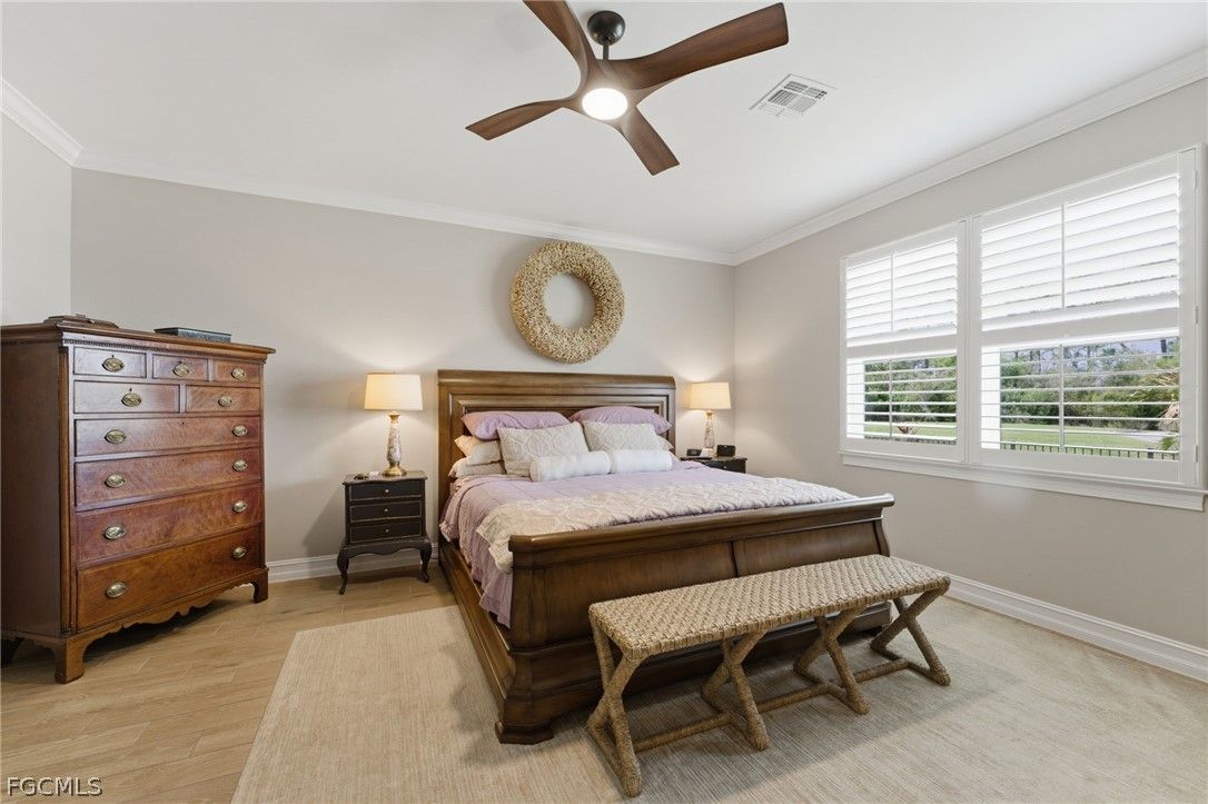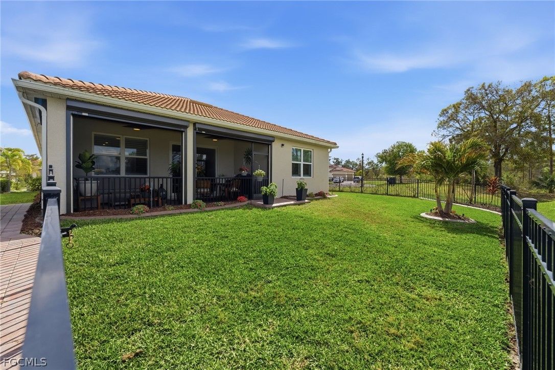 WATER & GOLF VIEWS highlight this beautifully maintained 4-bedroom, 2-bath residence ideally positioned on a cul-de-sac lot in the gated community of Magnolia Landing in North Fort Myers. With no neighboring homes on one side, the setting offers a spacious and open feel while showcasing expansive views of the water and golf course. This move-in ready home combines thoughtful upgrades with a comfortable layout designed for relaxed Florida living. Inside, the home features gorgeous plank tile flooring throughout, crown molding, custom real wood plantation shutters, upgraded lighting with dimmer switches, and a calming coastal palette that creates an inviting and welcoming atmosphere. The open-concept design allows natural light to fill the living spaces while highlighting the scenic views beyond. The spacious primary suite includes two custom walk-in closets and an ensuite bath with a double-bowl vanity and frameless glass shower. A sliding door separates the guest bedrooms and bath, creating a private suite ideal for visiting family or guests. Custom closets and pantry organization provide excellent storage throughout the home, and the laundry room includes an added sink and cabinetry for convenience. Outdoor living is equally impressive with a large, screened lanai featuring added electrical and custom ceiling fans, creating the perfect space to relax and enjoy the water and golf course views. The home features impact windows and doors along with electric and manual storm protection on the lanai, offering valuable peace of mind during storm season. Additional enhancements include decorative landscape curbing, sidewalk pavers on both sides of the home, upgraded exterior lighting, a screened front entry, and a black aluminum fenced yard with landscape hedge. The garage is a standout feature offering an epoxy-finished floor, overhead storage systems, mini-split A/C, additional insulation, generator hook-up, and a whole-home surge protector—creating a functional and comfortable workspace. Located in the highly desirable Magnolia Landing gated golf community, residents enjoy resort-style amenities including a clubhouse with dining, fitness center, resort and lap pools, pickleball, bocce ball, shuffleboard, and a full calendar of social activities. Golf is optional with membership or pay-as-you-play availability. Exceptional views, extensive upgrades, and a premier cul-de-sac location make this home a standout opportunity in Magnolia Landing. Per current FEMA mapping and available seller documentation, property is presently designated Flood Zone X; buyer to independently verify all flood zone, lender, and insurance requirements. The seller is willing to rent back.