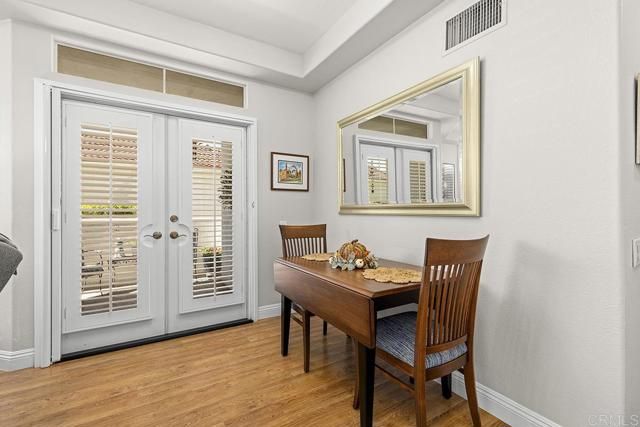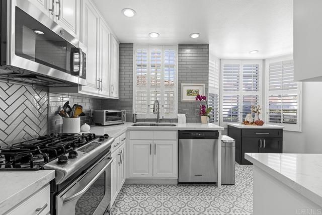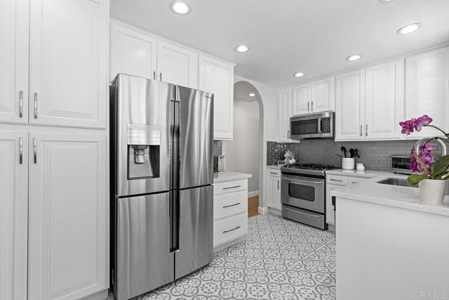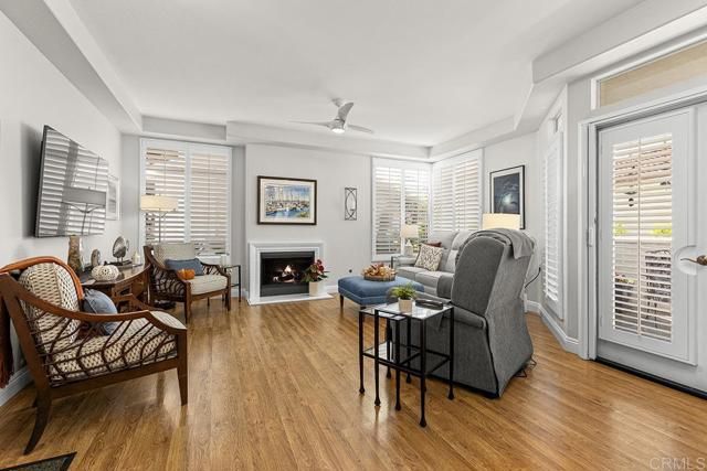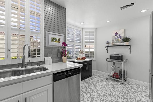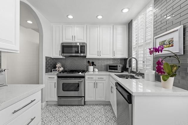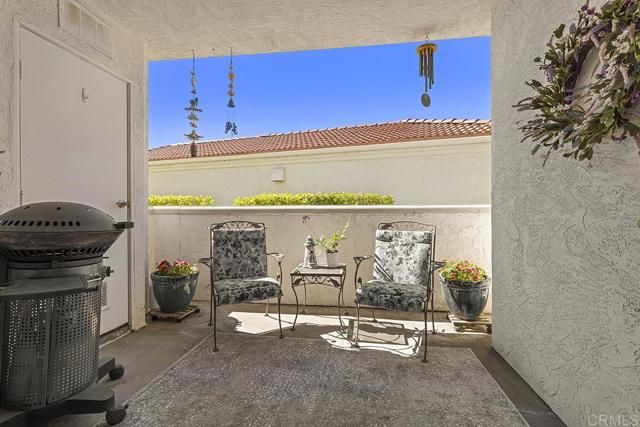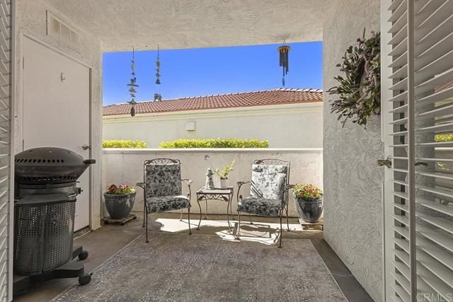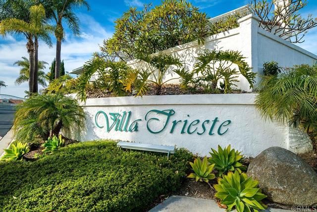 Beautifully and highly upgraded turnkey two bedroom and two bathroom condo with two outdoor patios off the living room and primary bedroom and perfectly located on first level of the desirable 55+ gated community of Villa Trieste. You'll be impressed with designer upgrades, custom paint colors and high-end finishes throughout. Both the kitchen and the bathrooms have been recently completely updated with custom tile, quartz countertops, new appliances and glass tile backsplash. The master bathroom is handicap assessable with roll in shower. Enjoy a whole home water filtration system, a newer A/C unit and heater, and hot water tank. Wood plantation shutters on all of the numerous windows throughout, ceiling fans in each room, wood laminate flooring and recessed lighting. There is a mantled gas fireplace in the living room, a full size washer and dryer in the home and a one car garage with storage cabinets and a ceiling storage rack. An extra outdoor parking space comes with the property. Garage has a keypad automatic entry. Villa Triest portrays a coastal vibe with white-washed architecture, newly installed red tile roofs and meticulously maintained tropical landscaping and coastal breezes. The amenities include a clubhouse, pool, spa, picinic BBQ area, Bocce Ball Court and Gazebo.