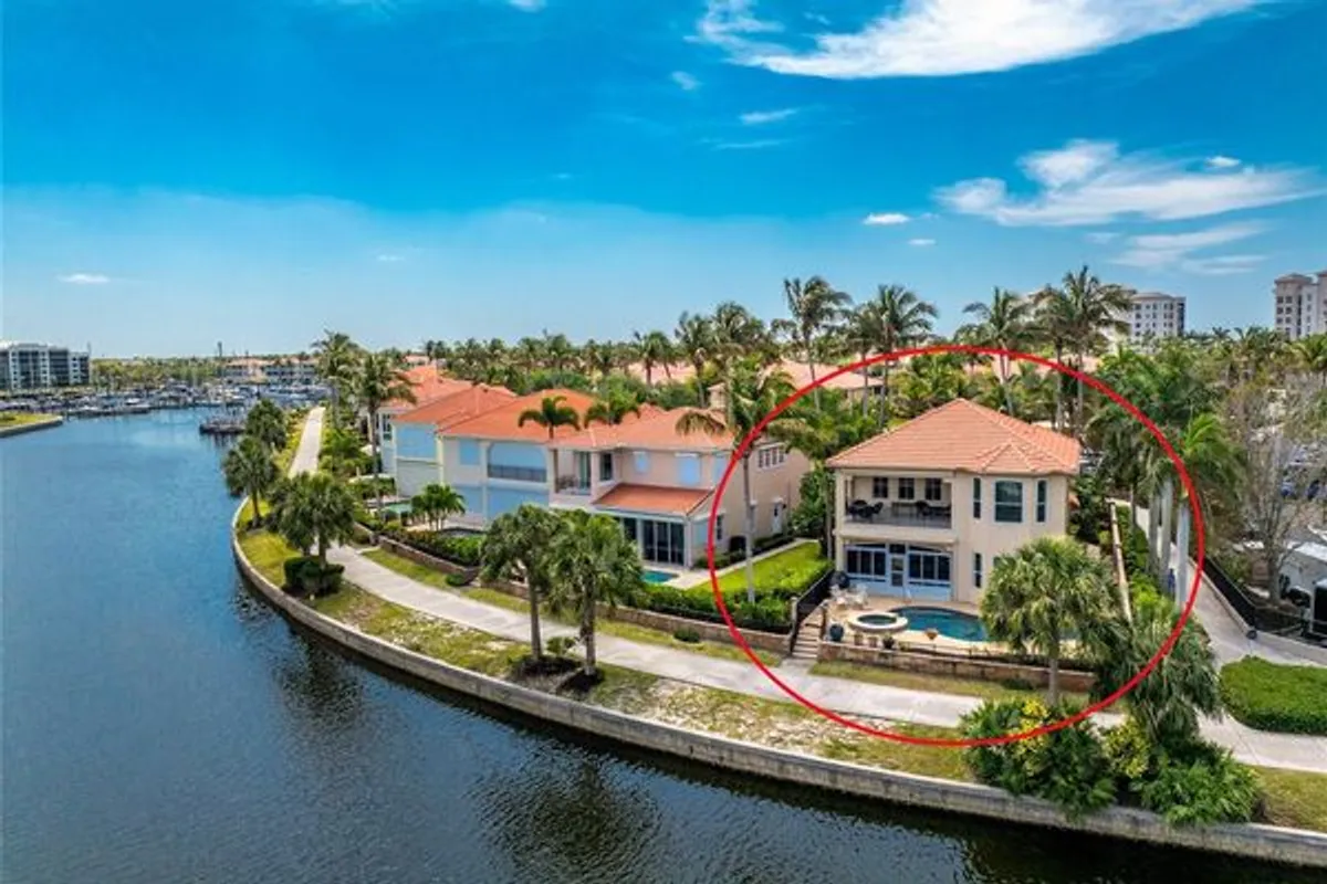 This beautifully updated waterfront pool home captures the essence of refined resort living. You will experience an incredible sense of arrival as you approach this gated waterfront peninsula flanked by majestic Royal Palm trees with live oak trees leading you home. A paver drive and pathway will welcome you through a charming entry courtyard and into a dramatic interior, where soaring two-story ceilings and abundant windows create an immediate sense of light and openness. Live your vacation everyday as you watch boats sailing by, people out for a morning jog, or for an evening stroll… and know you have landed in just the right place! Here you will be embraced by neighbors enjoying the best of what Burnt Store has to offer. This well maintained residence boasts pristine diamond-set tile flowing throughout the main living areas and a soft, cohesive palette carried throughout the home. At the heart of the home, the updated kitchen blends style and performance with new quartz countertops, a spacious center island with seating, and brand-new stainless steel appliances (2026), including a double conventional/convection wall oven, cooktop, and refrigerator. A sunlit dining nook overlooks the private courtyard, while the adjacent living and dining spaces rise two stories high, framing picturesque views of the pool and waterfront beyond. Crown molding adds a refined finishing touch to this space. The first-floor primary suite is a true retreat, privately positioned to capture tranquil water views and direct access to the enclosed lanai. A tray ceiling enhances the sense of space, while the ensuite bath features a walk-in closet, updated dual vanity with stone tops, a garden tub, and a glass-enclosed shower. A den or fourth bedroom and full bath - conveniently serving as a pool bath - complete the main level. Upstairs, two pleasing bedrooms and a full bath provide superb accommodations for guests. One oversized bedroom is a standout, featuring French doors, a built-in entertainment center/closet system, tray ceiling, and expansive windows overlooking the marina channel. Sliding doors open to a private, second-story lanai with new motorized storm screens—an ideal vantage point to unwind with a book while watching boats drift by. The other bedroom offers generously sized quarters…both with access to the updated bath with new shaker style vanity with quartz tops and tub/shower combo. The magnificent outdoor living space is sure to impress with a new expansive paver pool deck surrounding a freeform pool and spa, resurfaced with PebbleTec and updated coping in December 2023. The enclosed lanai, finished with tile and a summer kitchen, creates a seamless extension of the living space. Step directly onto the marina walking path right outside your back door for effortless access to the waterfront lifestyle. Additional upgrades provide peace of mind, including a NEW ROOF & soffits (2024), hurricane resistant garage door, impact-resistant windows (most-2023) and Kevlar electric roll-down screens on both upper and lower lanais—offering protection without compromising views.