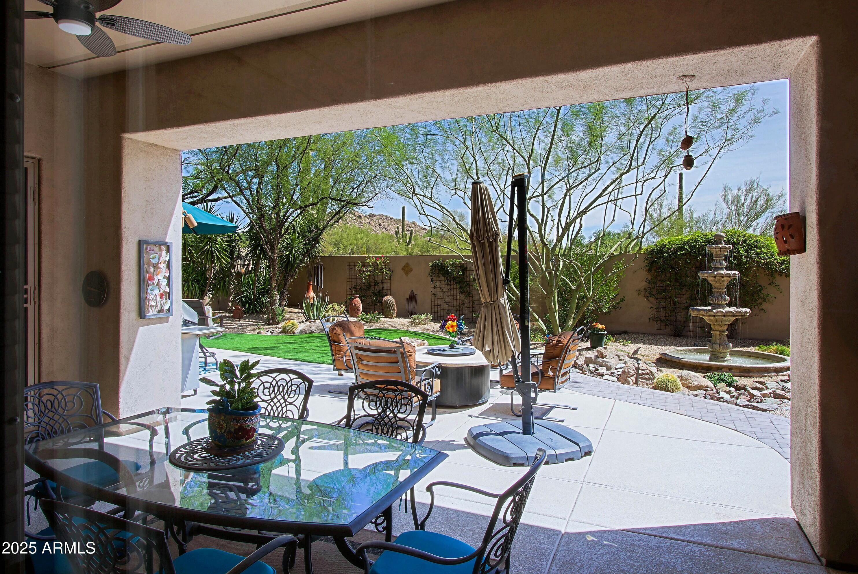 OWNED SOLAR!! Located in the guard gated golf community of Terravita, this beautiful home is sized just right and has welcoming curb appeal! Featuring 3 bedrooms, 2 full baths plus a powder room, and an office. Light and bright kitchen with white cabinetry and stunning black granite countertops. Stainless steel appliances and a wine fridge. Wood and stone floors, plantation shutters throughout and a gas fireplace. New exterior paint, water heater and dishwasher 2025. Primary suite with a sitting area features backyard access, separate tub and shower and a walk-in closet. The backyard is a delight with professional landscaping, soothing waterfall, fountain and covered patio for many happy times to enjoy! Must see virtual tour demonstrates what water and music can do to a backyard! Terravita is a lifestyle! Community amenities include country club dining, special events, beach entry pool, state of the art fitness center, tennis, pickle ball, walking trails and so much more! Golf memberships are separate and may be available for purchase.