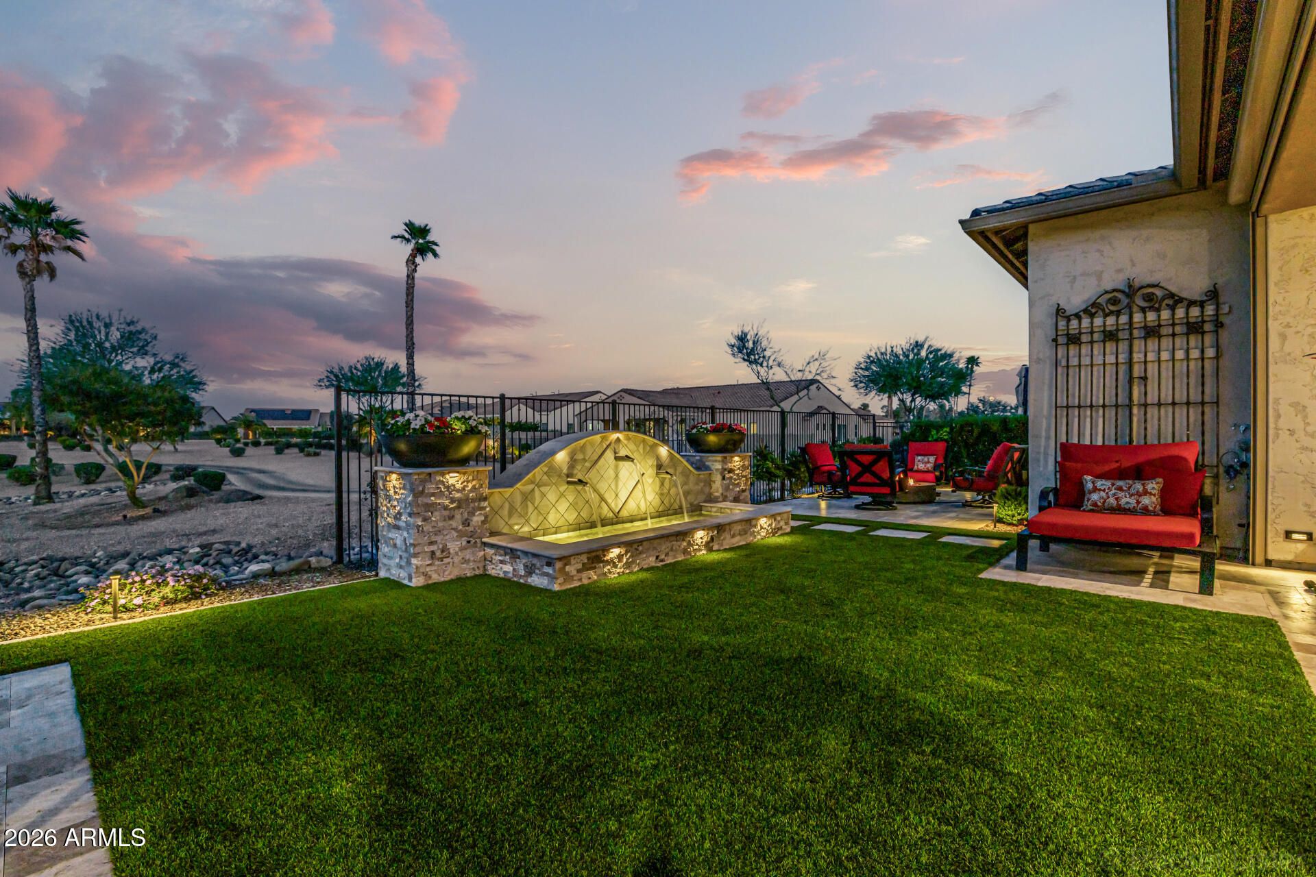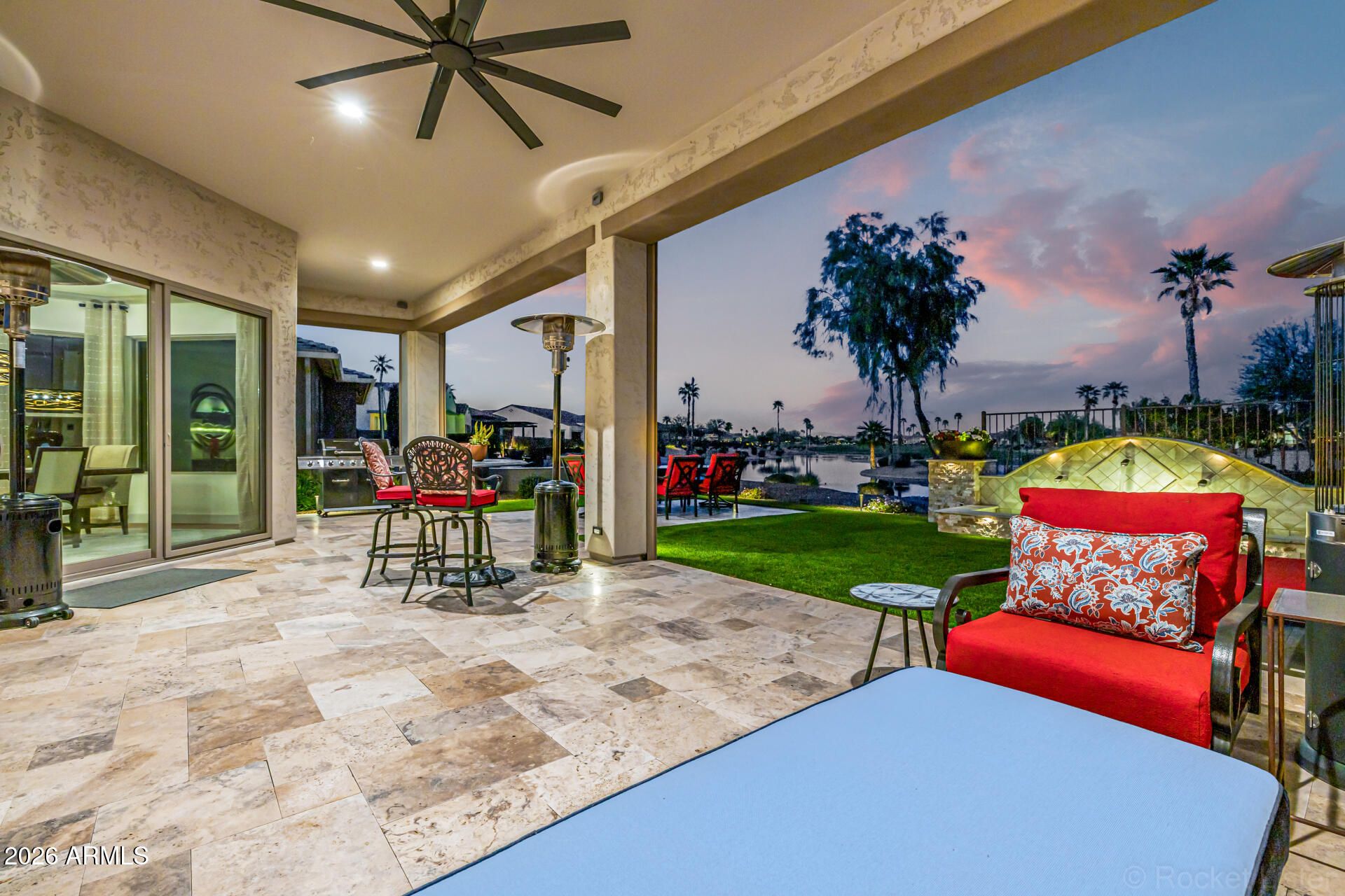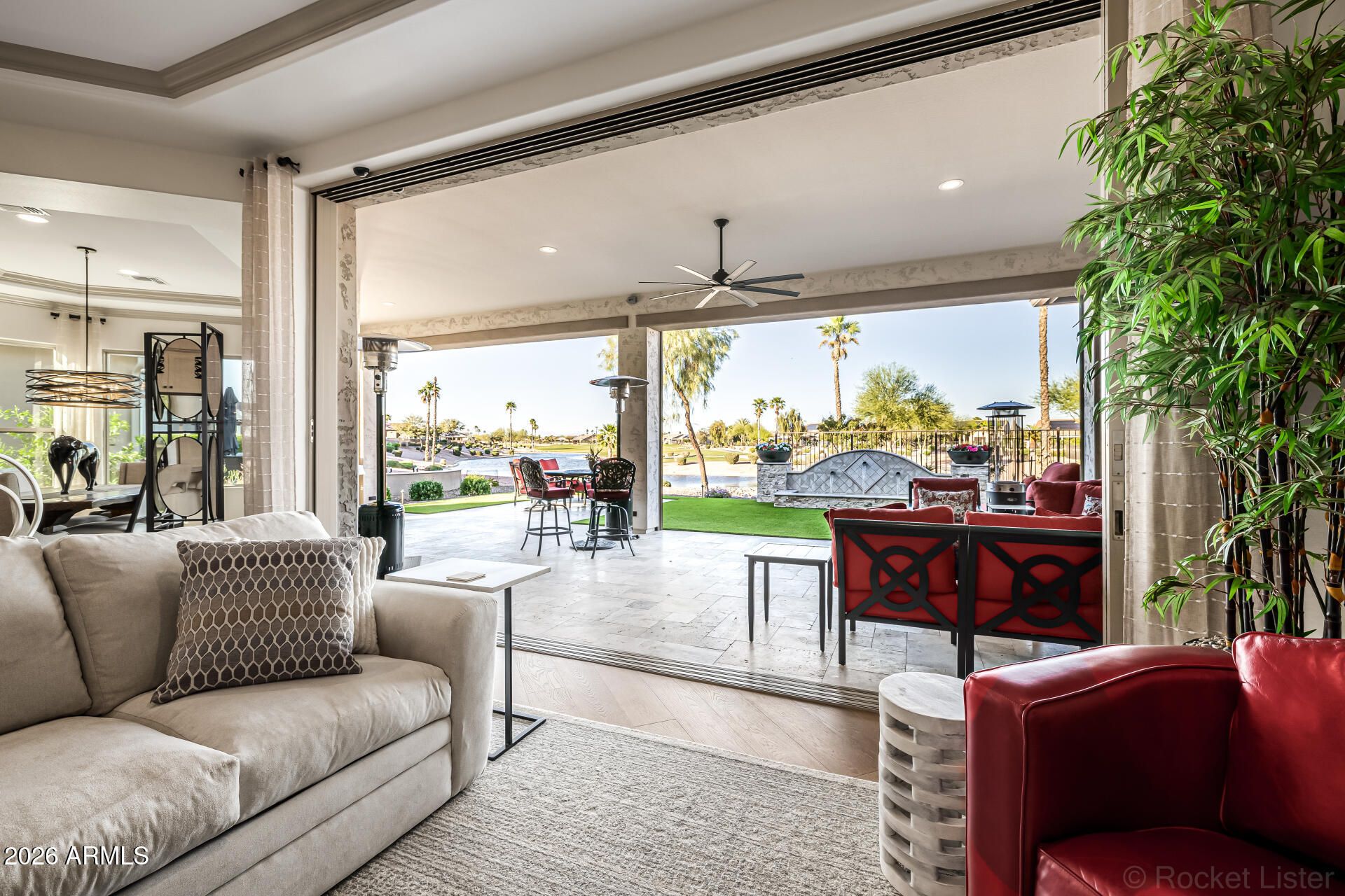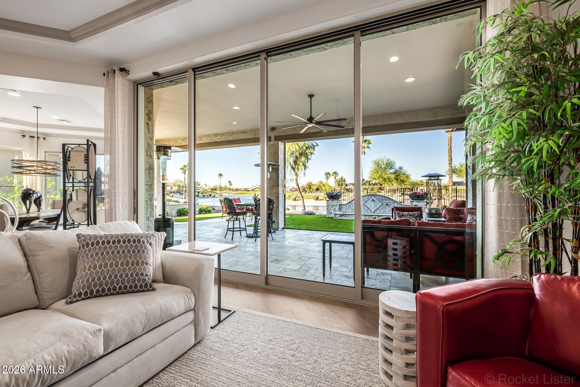 This masterpiece is the epitome of sophistication, elegance, and intentional design. No detail has been overlooked and no expense spared in this stunning Solstice model, completed in 2024. Perfectly positioned to capture serene water and golf course views, the setting is as breathtaking as the home itself. From the moment you enter, the flawless design and refined finishes make an unforgettable impression. A dramatic motorized glass wall seamlessly merges indoor and outdoor living, creating the ultimate Arizona lifestyle experience and ideal for effortless entertaining. The private guest suite features its own sitting area, offering luxurious accommodations for visitors or serving perfectly as a mother-in-law suite. The replacement cost to replicate this exceptional property would far exceed its value today. Impeccably maintained and thoughtfully designed, this extraordinary residence is move-in ready and prepared to deliver the elevated lifestyle you've been dreaming of! Upgrades & Enhancements $293K in Builder Upgrades $365K Lot Premium $101K Professionally Designed Landscaping Air Conditioned Garage with Epoxy-Coated Concrete Floor Motorized Rear Patio Screens Designer Dimmers to Light Switches Under-Cabinet Lighting in Kitchen & Sitting Room Motorized Window Coverings Exterior Privacy Screens Custom Media Wall Featuring 84" Linear Fireplace Upgraded Ceiling Fans & Designer Light Fixtures Crown Molding Throughout Upgraded Water Softener System & Reverse Osmosis Jetted Tub with Fireplace in Main Suite