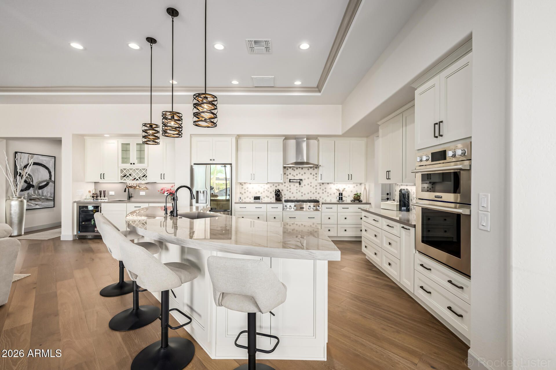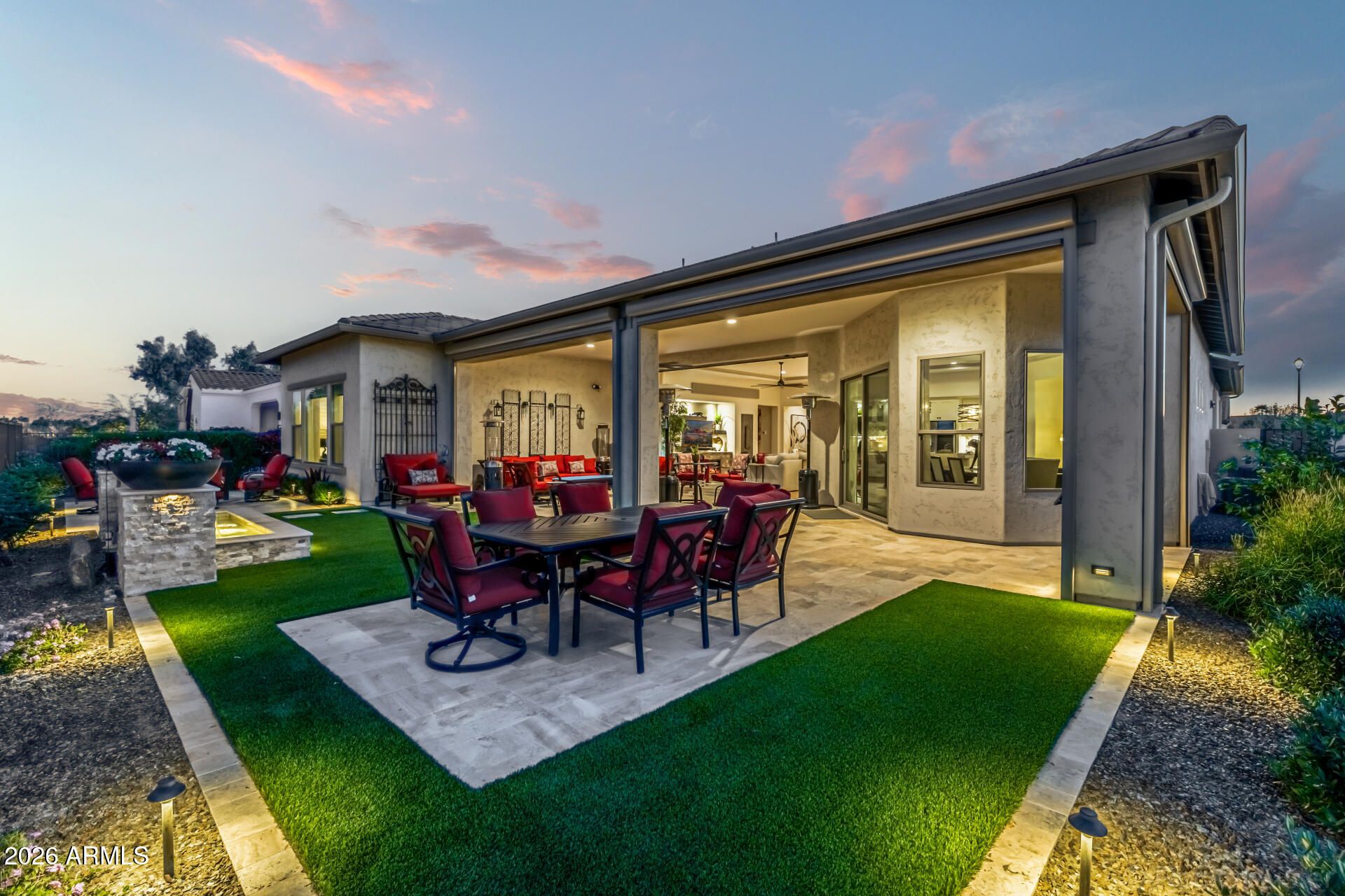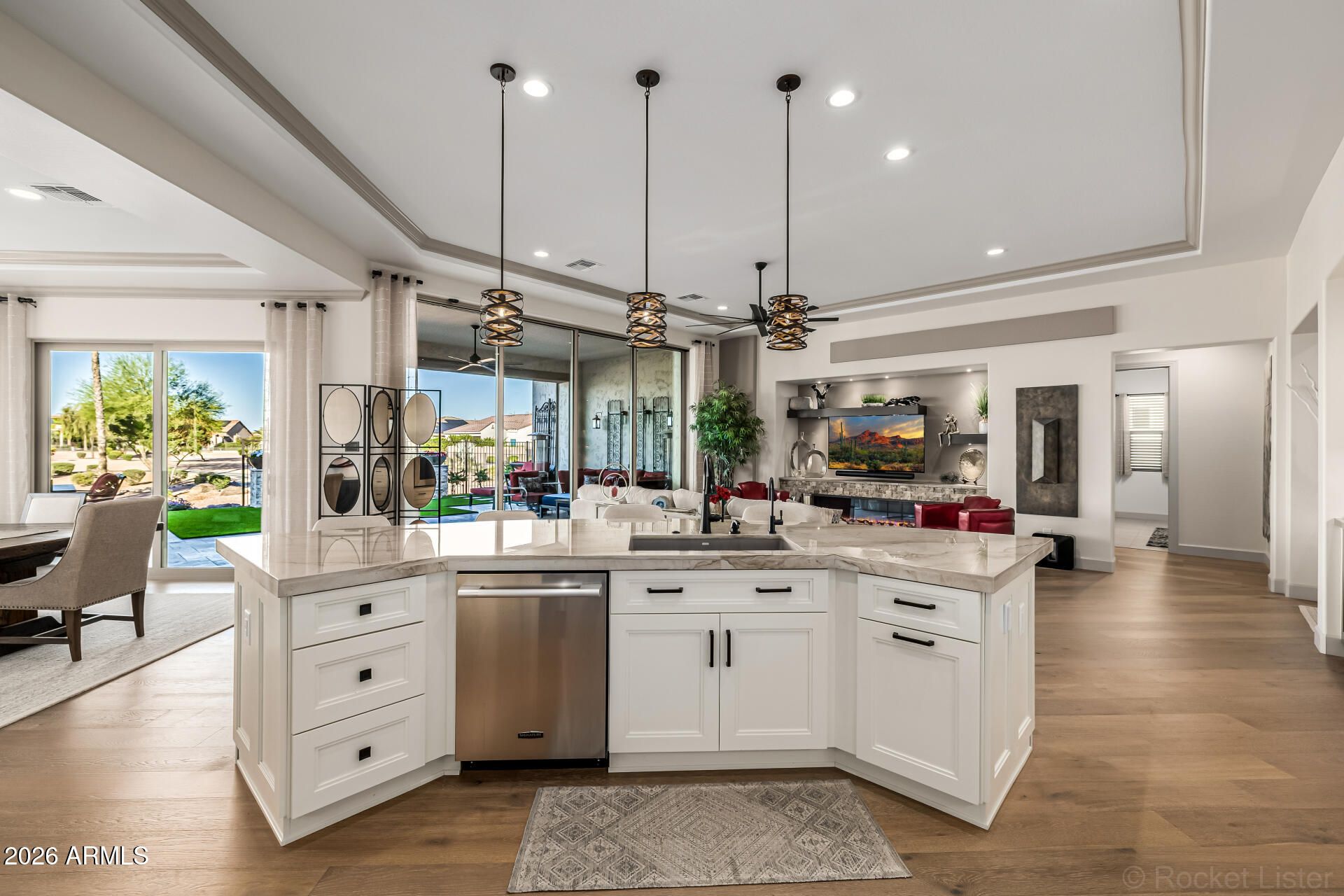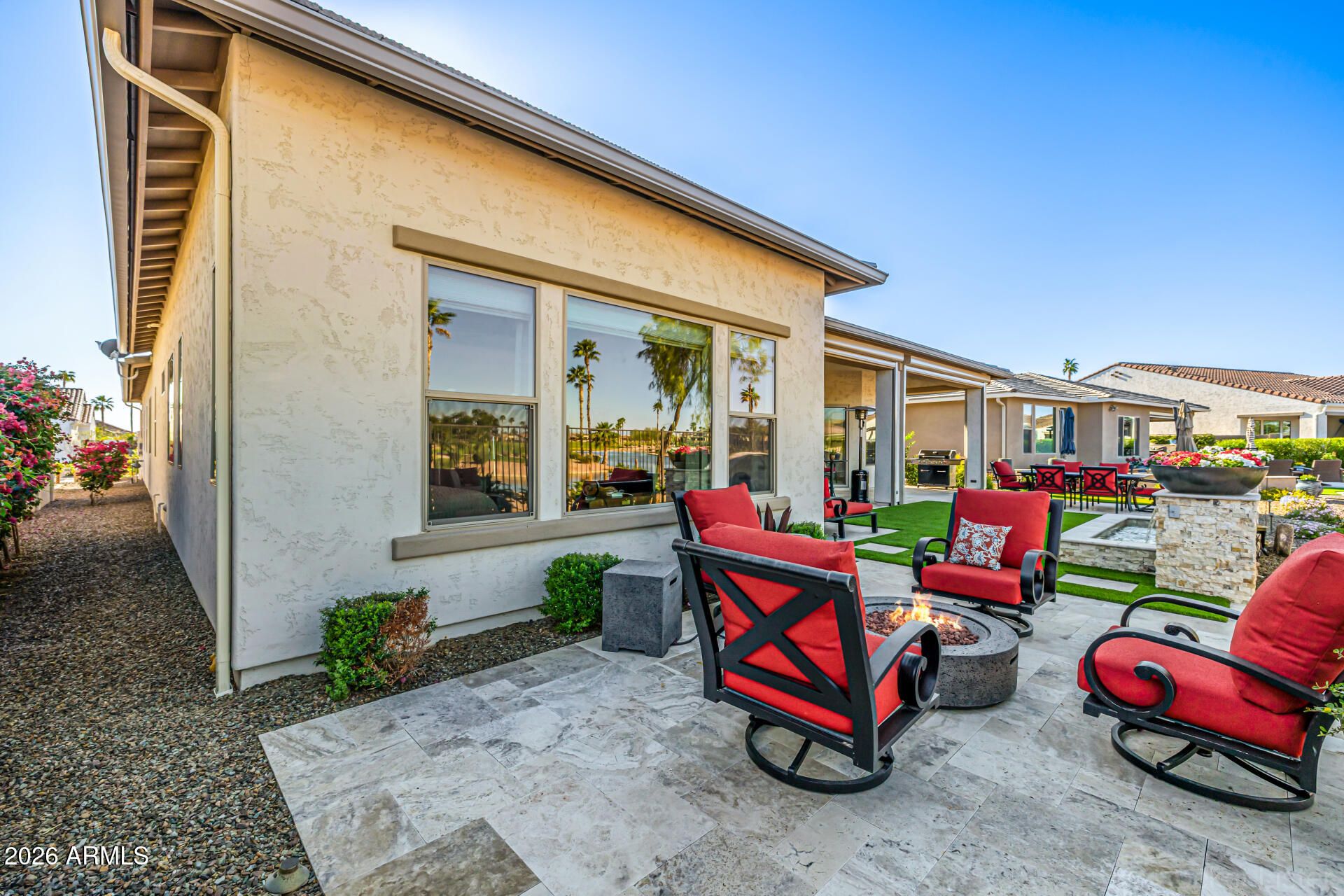 This masterpiece is the epitome of sophistication, elegance, and intentional design. No detail has been overlooked and no expense spared in this stunning Solstice model, completed in 2024. Perfectly positioned to capture serene water and golf course views, the setting is as breathtaking as the home itself. From the moment you enter, the flawless design and refined finishes make an unforgettable impression. A dramatic motorized glass wall seamlessly merges indoor and outdoor living, creating the ultimate Arizona lifestyle experience and ideal for effortless entertaining. The private guest suite features its own sitting area, offering luxurious accommodations for visitors or serving perfectly as a mother-in-law suite. The replacement cost to replicate this exceptional property would far exceed its value today. Impeccably maintained and thoughtfully designed, this extraordinary residence is move-in ready and prepared to deliver the elevated lifestyle you've been dreaming of! Upgrades & Enhancements $293K in Builder Upgrades $365K Lot Premium $101K Professionally Designed Landscaping Air Conditioned Garage with Epoxy-Coated Concrete Floor Motorized Rear Patio Screens Designer Dimmers to Light Switches Under-Cabinet Lighting in Kitchen & Sitting Room Motorized Window Coverings Exterior Privacy Screens Custom Media Wall Featuring 84" Linear Fireplace Upgraded Ceiling Fans & Designer Light Fixtures Crown Molding Throughout Upgraded Water Softener System & Reverse Osmosis Jetted Tub with Fireplace in Main Suite